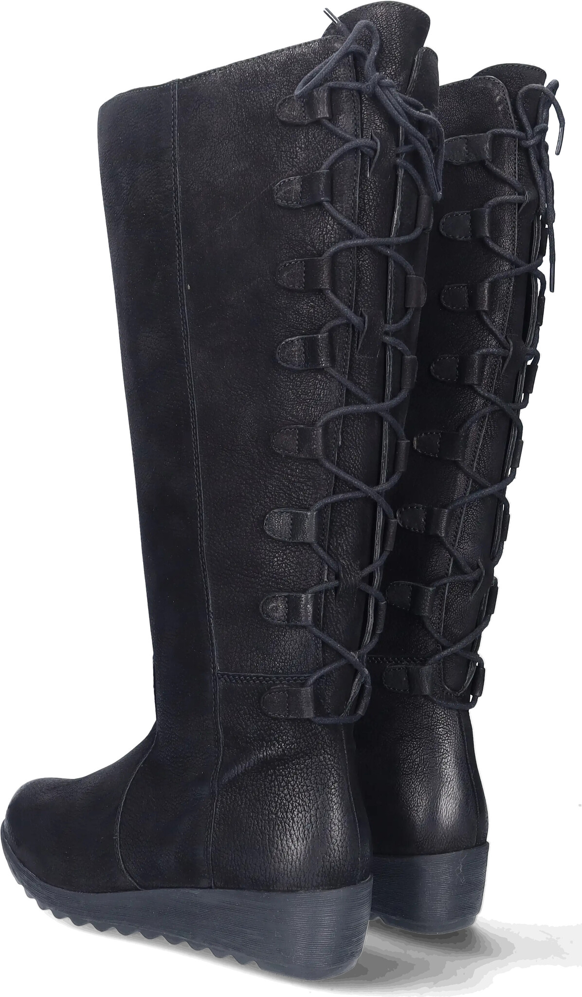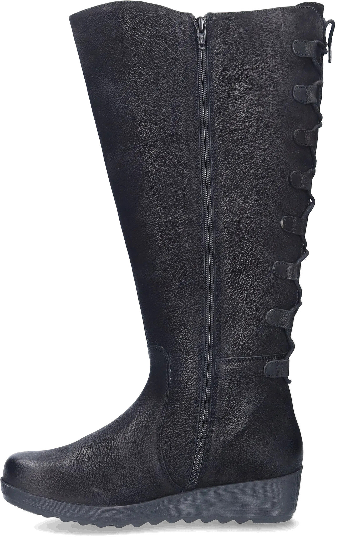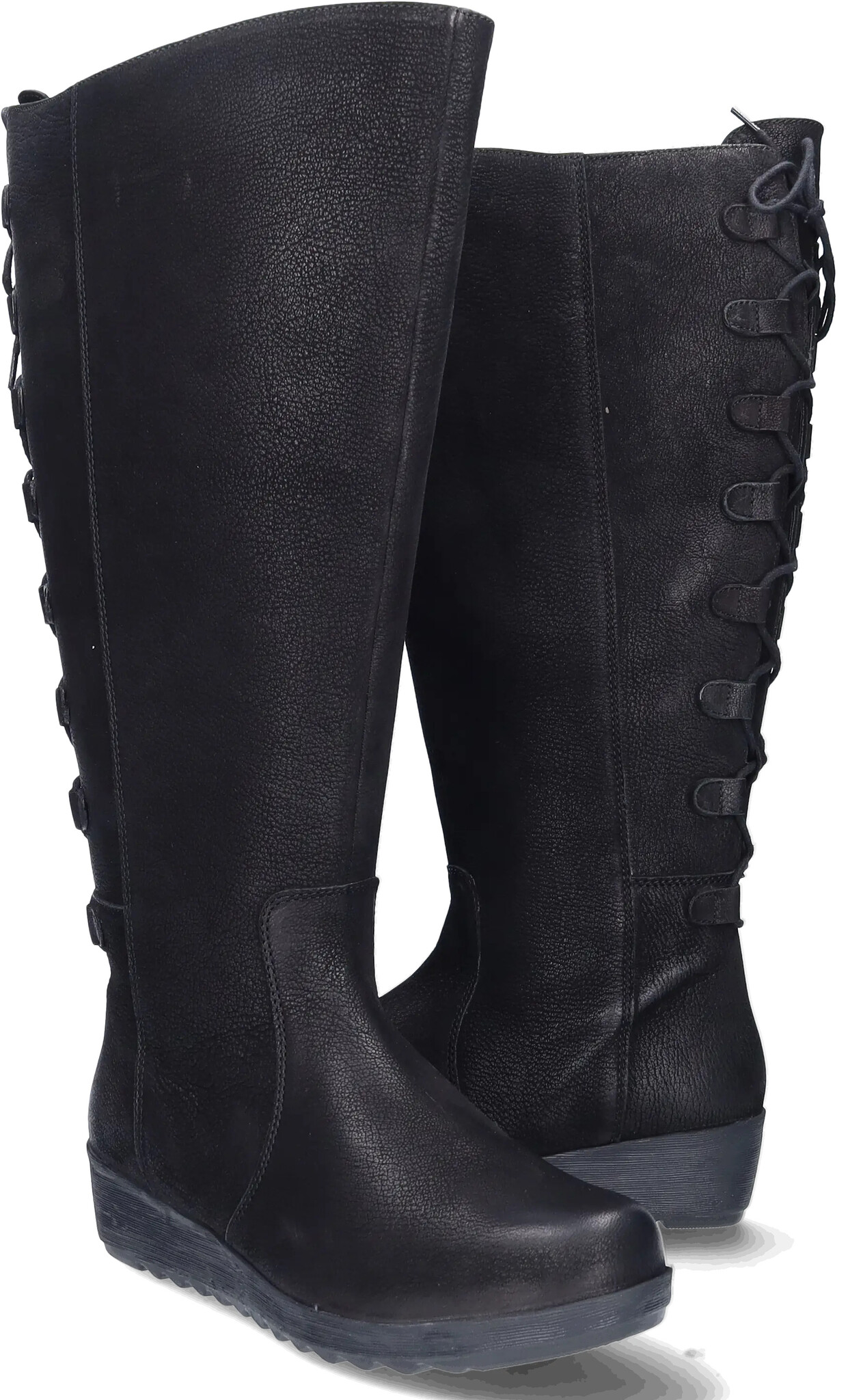 Der schwarze Akins ist ein schwarzer Weitschaftstiefel aus Leder mit Gummisohle, Reißverschluss und elastischen geflochtenen Schnürsenkeln hinten. Er ist für Einlagen geeignet.