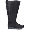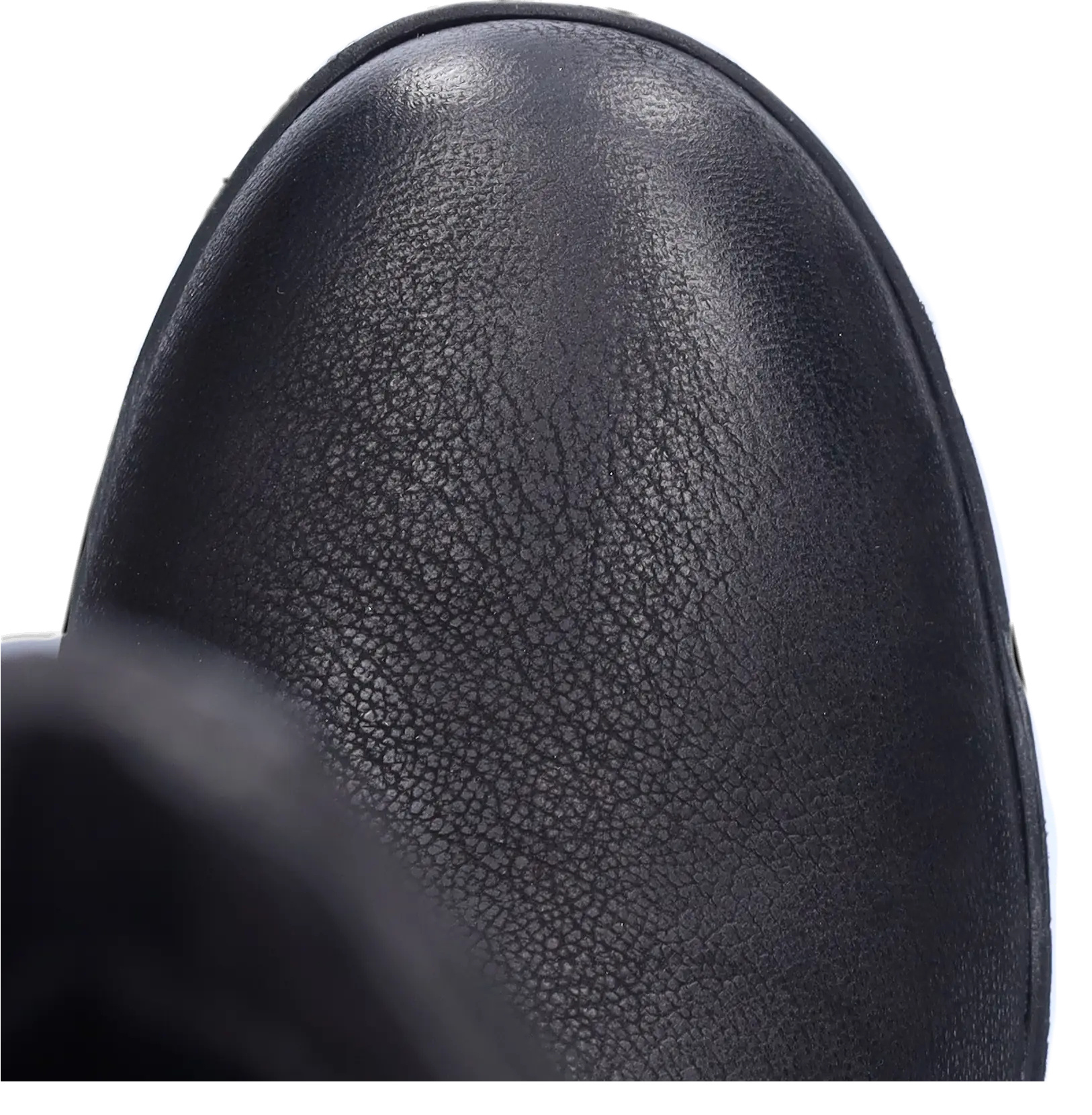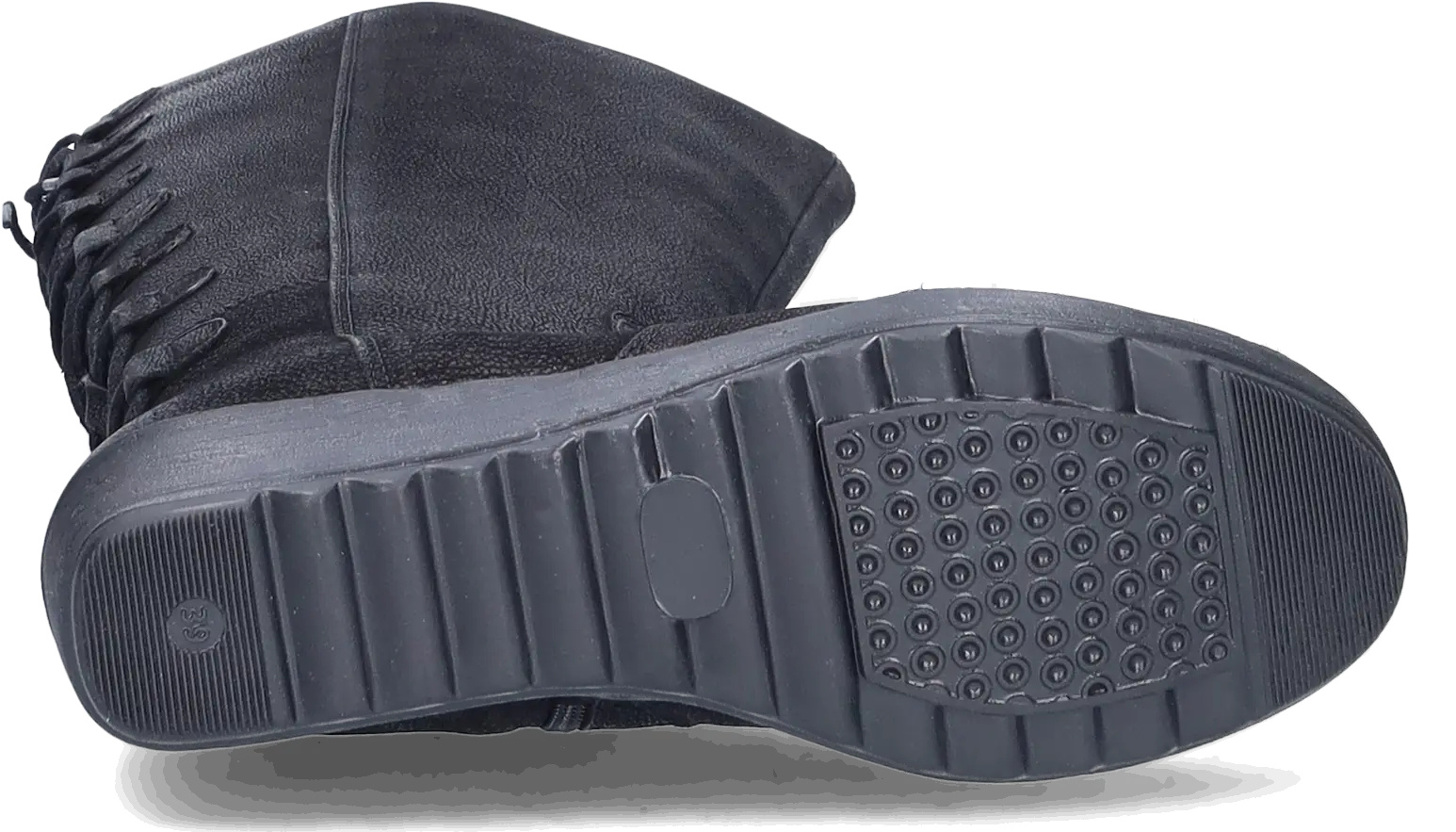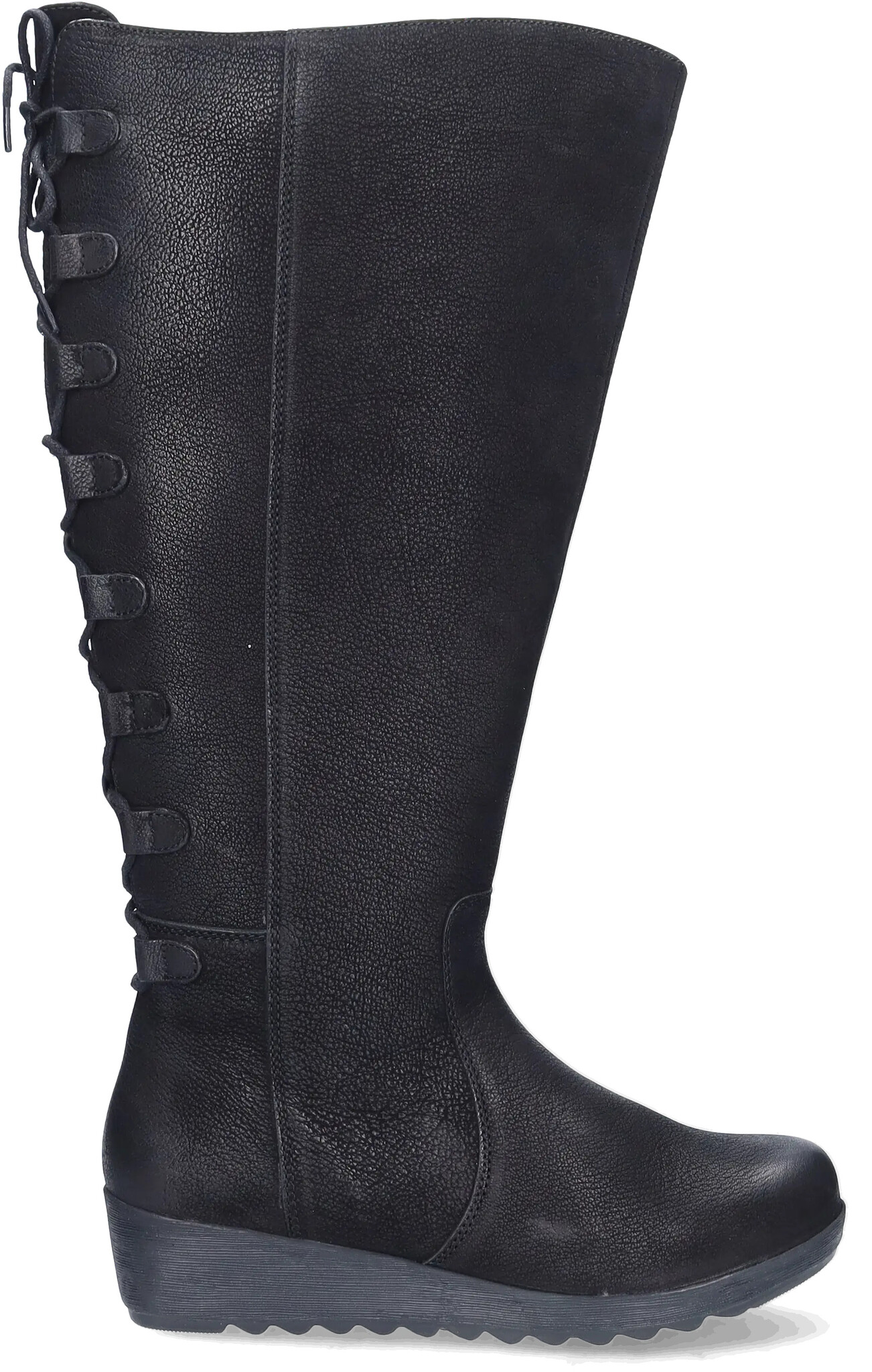Der schwarze Akins ist ein schwarzer Weitschaftstiefel aus Leder mit Gummisohle, Reißverschluss und elastischen geflochtenen Schnürsenkeln hinten. Er ist für Einlagen geeignet.