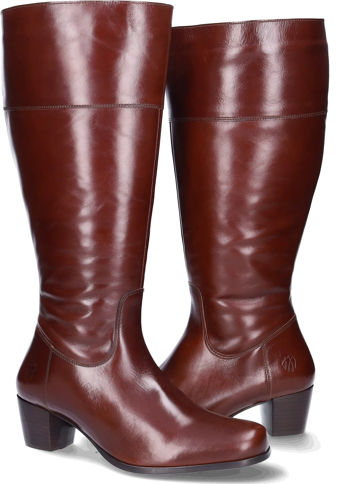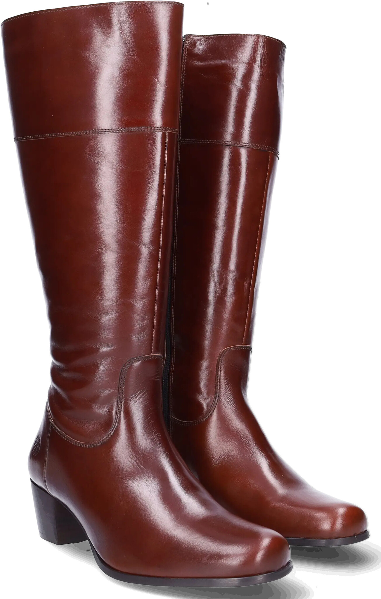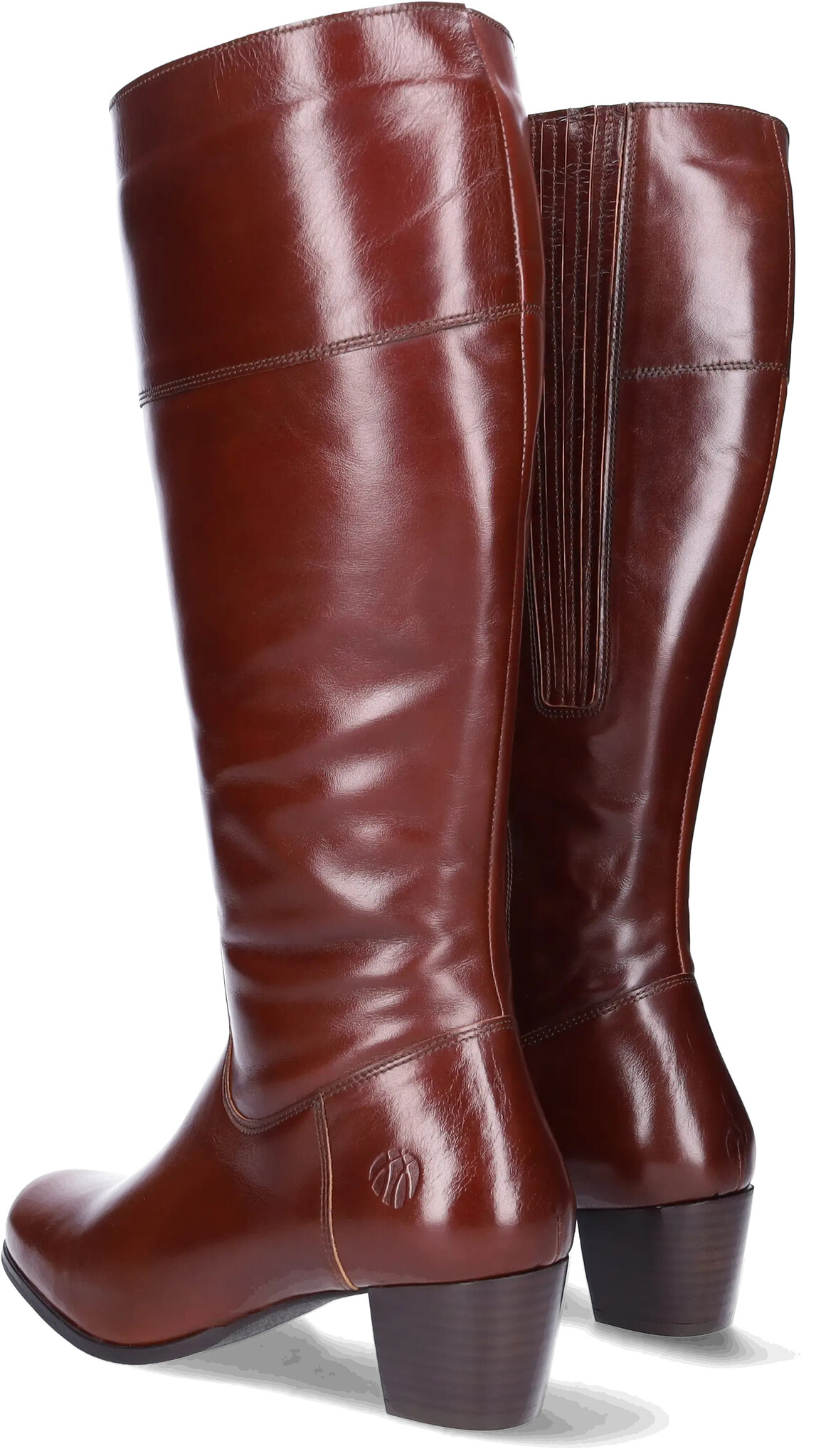 Der cognacfarbene Lederstiefel Ellon ist ein eleganter Weitschaftstiefel mit einem mittelhohen, femininen Absatz und einem praktischen Reißverschluss.