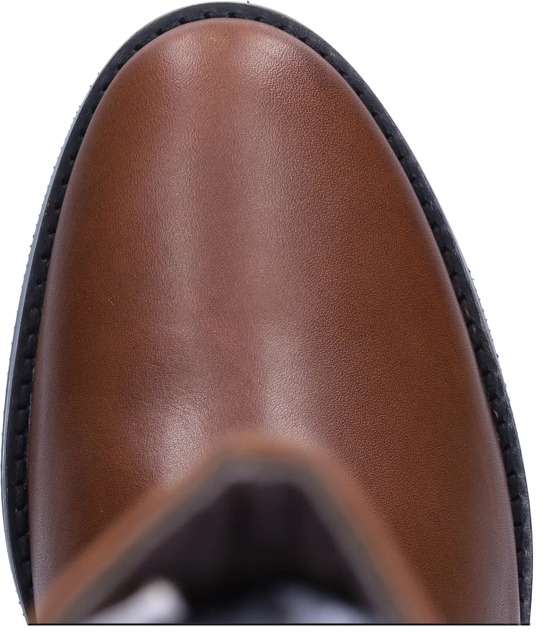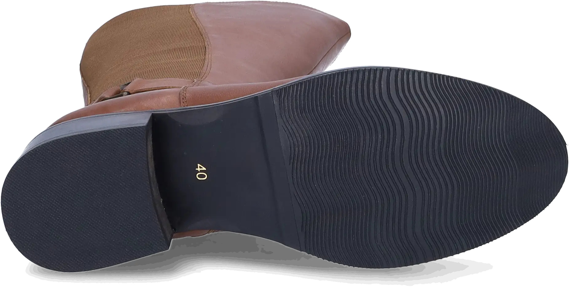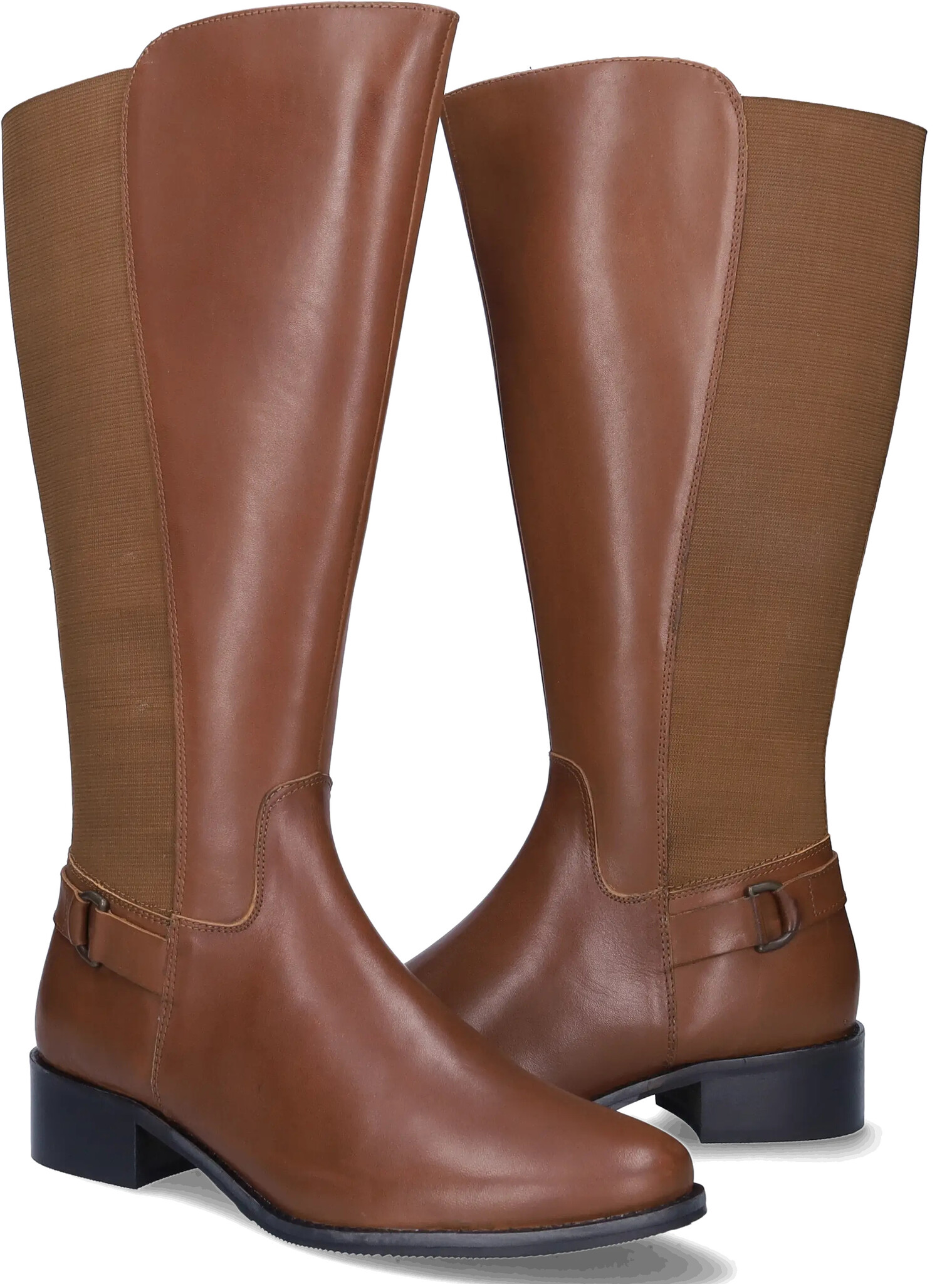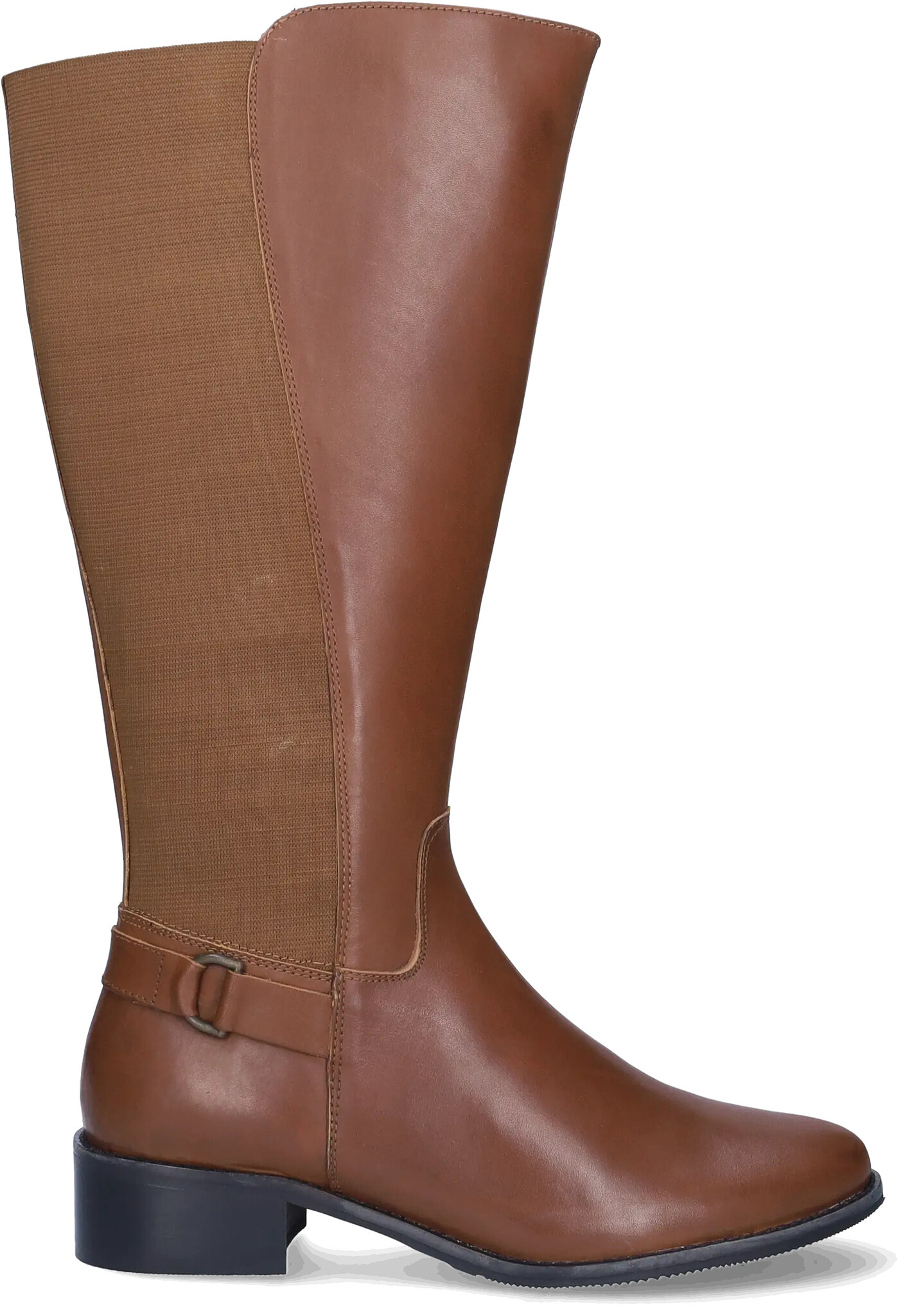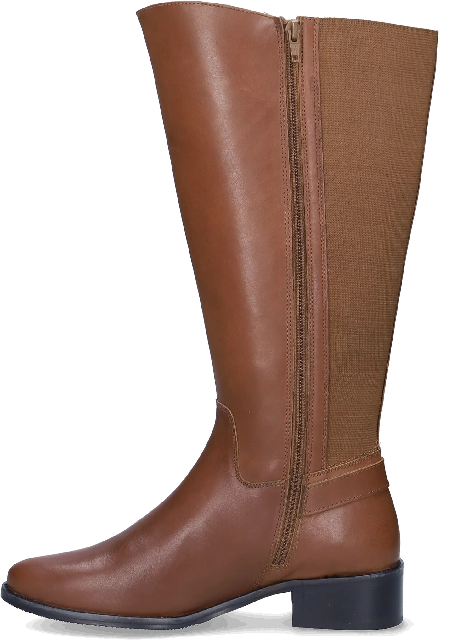 Erfurt ist ein cognacfarbener Leder Weitschaftstiefel mit einen Stretch-Einsatz hinten für zusätzliche Flexibilität und eine perfekte Passform. Außerdem ist der Erfurt mit einem niedrigen Absatz und einem Reißverschluss ausgestattet. Dieses Modell ist für das Tragen von Einlagen geeignet.