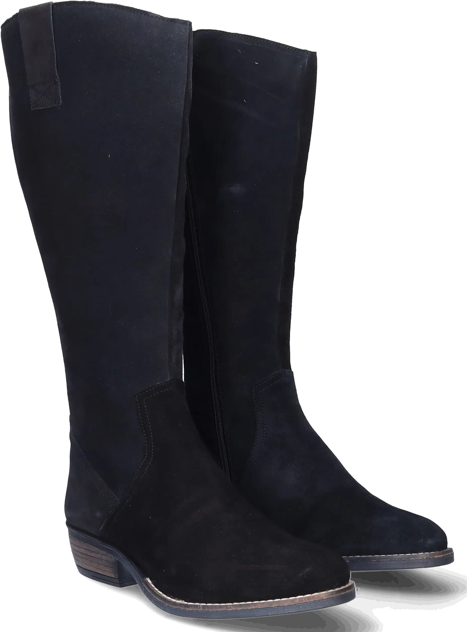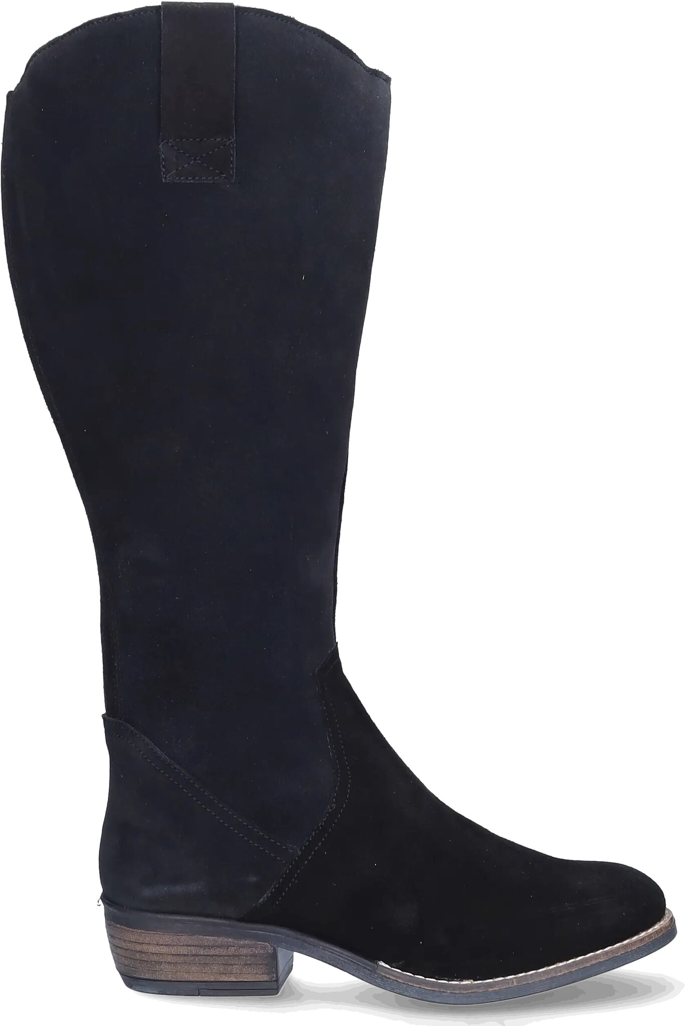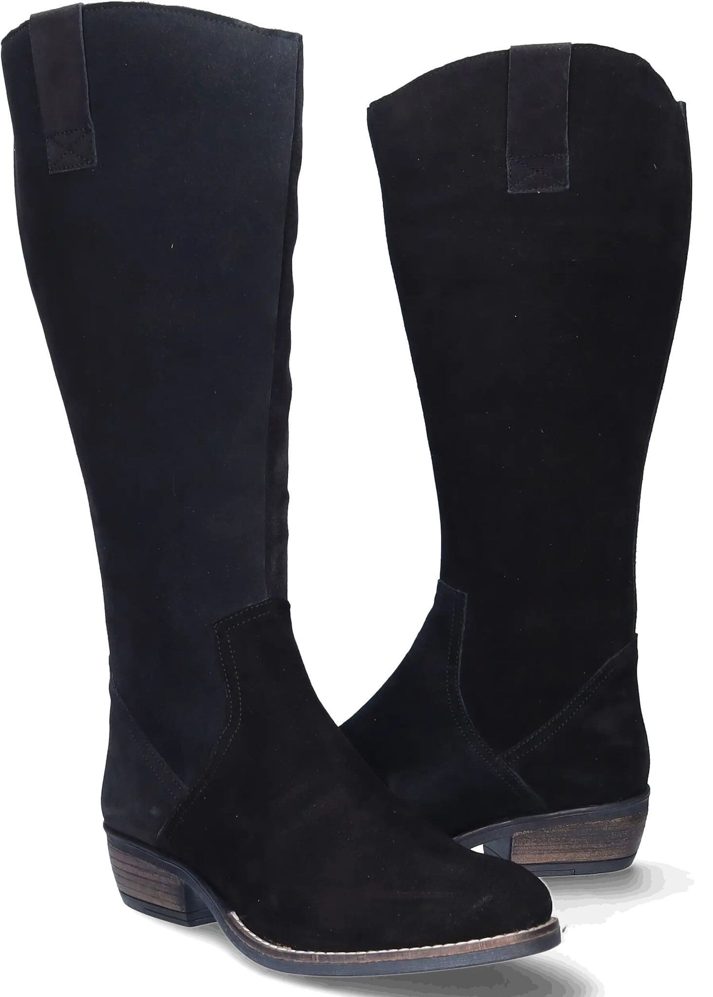 Ferryhill ist ein schwarzer Wildleder Weitschaftstiefel im Cowboystil, einem kubanischen Absatz, einem praktischen seitlichen Reißverschluss und einer spitzen Spitze. Die herausnehmbaren Einlegesohlen machen dieses Modell für das Tragen von orthopädischen Einlagen geeignet.