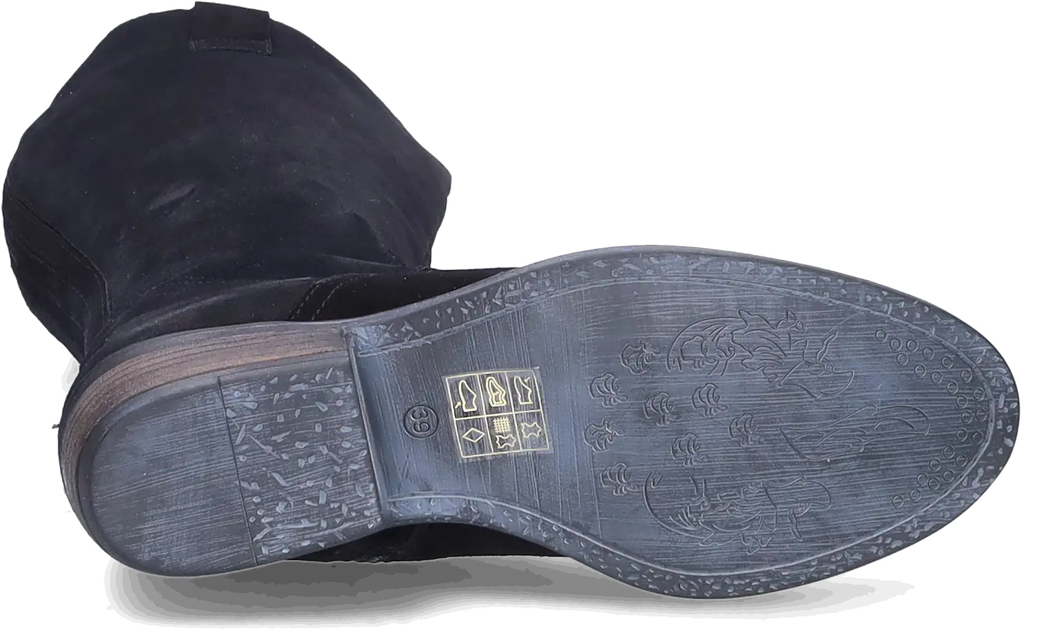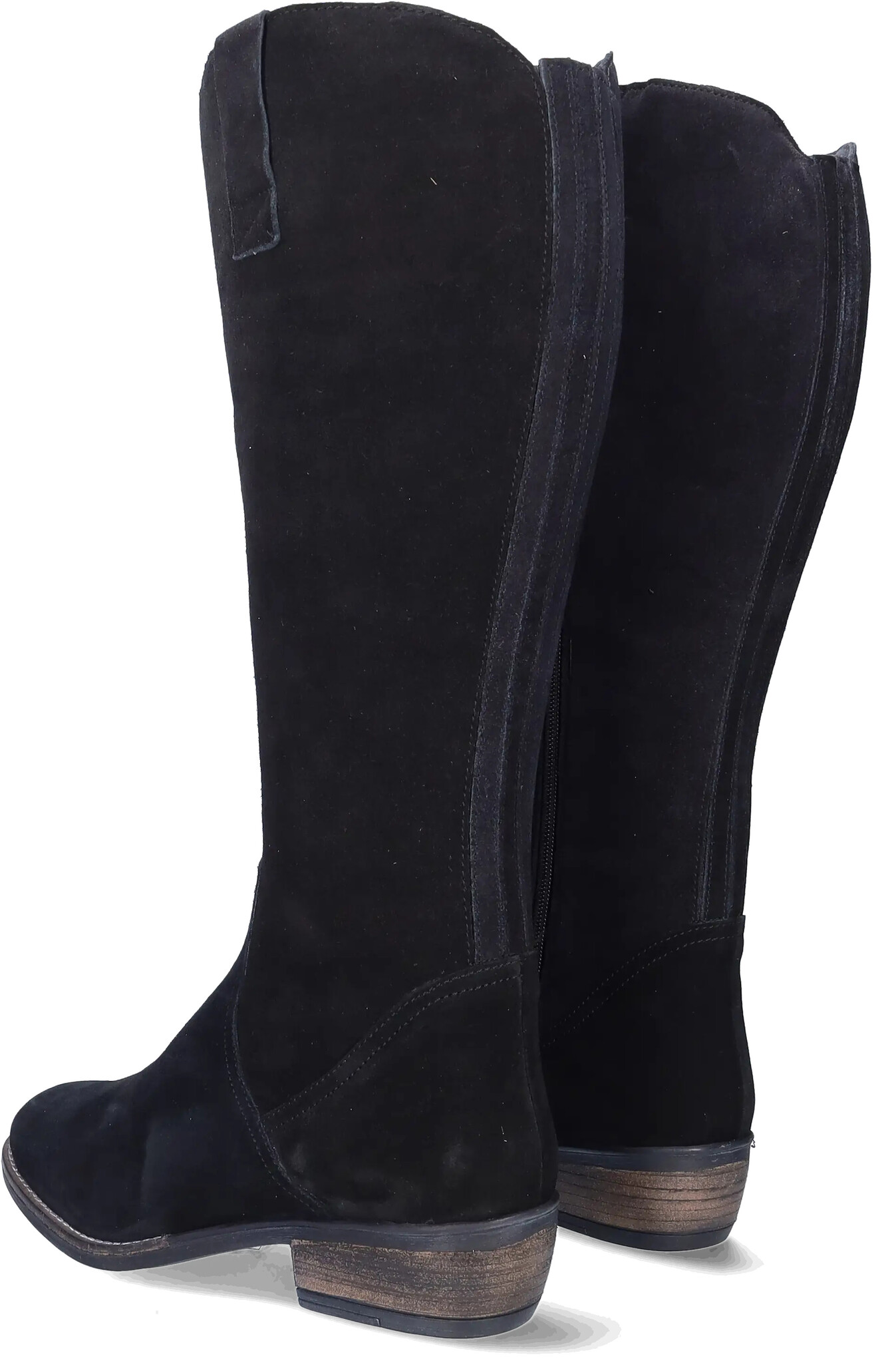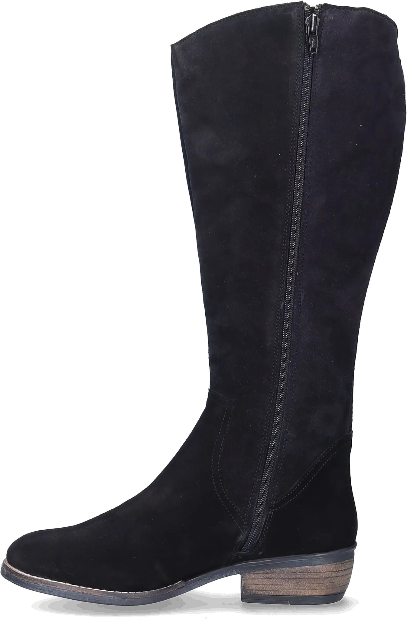 Ferryhill ist ein schwarzer Wildleder Weitschaftstiefel im Cowboystil, einem kubanischen Absatz, einem praktischen seitlichen Reißverschluss und einer spitzen Spitze. Die herausnehmbaren Einlegesohlen machen dieses Modell für das Tragen von orthopädischen Einlagen geeignet.