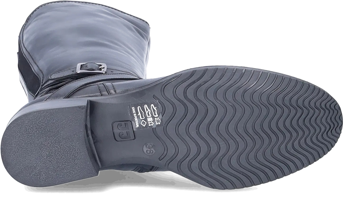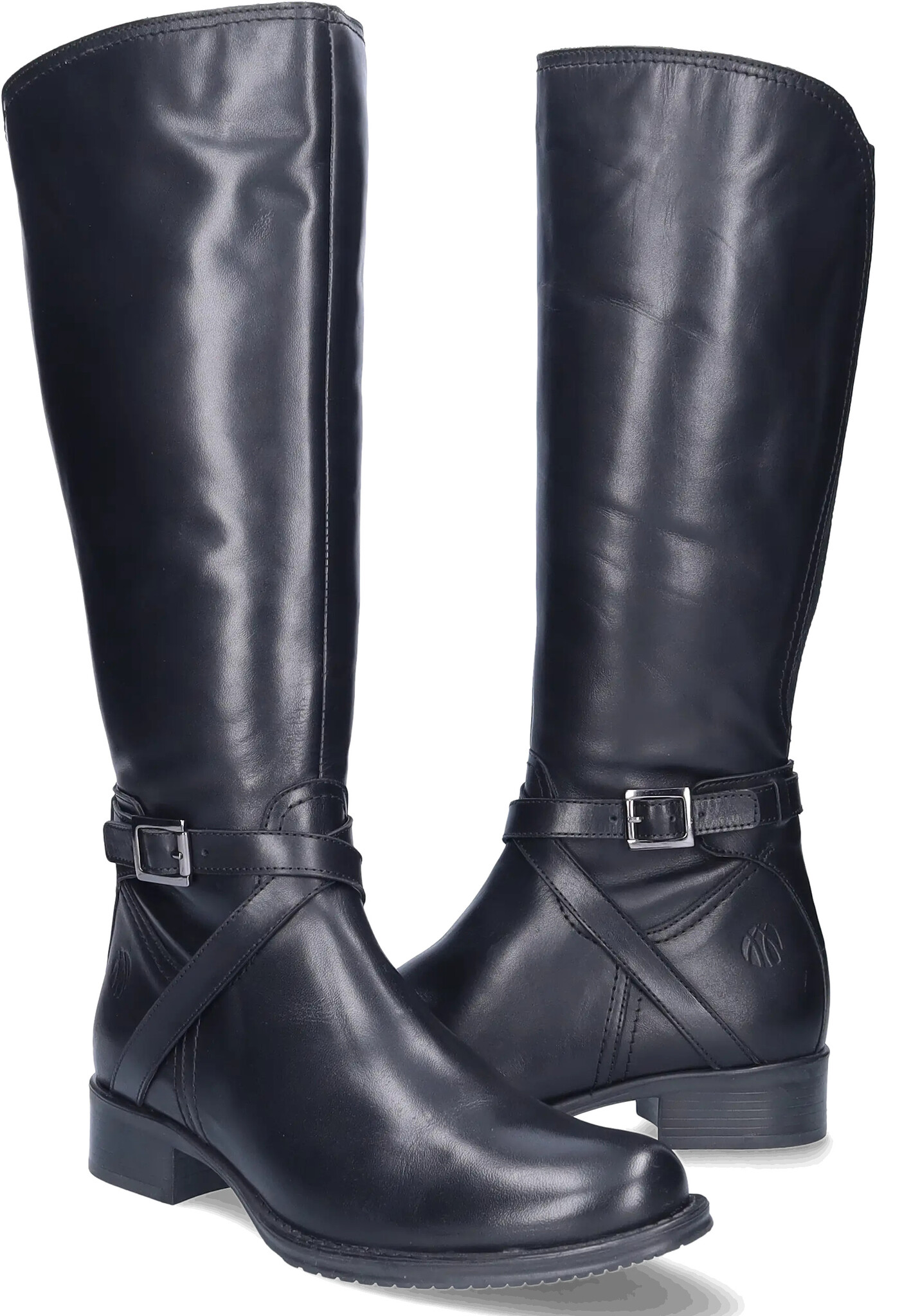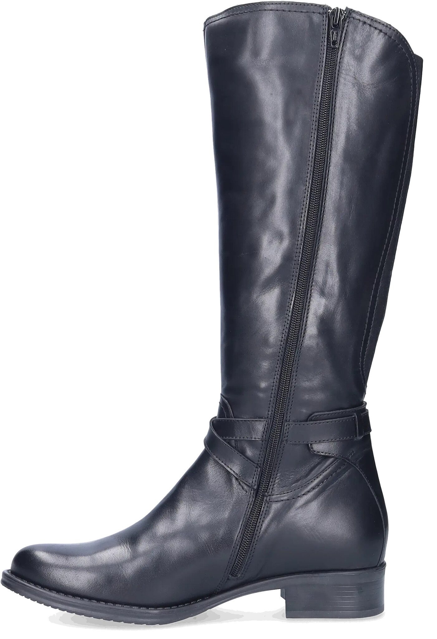 Melbourne ist ein schwarzer Leder Weitschaftstiefel, ausgestattet mit einem niedrigen Absatz. Der dezente Riemen und die Schnalle sorgen für eine elegante Optik. An der Rückseite sind zwei Gummibänder angebracht, die dafür sorgen, dass der Stiefel gut am Bein anliegt und zusätzlichen Tragekomfort bietet. Die rutschfeste Sohle sorgt für zusätzlichen Halt, während das herausnehmbare Fußbett die Nutzung von Einlagen ermöglicht.