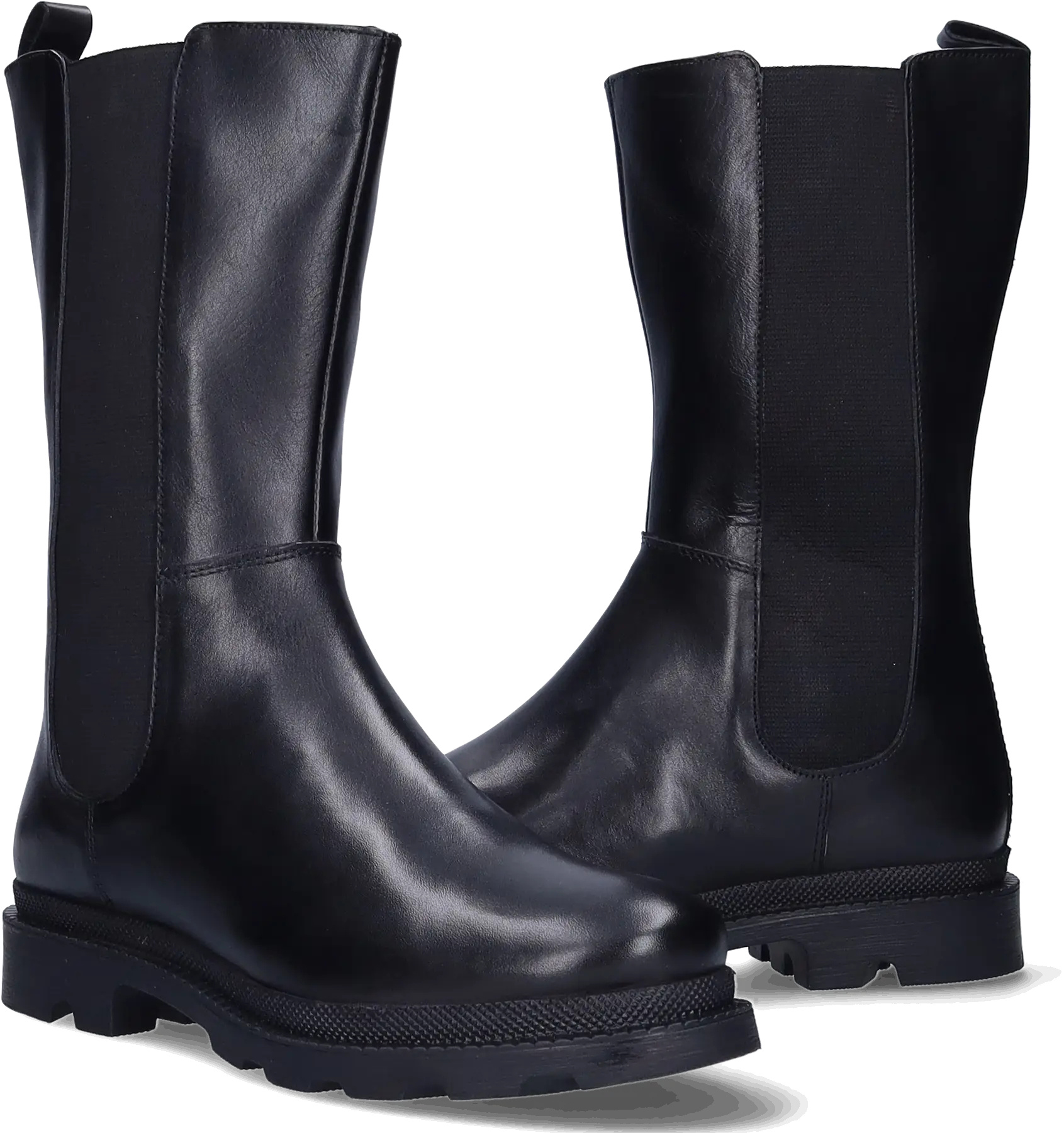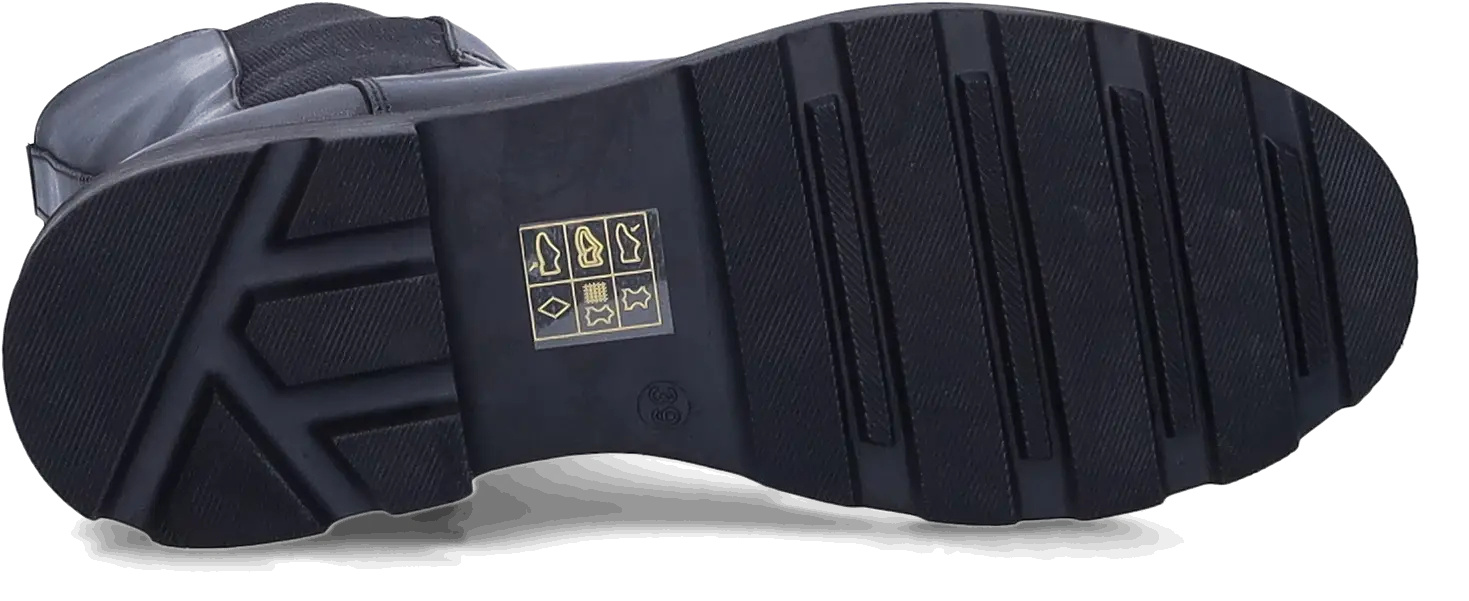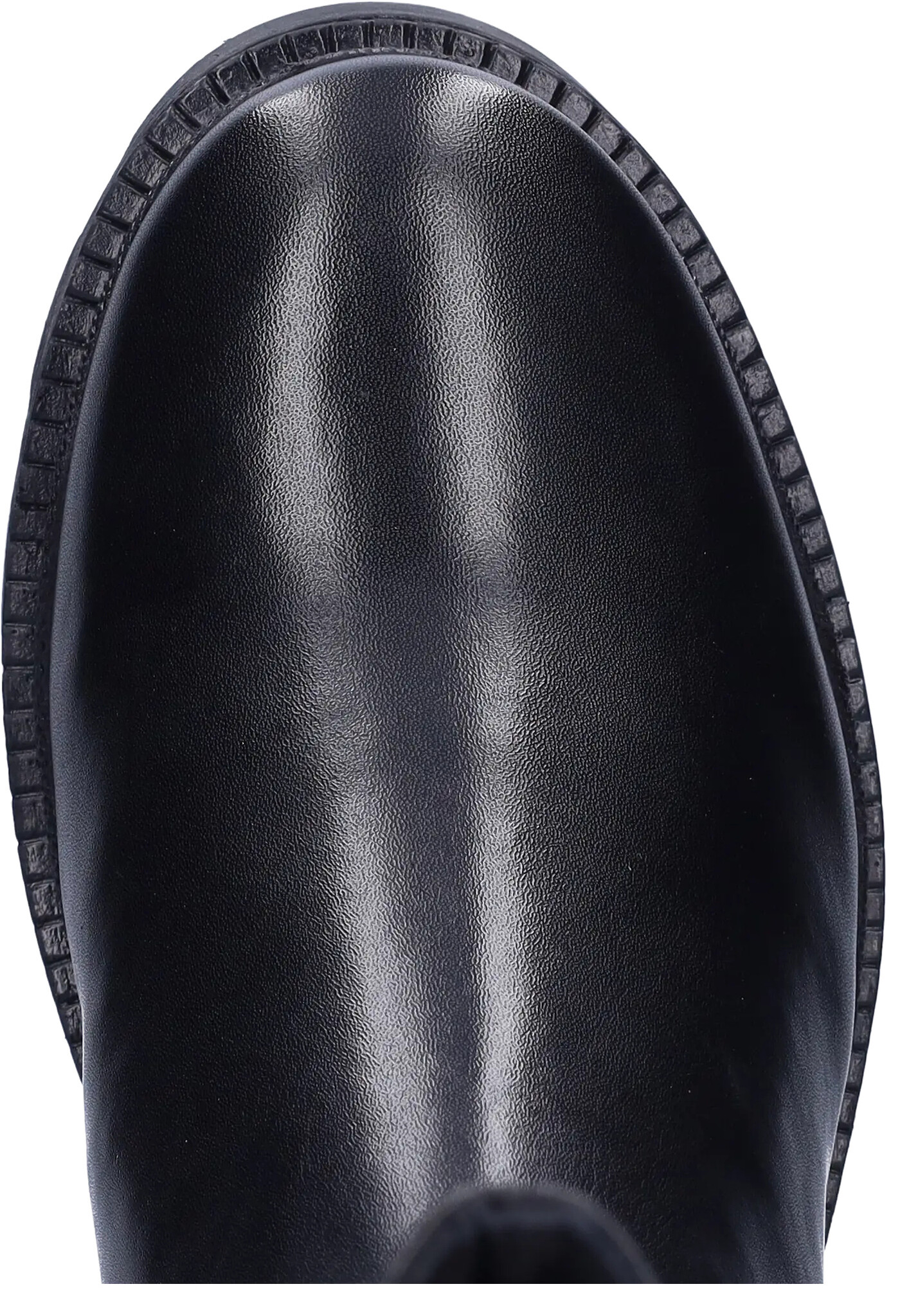 Neston ist ein schwarzer Leder-Weitschaftstiefel mit einem Stretch-Einsatz in der Mitte. Er hat einen niedrigen Absatz, einen Reißverschluss und eine Gummisohle. Dieses Modell ist für das Tragen von Einlagen geeignet.