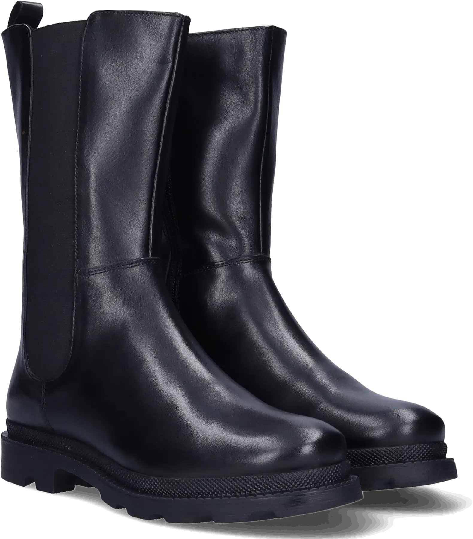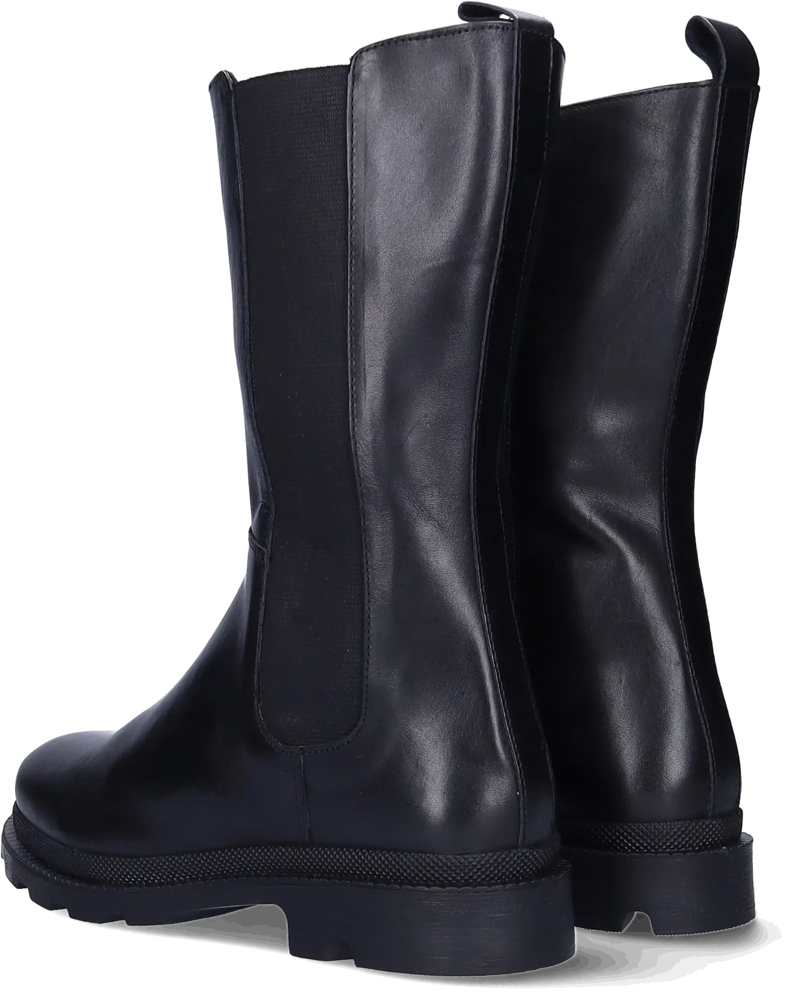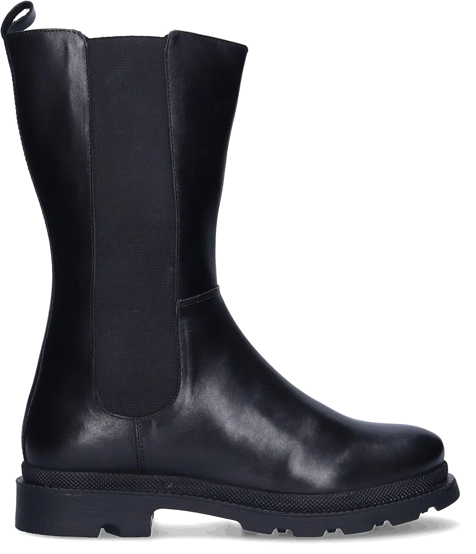 Neston ist ein schwarzer Leder-Weitschaftstiefel mit einem Stretch-Einsatz in der Mitte. Er hat einen niedrigen Absatz, einen Reißverschluss und eine Gummisohle. Dieses Modell ist für das Tragen von Einlagen geeignet.