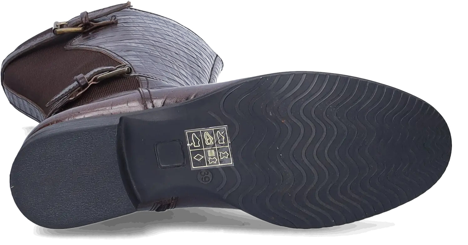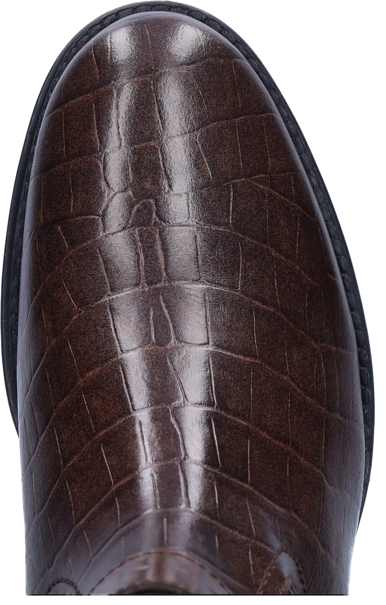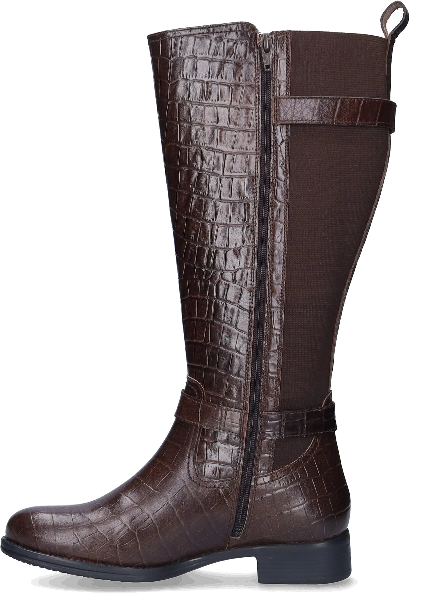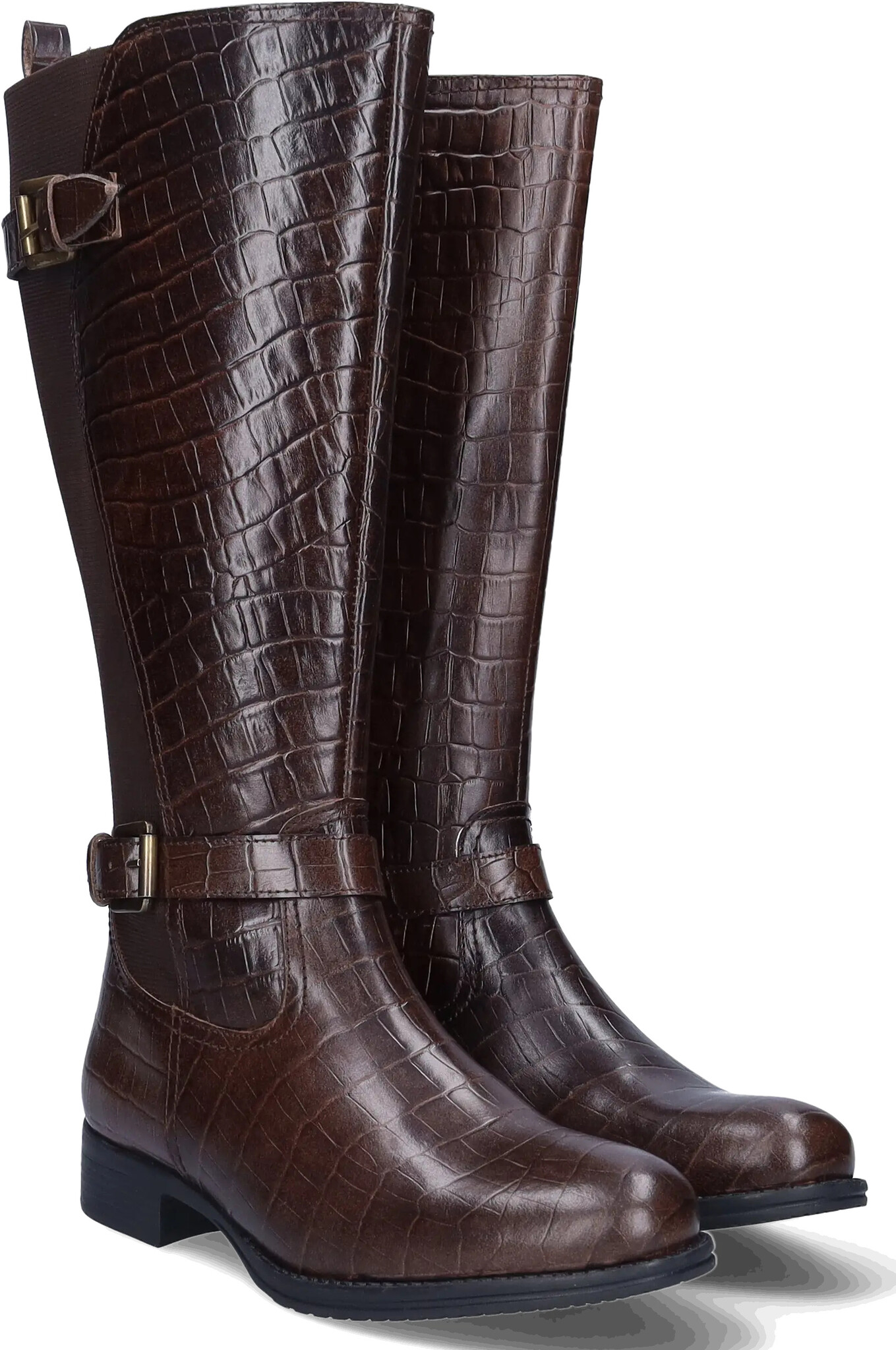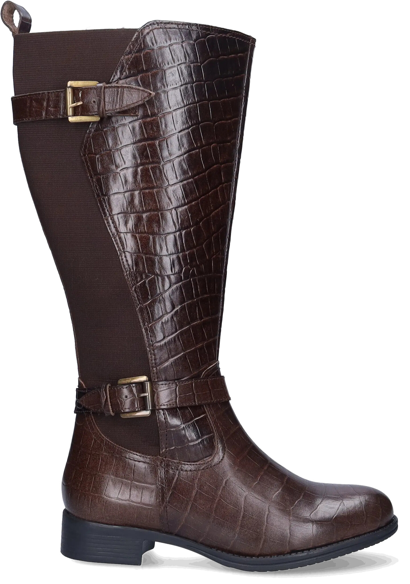 Der braune Redbourn ist ein bequemer Leder-Weitschaftstiefel. Er verfügt über einen Kroko-Print und elastisches Stretchmaterial an der Rückseite. Ausgestattet ist er mit einem Absatz und robusten Schnallen. Zudem besitzt er eine flexible Anti-Rutsch-Sohle und ein wechselbares Fußbett.