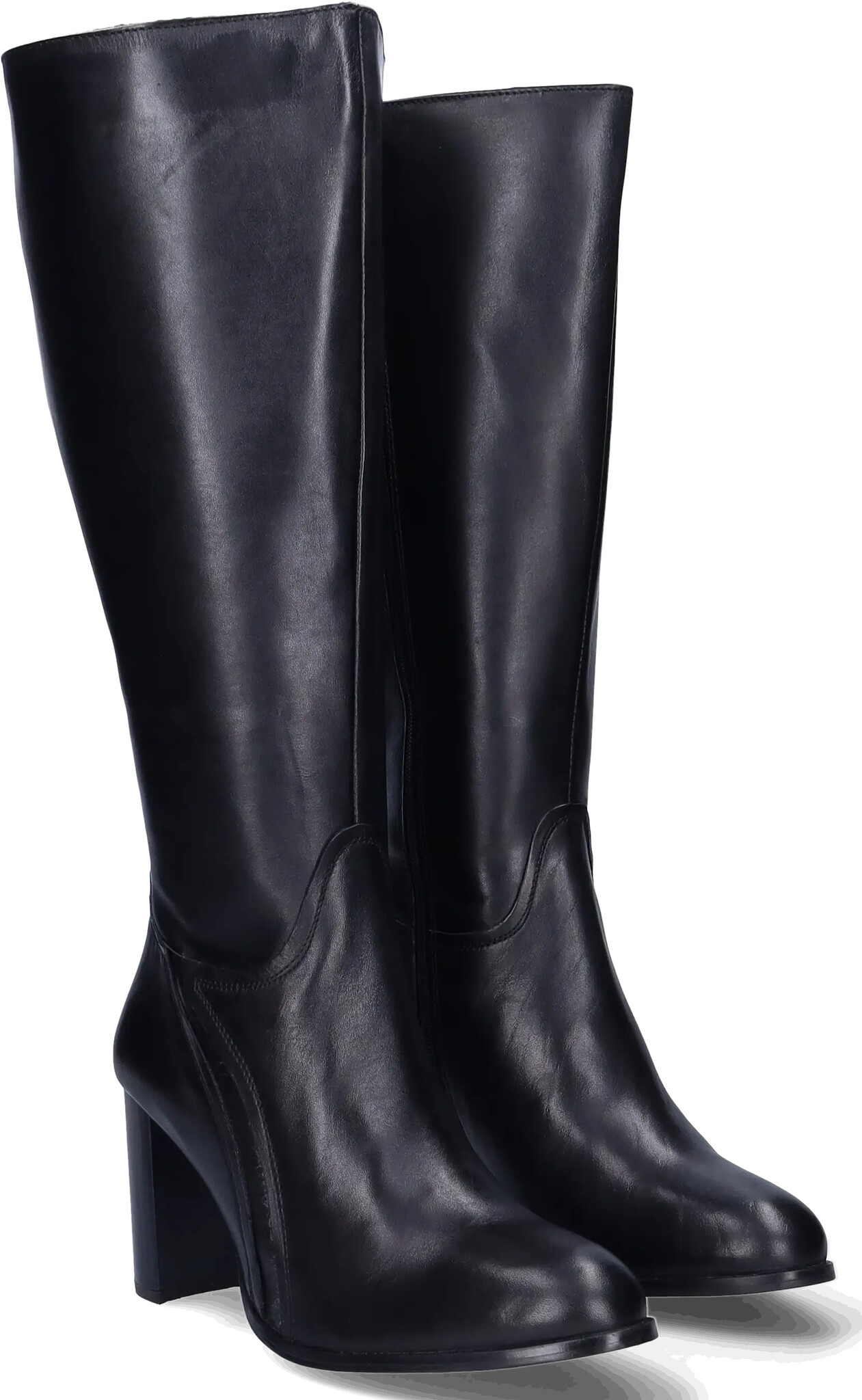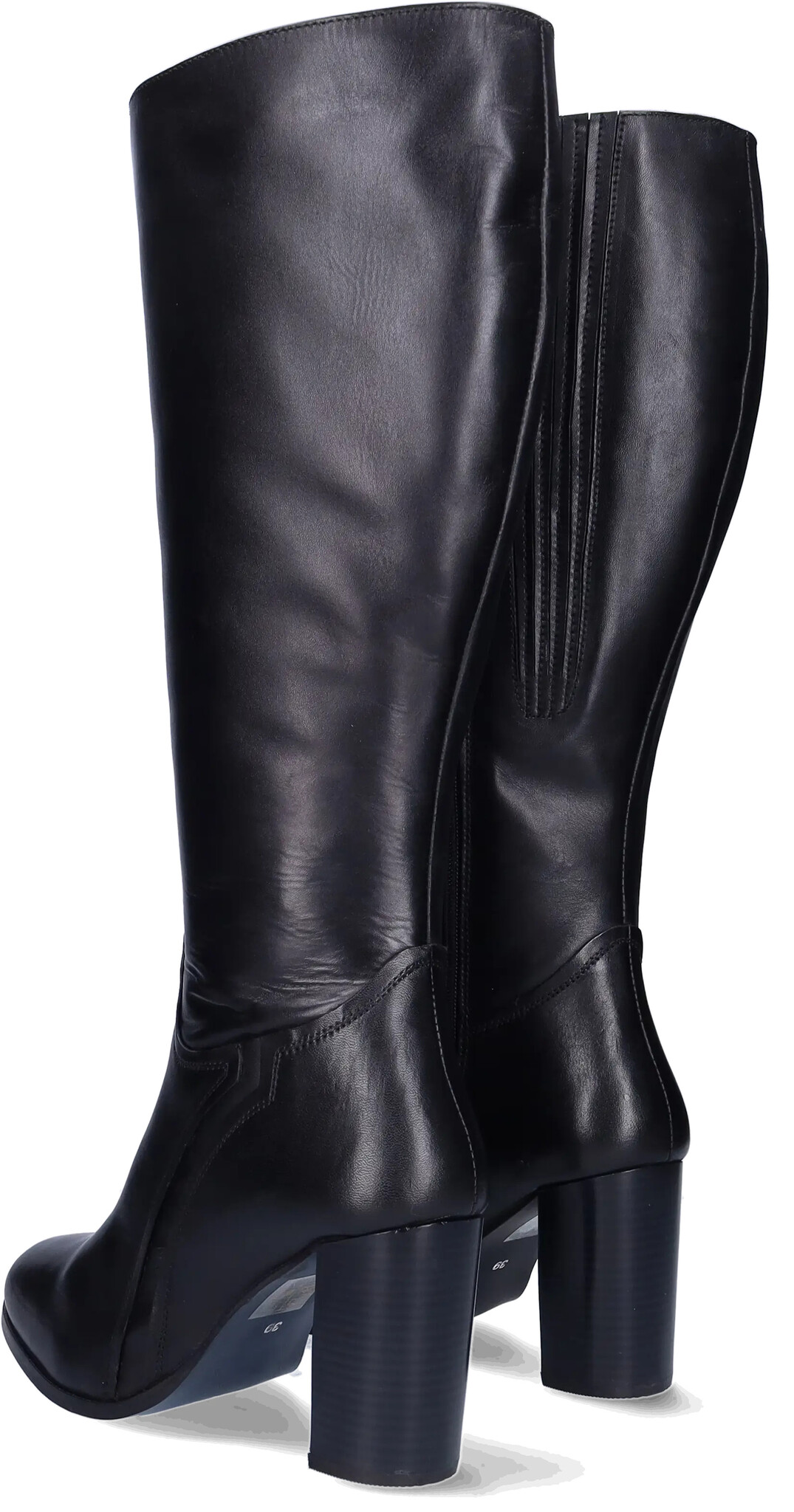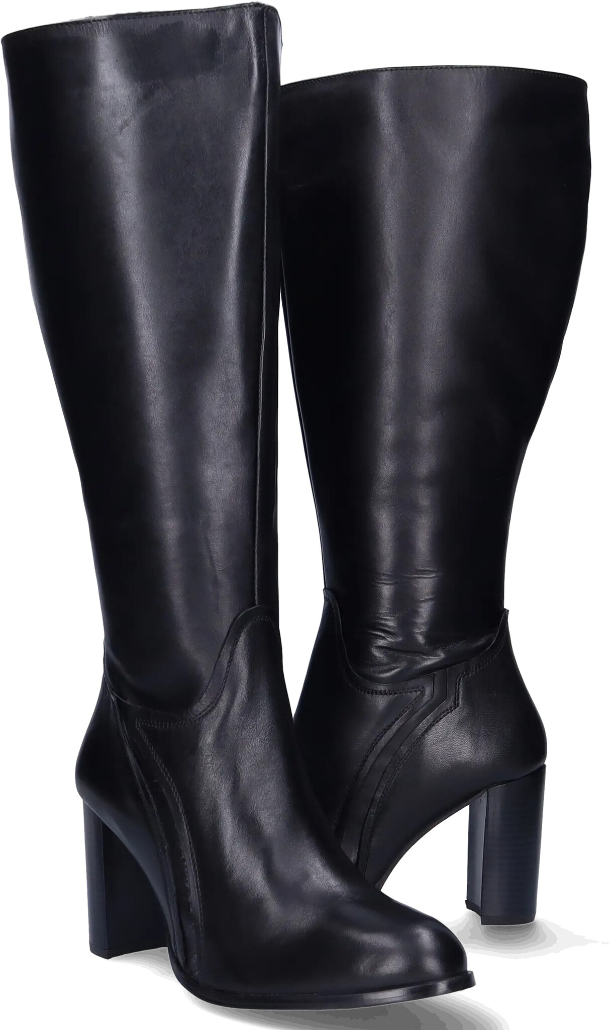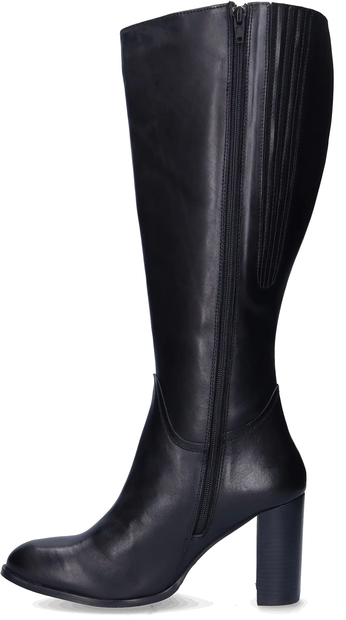 Santorini ist ein eleganter schwarzer Weitschaftstiefel für Damen und ist mit einem hohen Absatz versehen. Das schlichte und minimalistische Design verfügt über dezente elastische Einsätze für zusätzliche Flexibilität, die für eine bequeme und anpassungsfähige Passform sorgen. Der durchgehende Reißverschluss an der Innenseite ermöglicht müheloses An- und Ausziehen.
