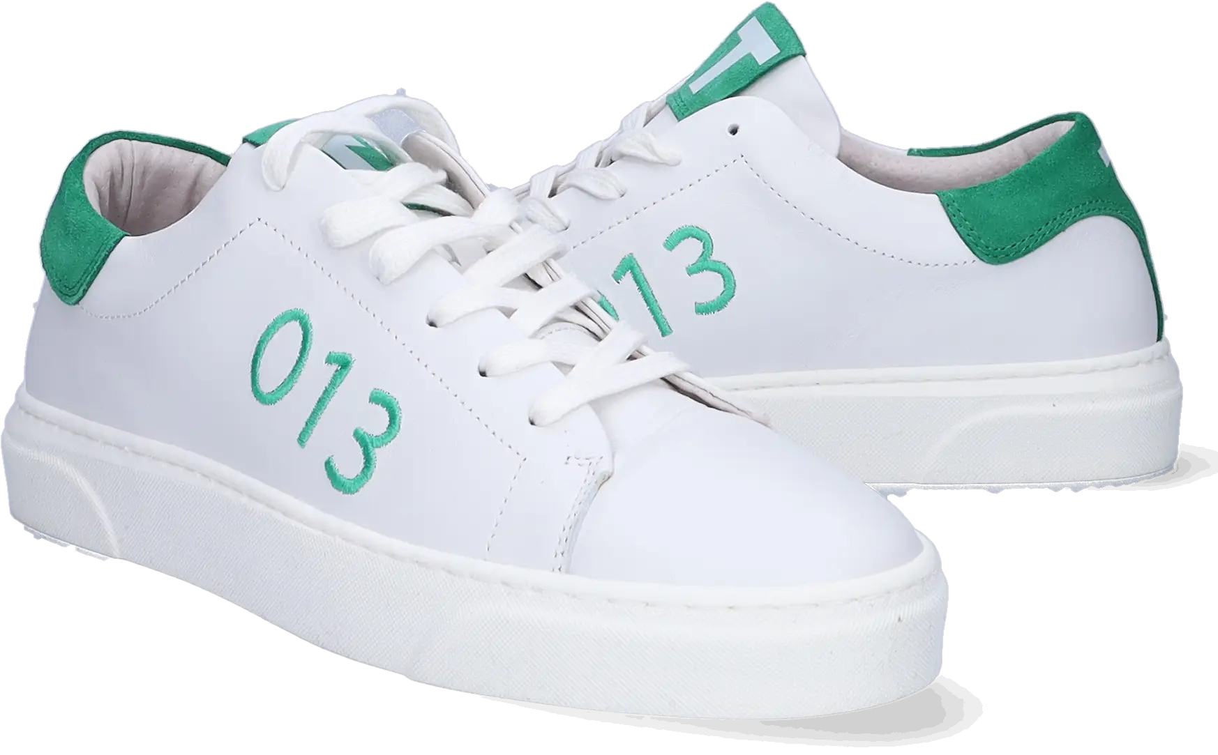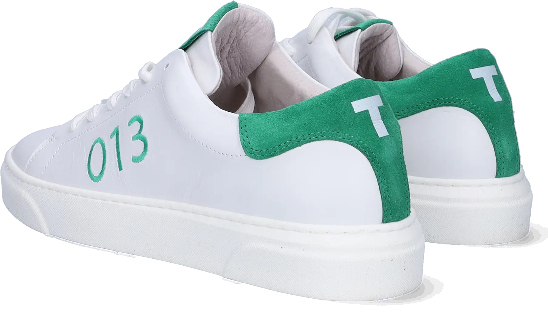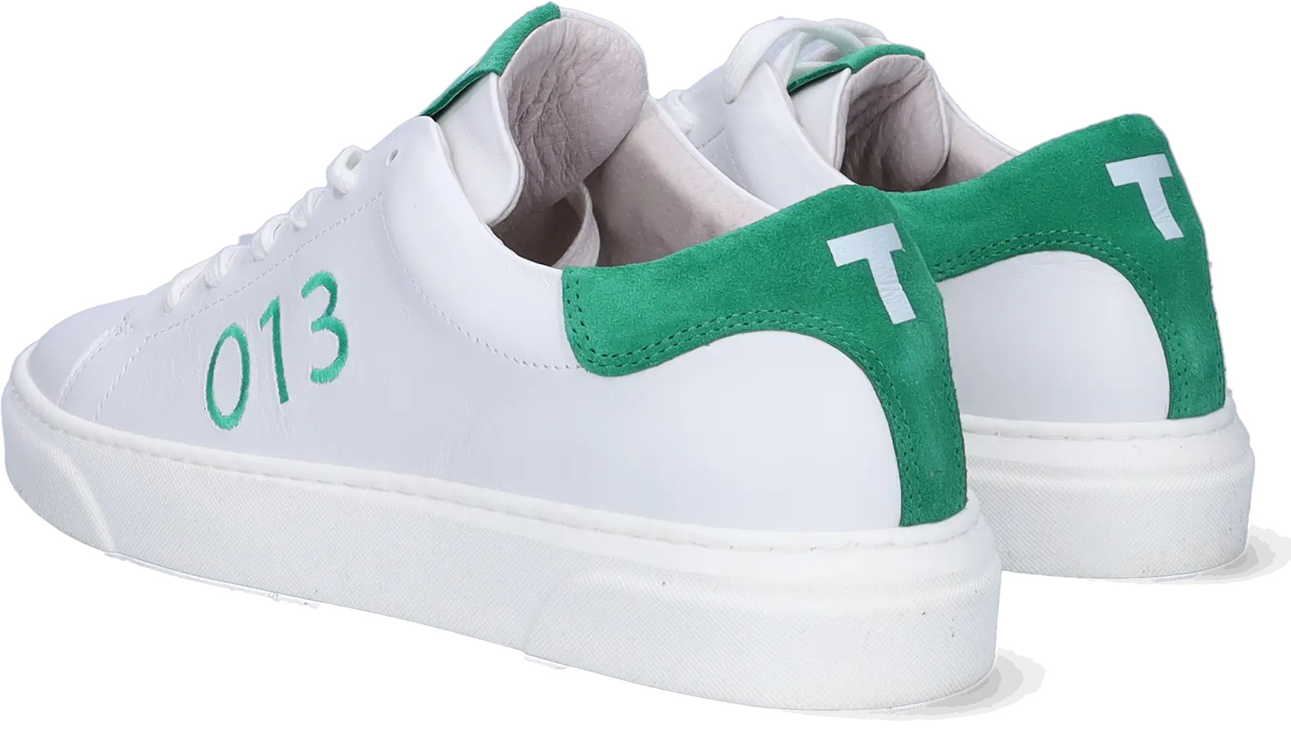Weiß-grüner Ledersneaker "Tilburg" für Damen. Geeignet für schmale und breite Füße. Sportliches Design mit einzigartigen Details: "013" Vorwahl auf der Seite und blaues "T" auf der Zunge.