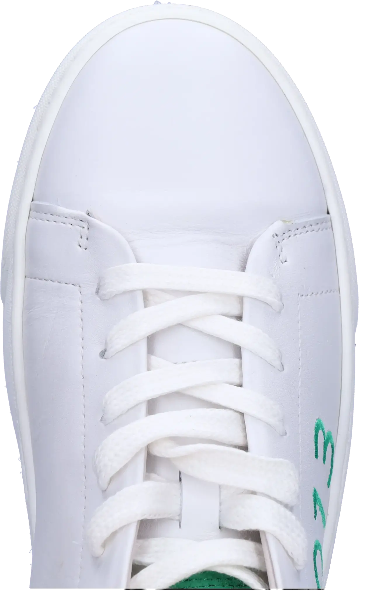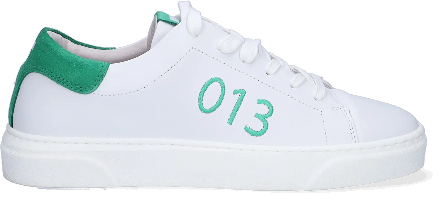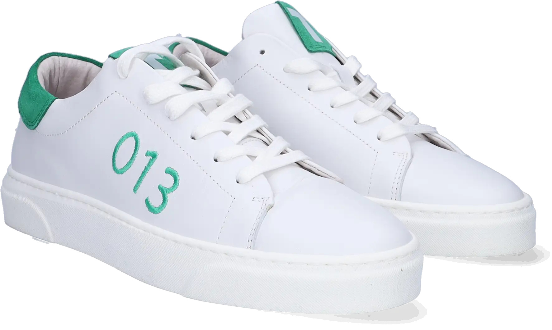 Weiß-grüner Ledersneaker "Tilburg" für Damen. Geeignet für schmale und breite Füße. Sportliches Design mit einzigartigen Details: "013" Vorwahl auf der Seite und blaues "T" auf der Zunge.