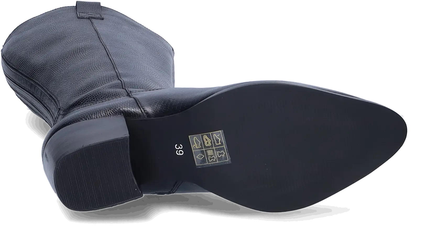 Adana is a black leather, women's extra wide calf, cowboy boot. A traditionally Western styled boot with a Cuban heel, pull tabs and a curved topline. Adana has a side zip fastening and is available in a variety of calf width fittings and in sizes 36-44.