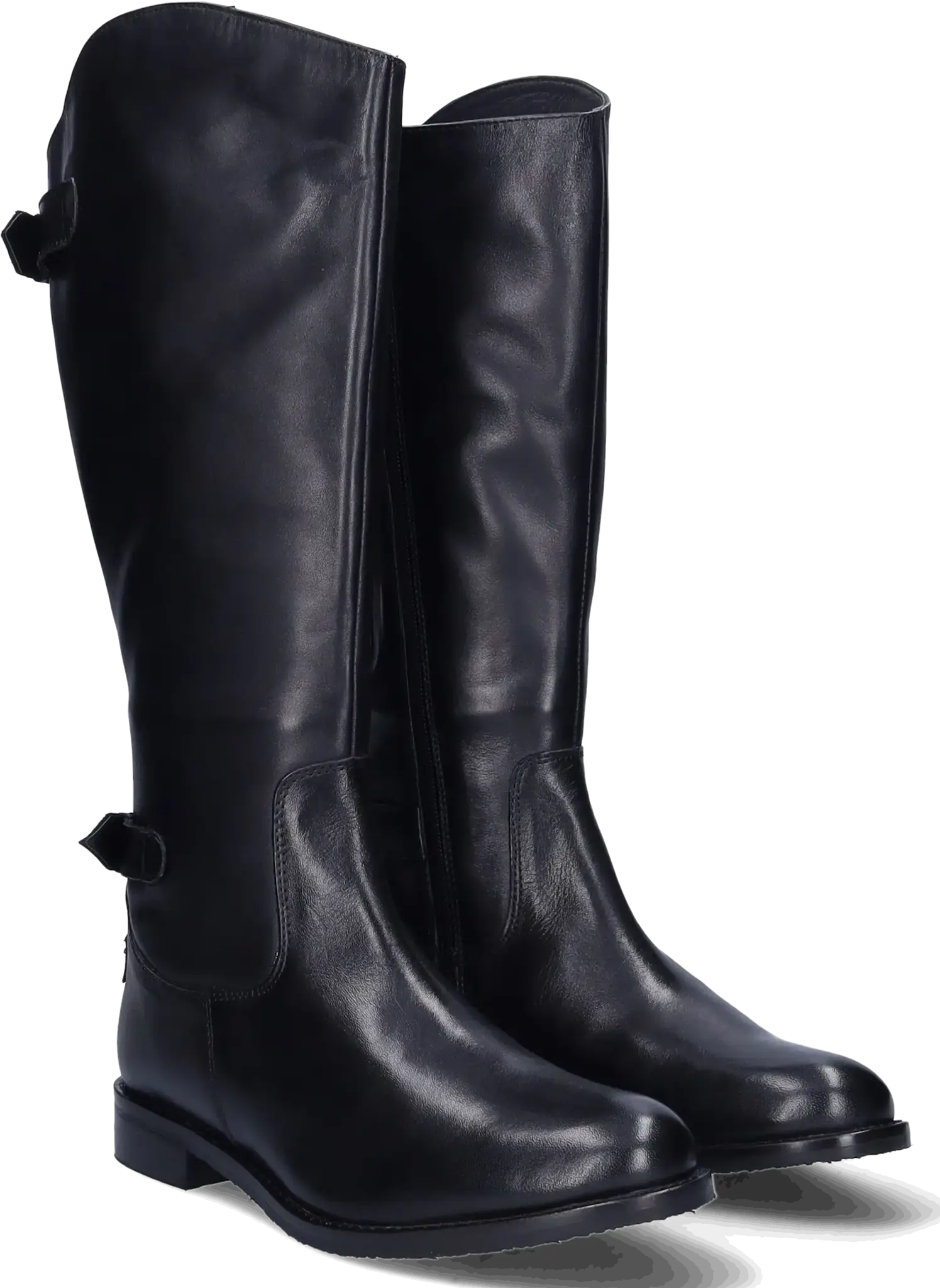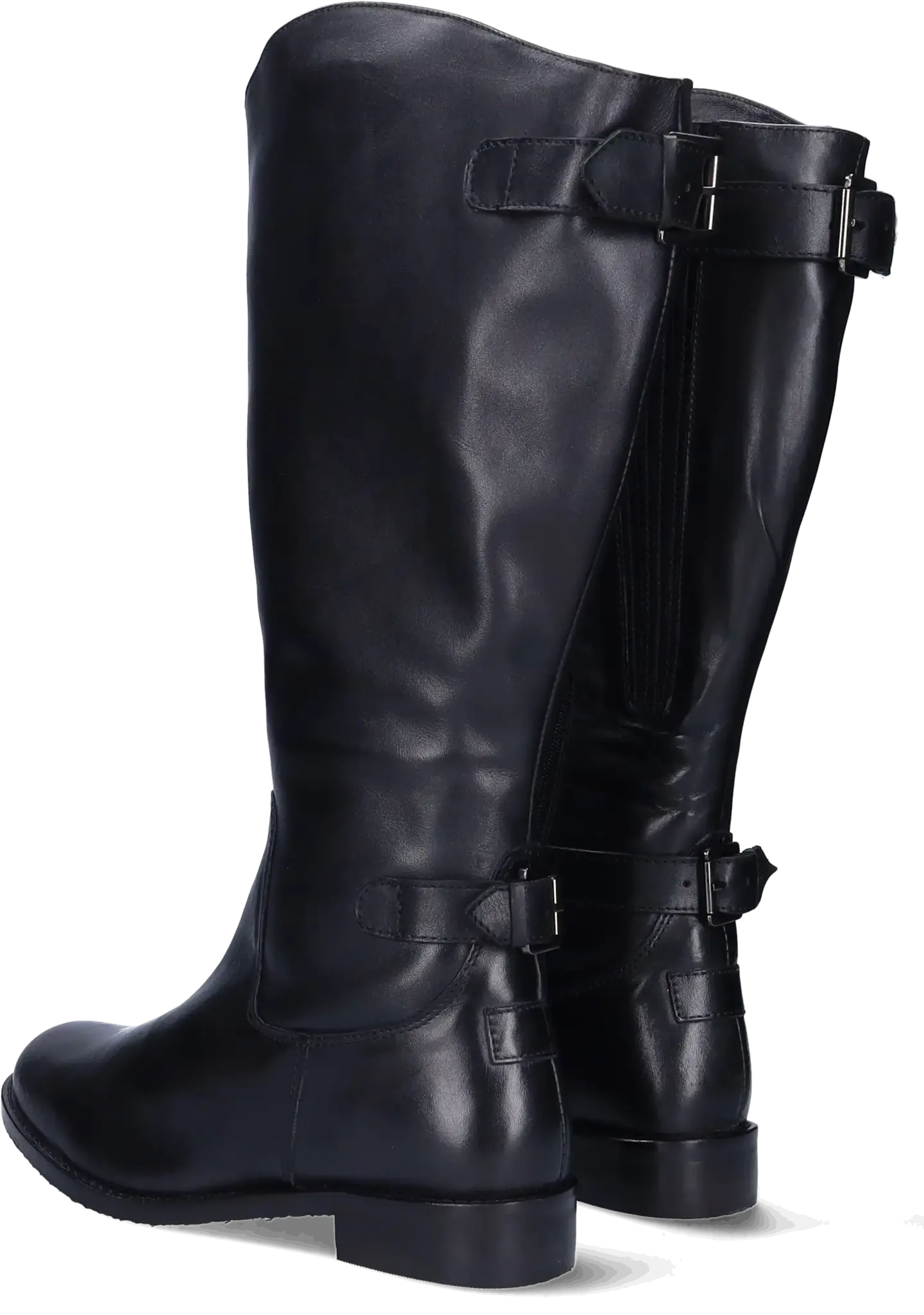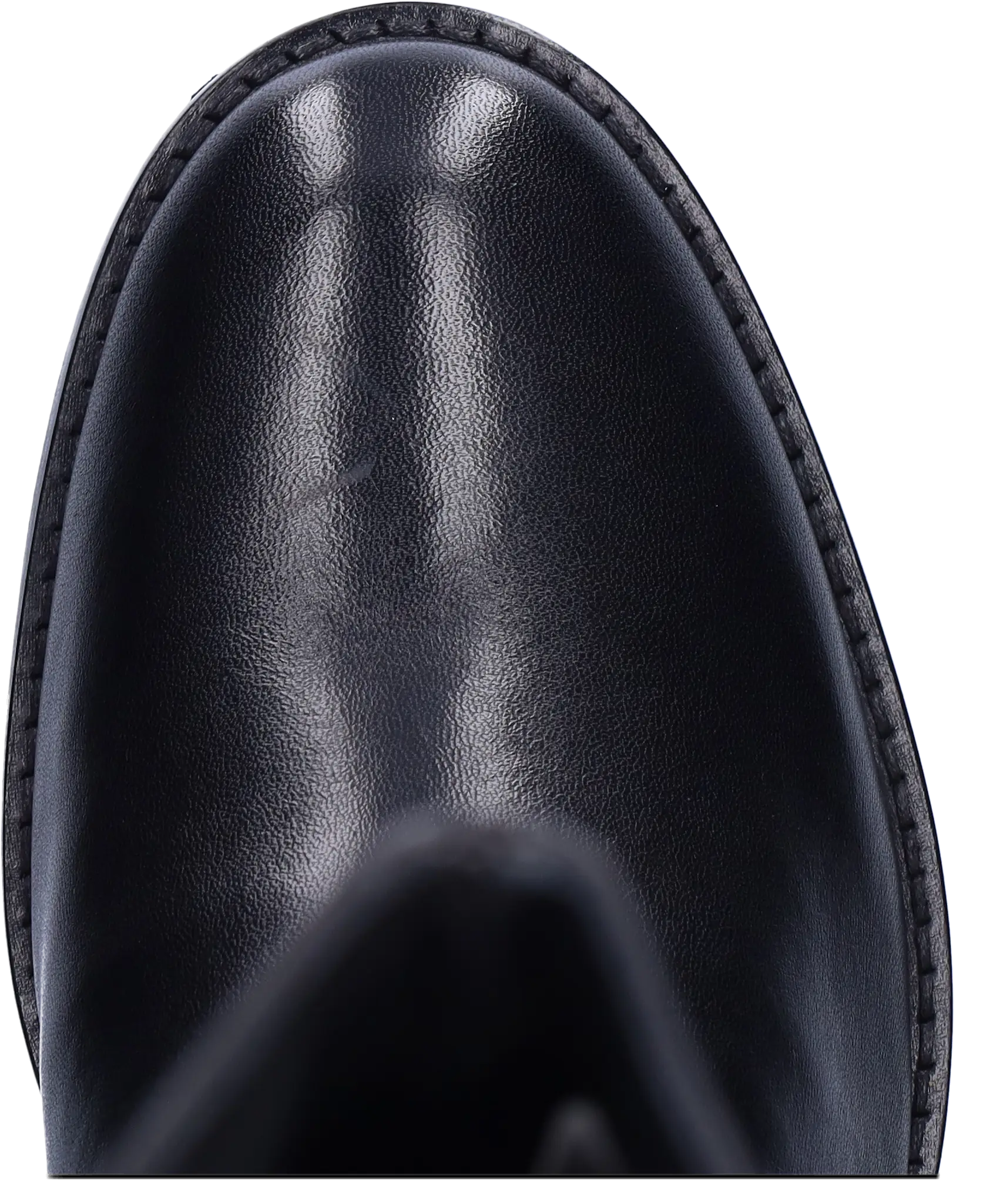 Arnside is an black extra-wide calf, riding-style leather boot. It features a leather lining, a removable footbed, and a sturdy rubber sole. It's equipped with a heel, a zipper, and two leather straps.