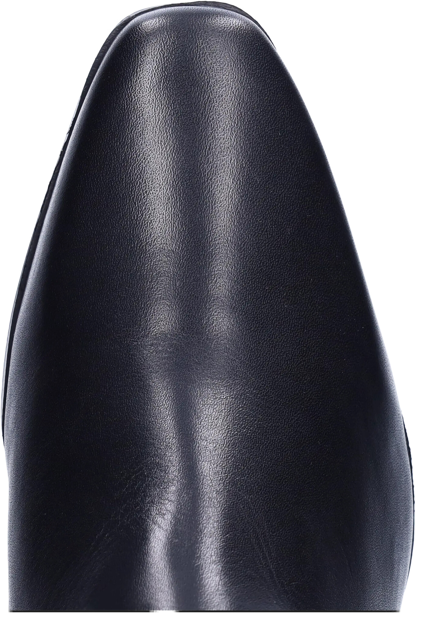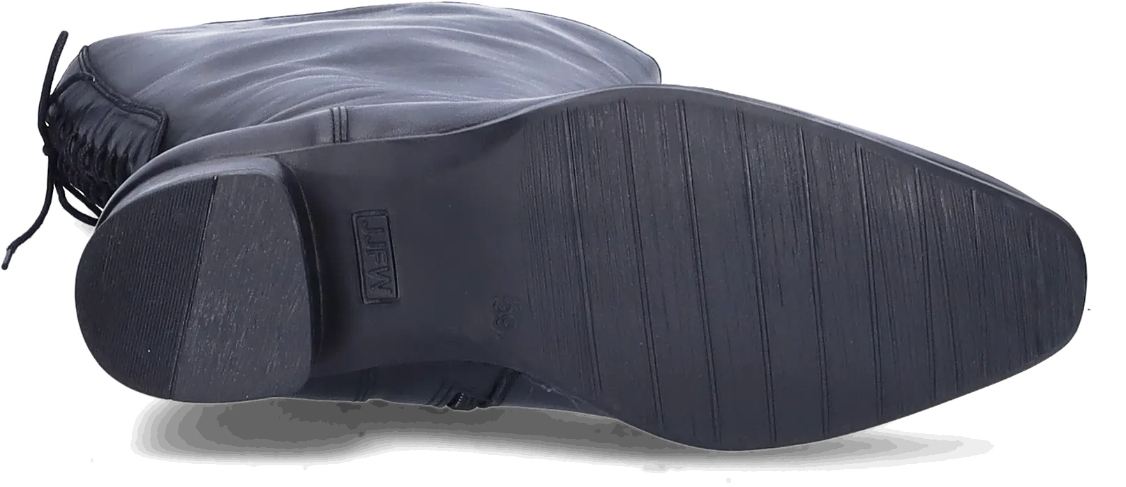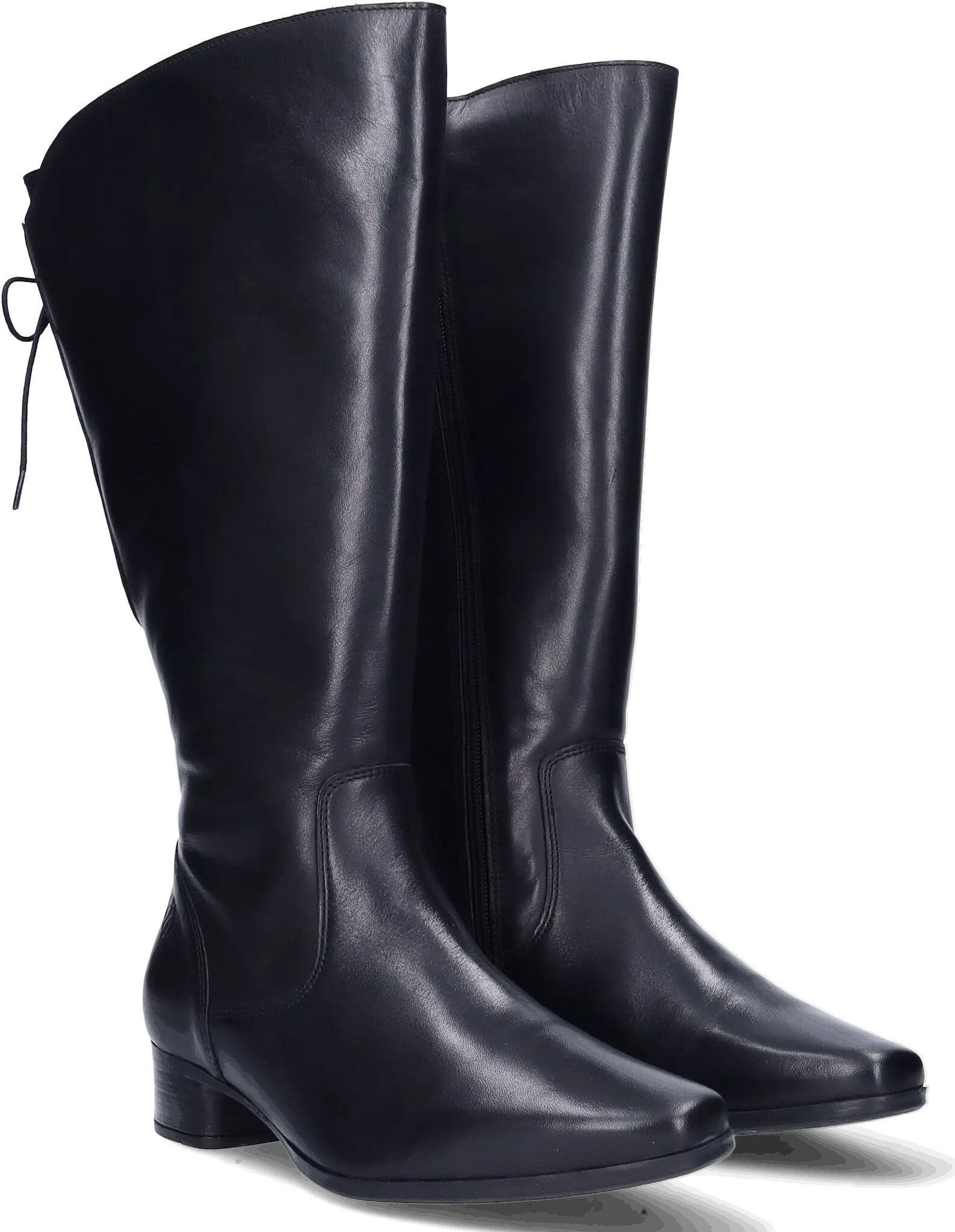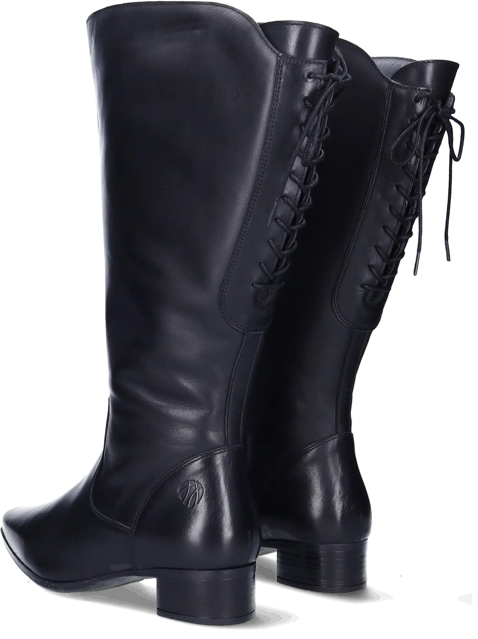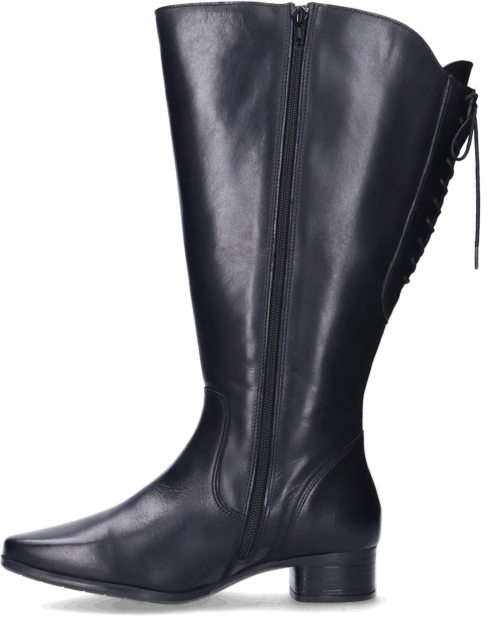 Cardiff is an elegant black leather wide calf boot, in a riding-boot style. With a tapered shaft and an adjustable lace-up top, this boot provides an ideal fit. It's equipped with a heel and a zipper. The replaceable footbed makes it possible to wear your own insoles in this boot.