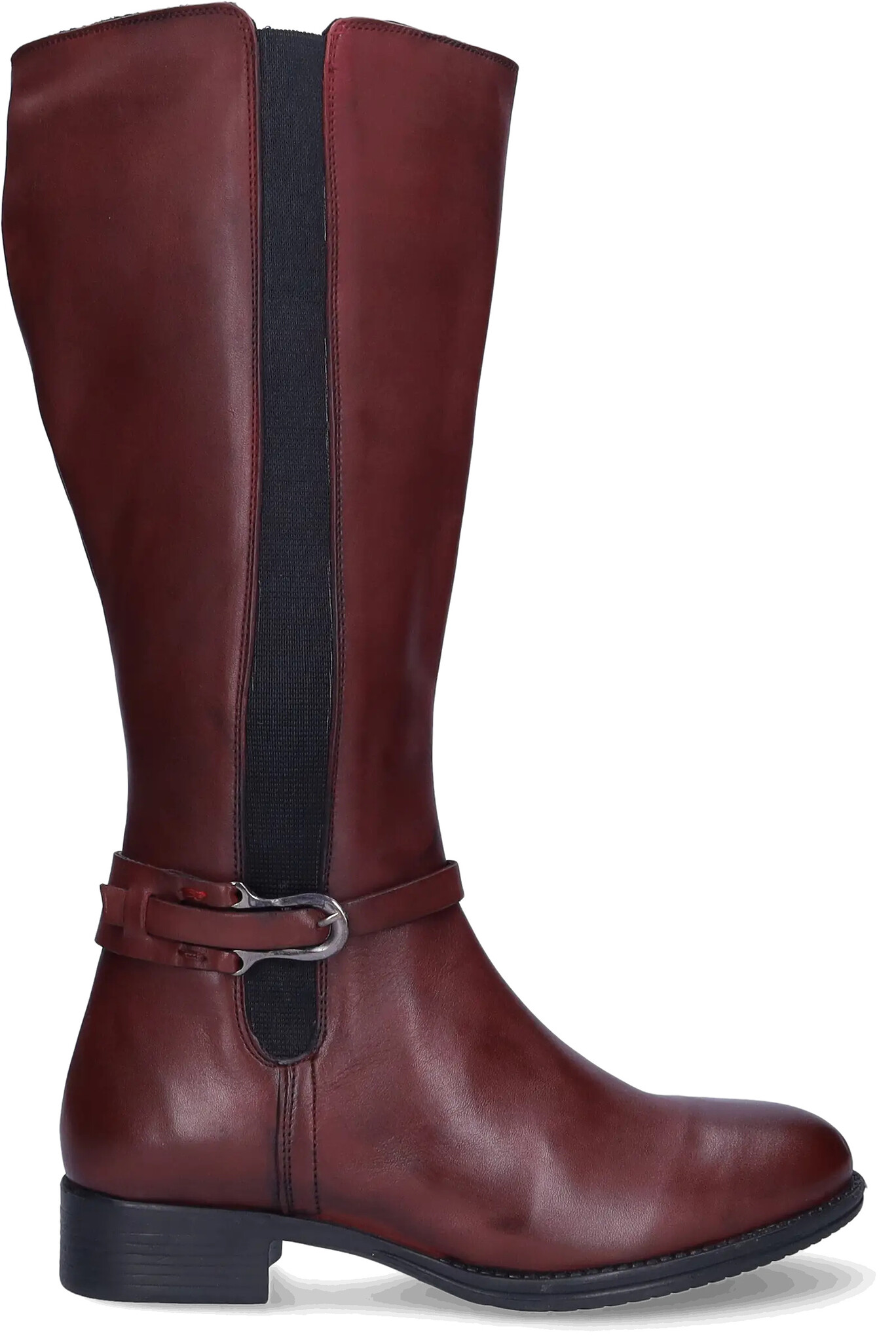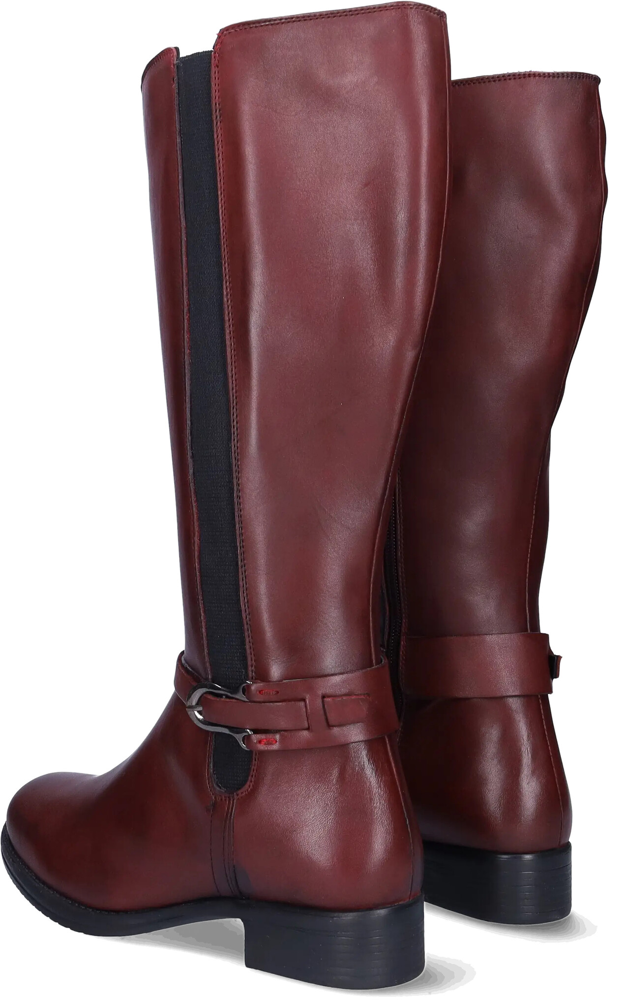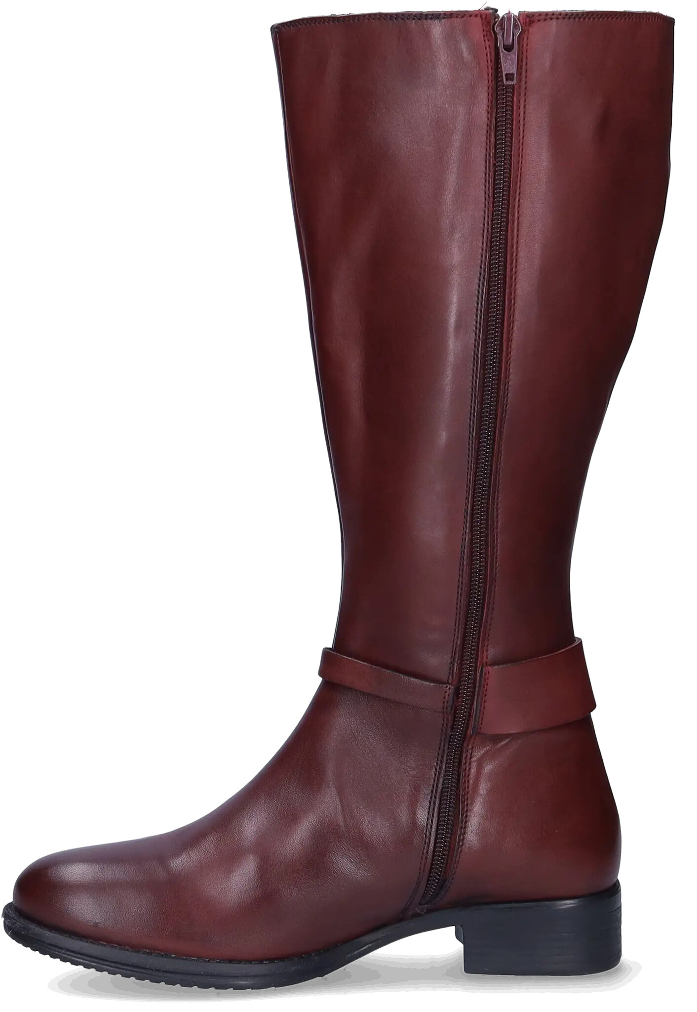 Coalville is a knee-high Bordeaux leather boot with an extra-wide shaft. It features a fashionable ankle strap, stretch section, zipper closure, and low block heel. Equipped with a flexible non-slip sole and removable footbed