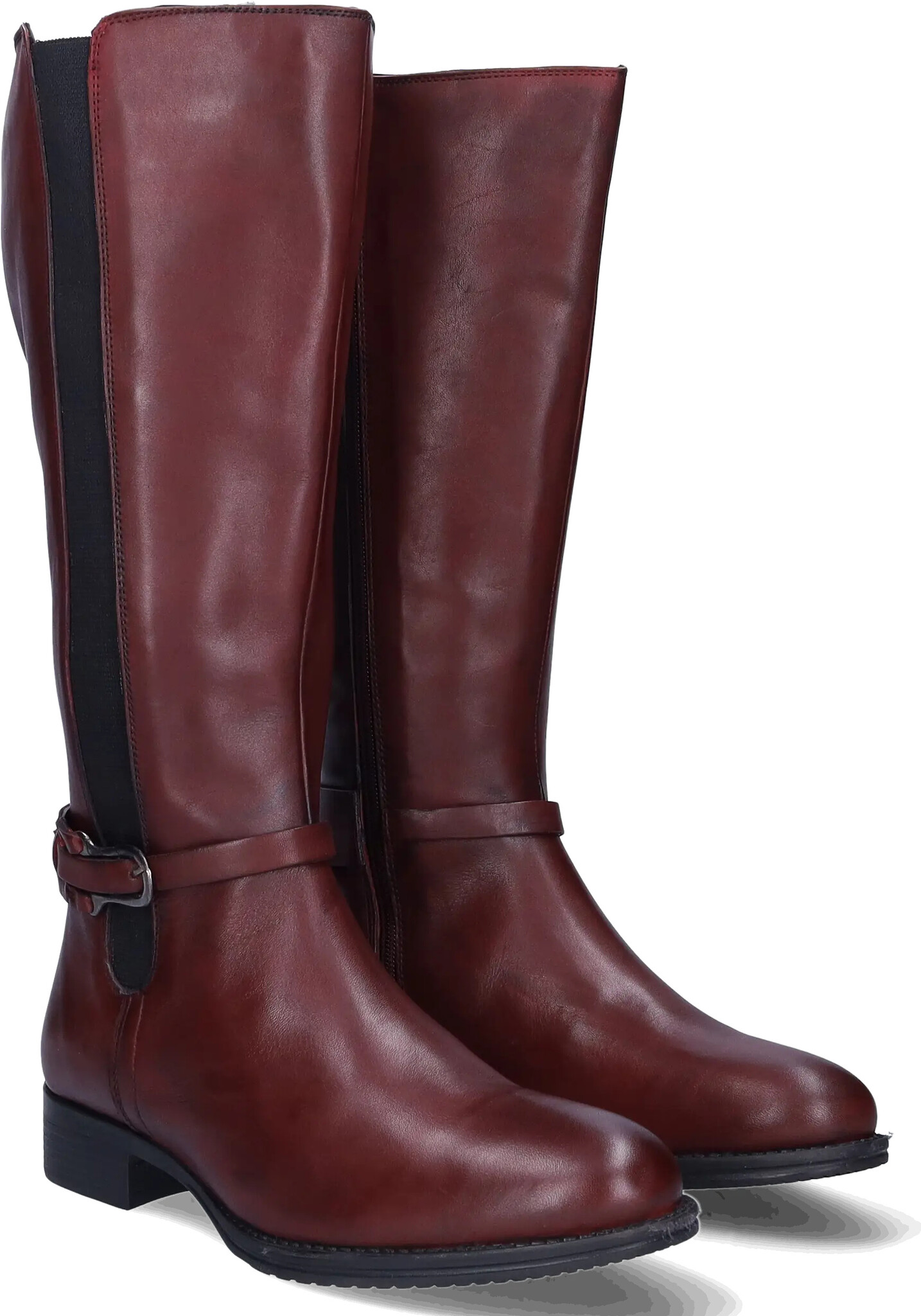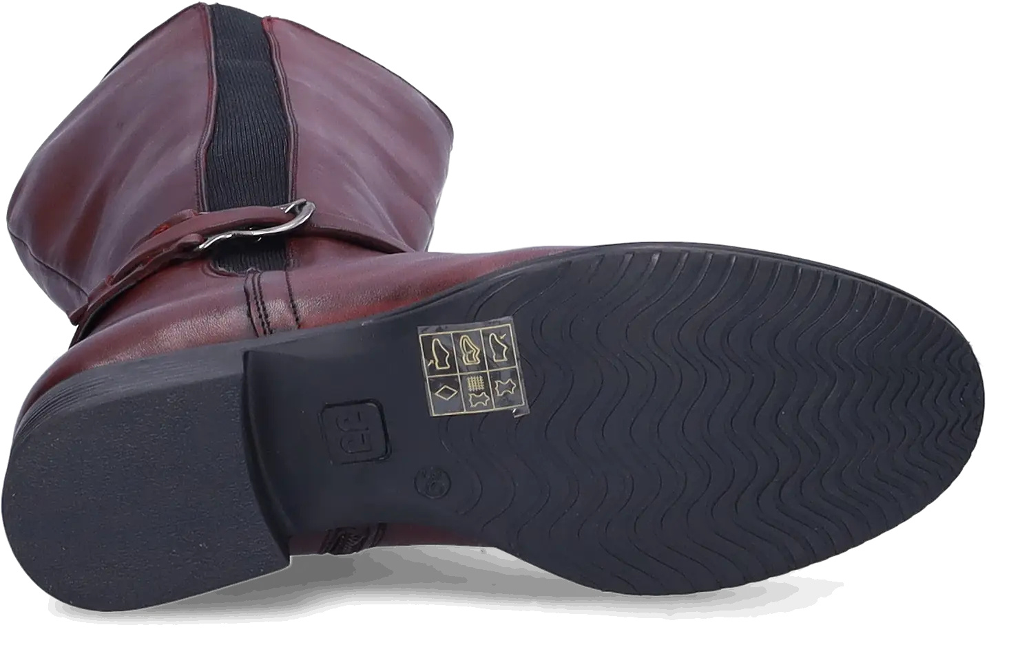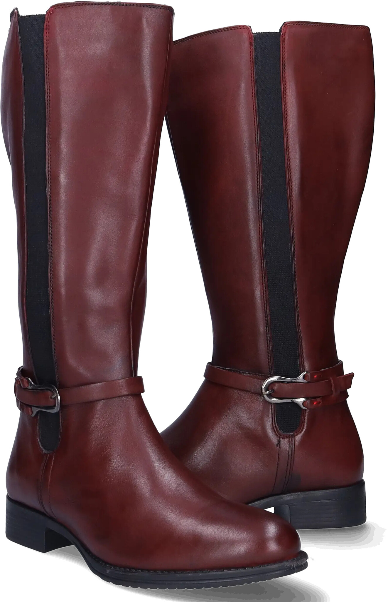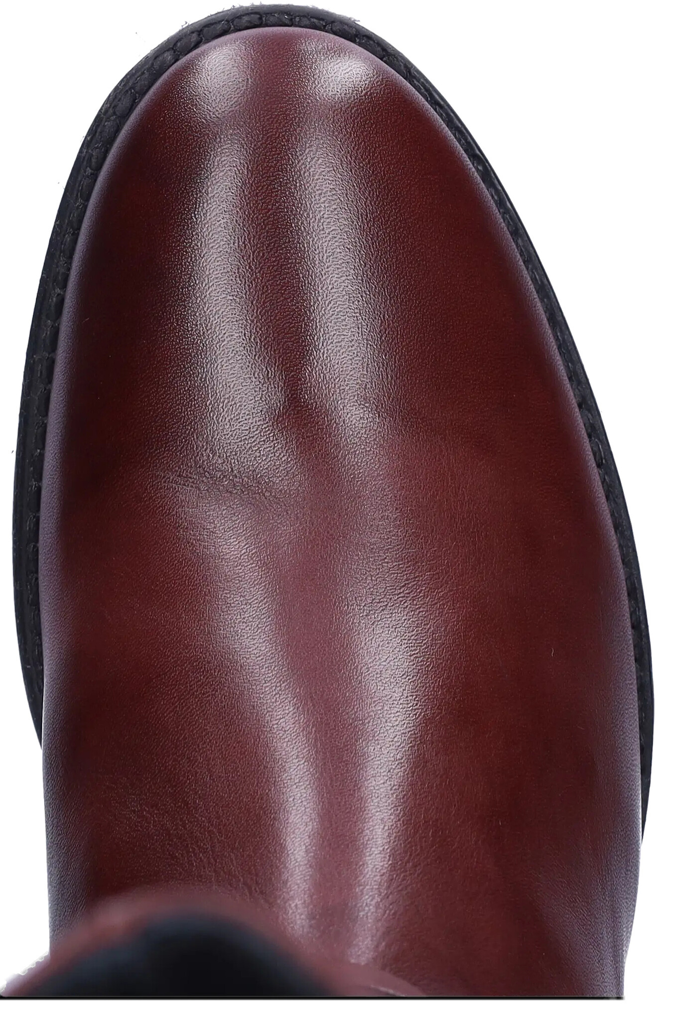 Coalville is a knee-high Bordeaux leather boot with an extra-wide shaft. It features a fashionable ankle strap, stretch section, zipper closure, and low block heel. Equipped with a flexible non-slip sole and removable footbed