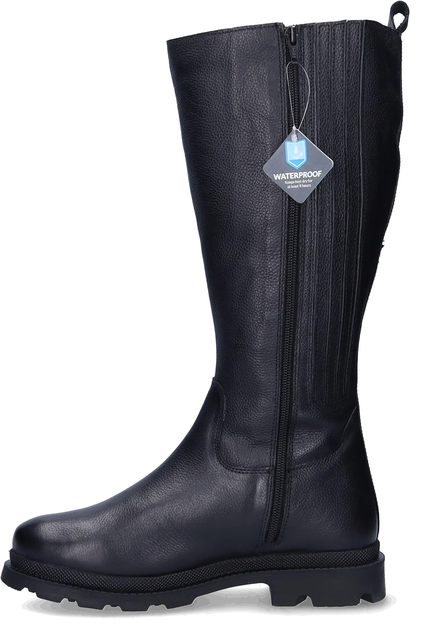 Morley is the perfect blend of style and functionality. This tall, wide calf boot is crafted from luxurious black leather and is completely waterproof, keeping your feet dry and comfortable no matter the weather. The stretch panel on the side provides a flexible and snug fit, while the comfortable sole ensures lasting wear. Thanks to the removable footbed, you can easily use your own insoles. It's ideal for both casual and elegant outfits.