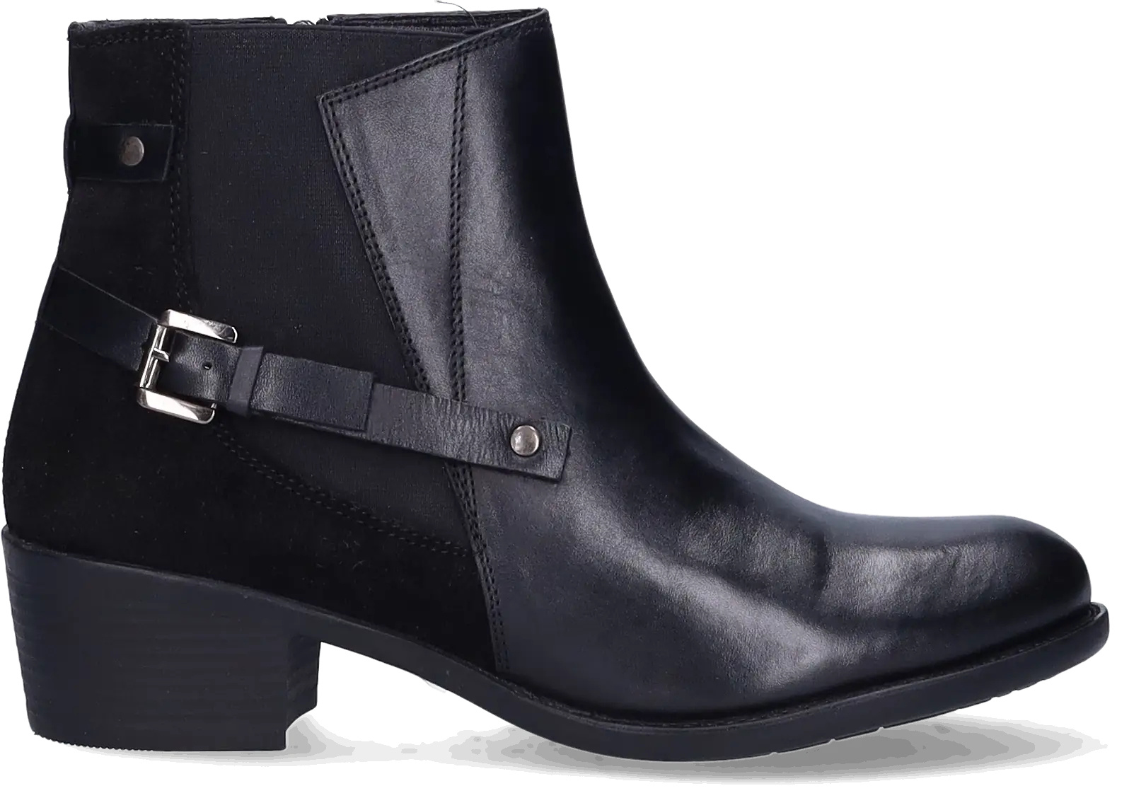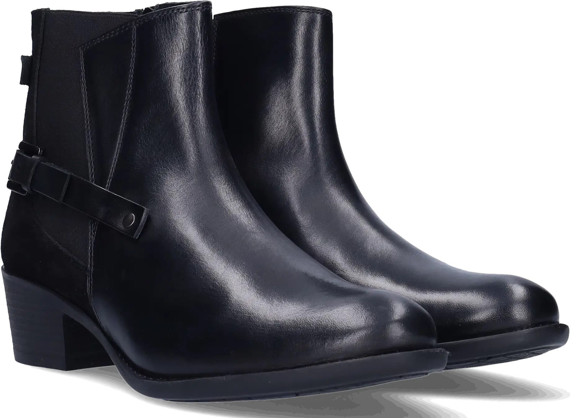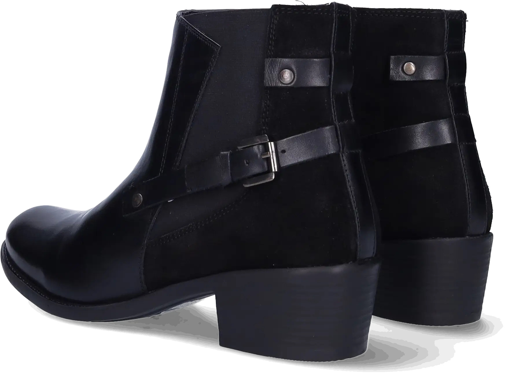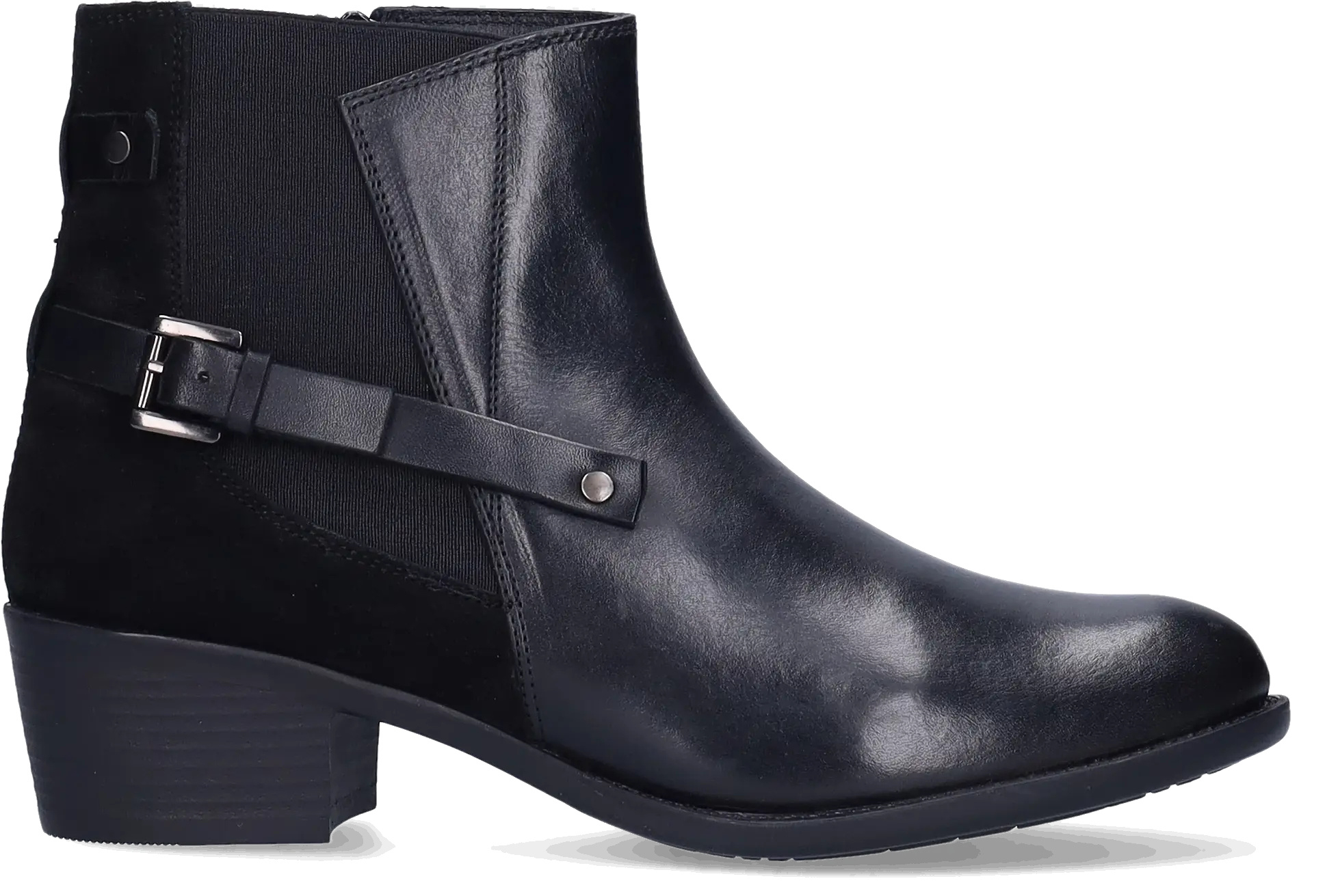 Narita is a black narrow ankle boot made from high-quality leather with a stretch element. It's equipped with a block heel, distinctive side buckles, and a zip closure. Thanks to a removable footbed, these ankle boots are suitable for wearing with orthotic insoles. They are available in both narrow and wide widths.