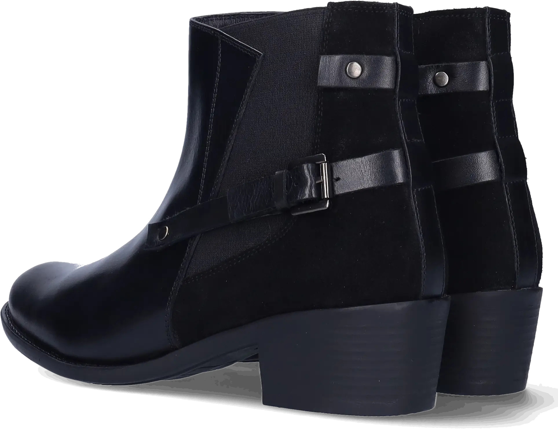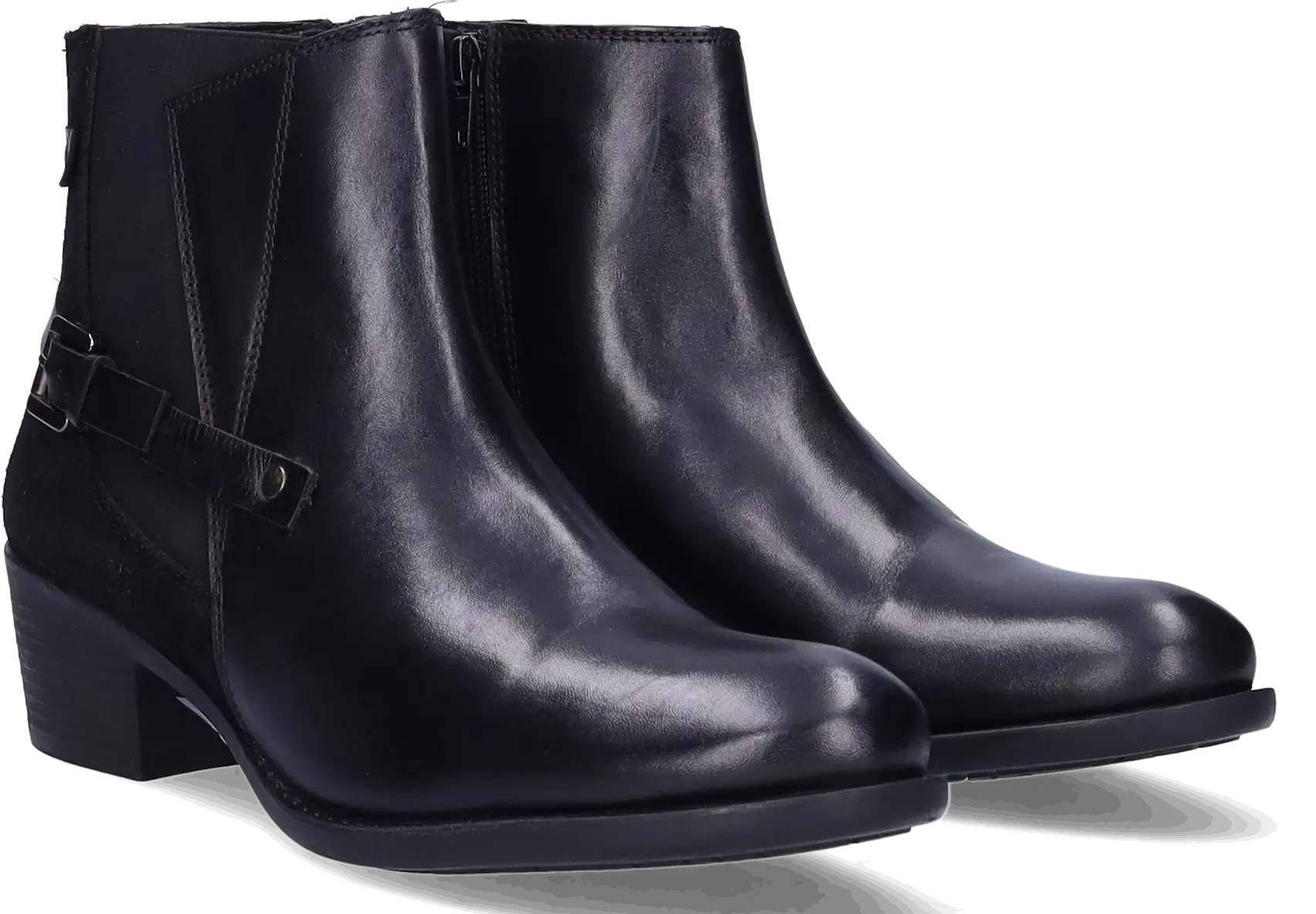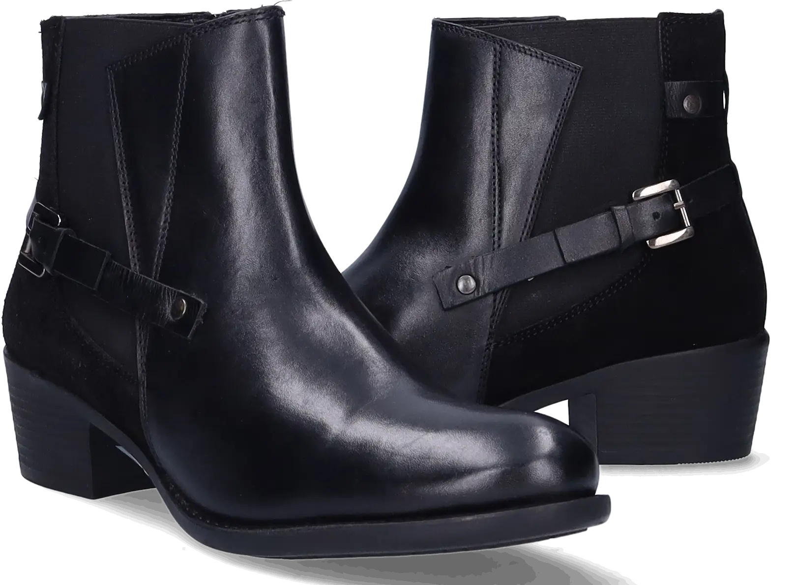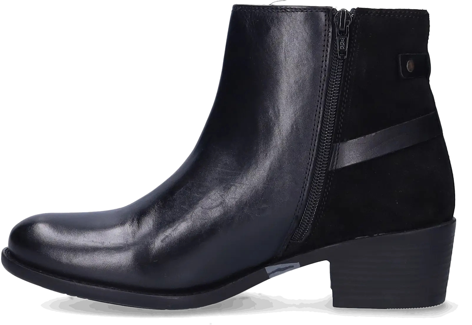 Narita is a black narrow ankle boot made from high-quality leather with a stretch element. It's equipped with a block heel, distinctive side buckles, and a zip closure. Thanks to a removable footbed, these ankle boots are suitable for wearing with orthotic insoles. They are available in both narrow and wide widths.