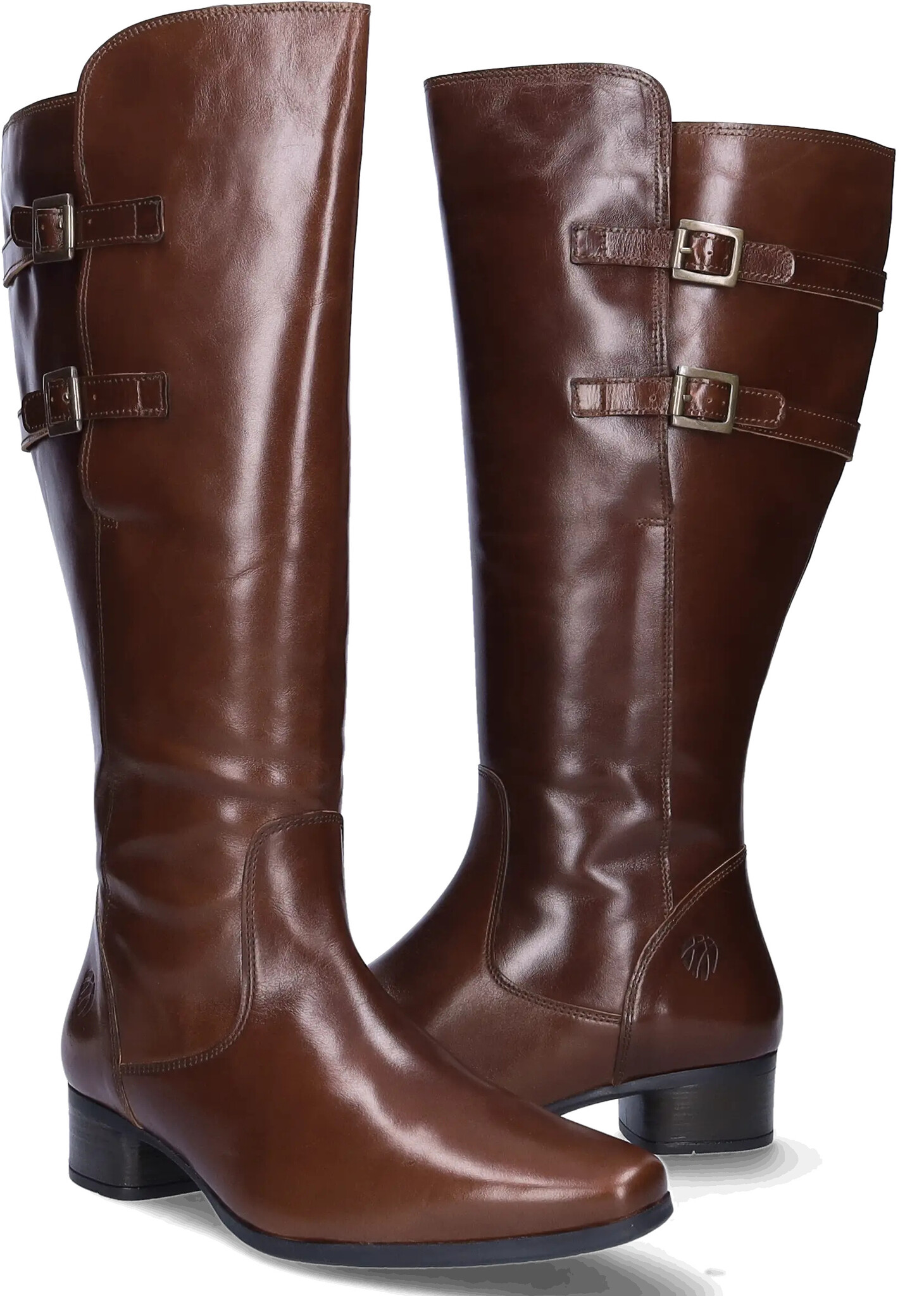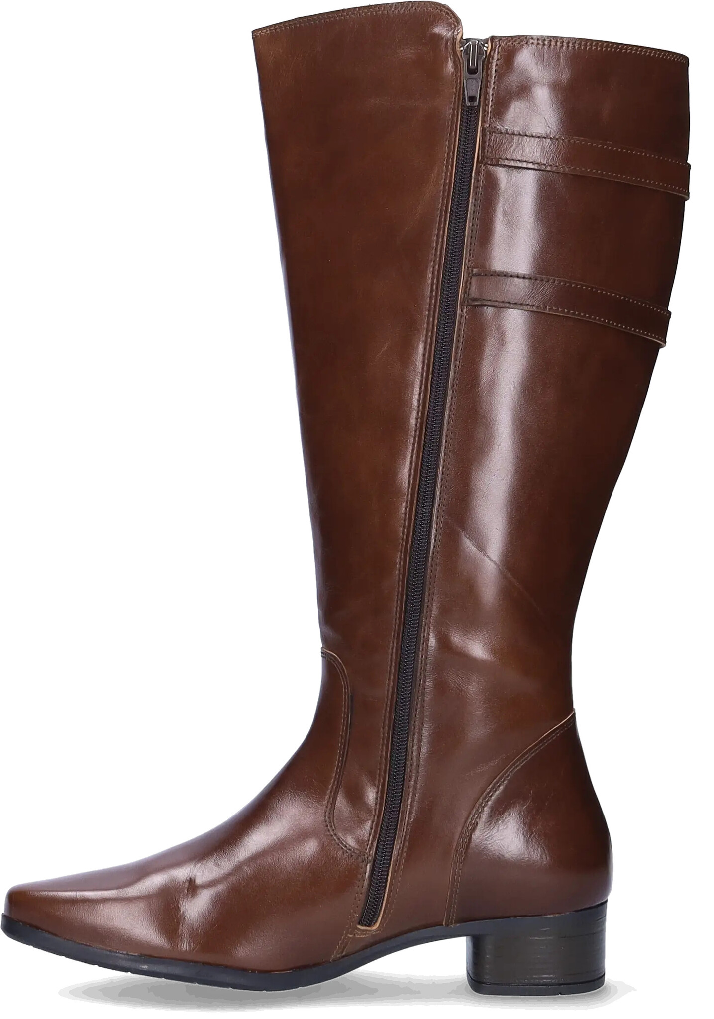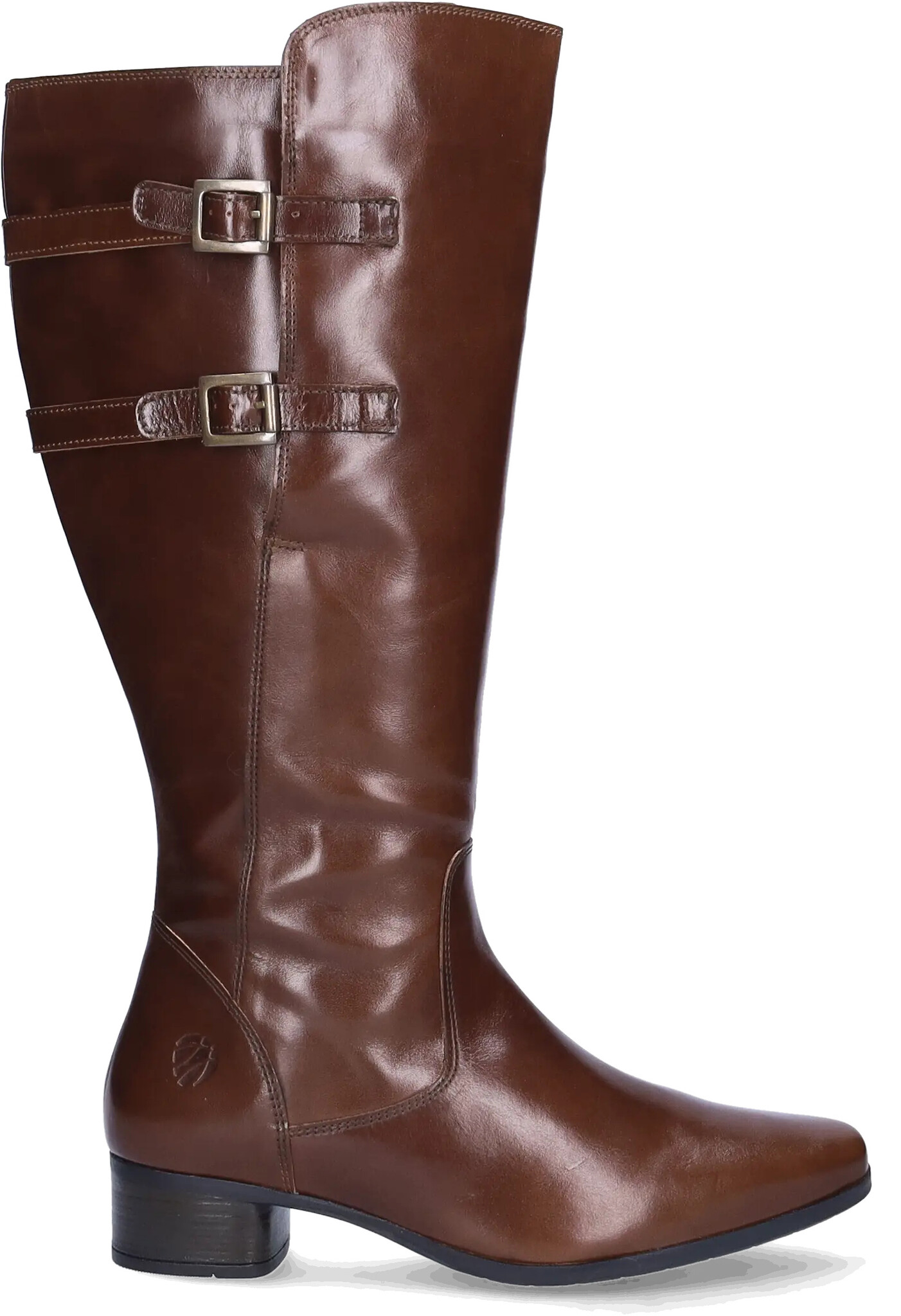 Piraens is a cognac-colored extra wide calf boot made from high-quality leather. This boot features adjustable side buckles that are both decorative and functional, allowing you to fine-tune the fit. This model has a low heel, a zip closure, and is suitable for orthotic insoles.