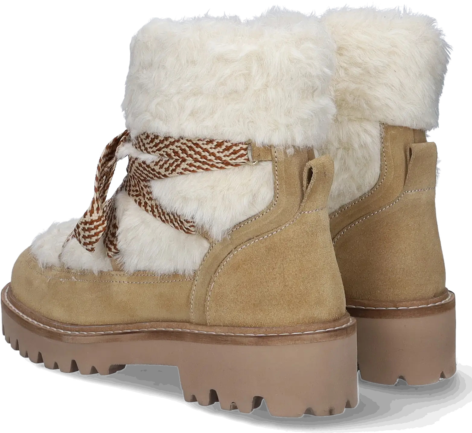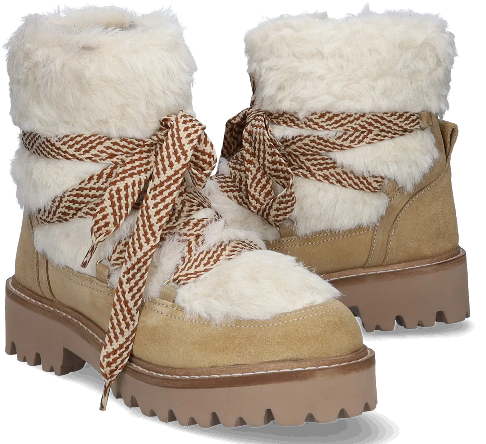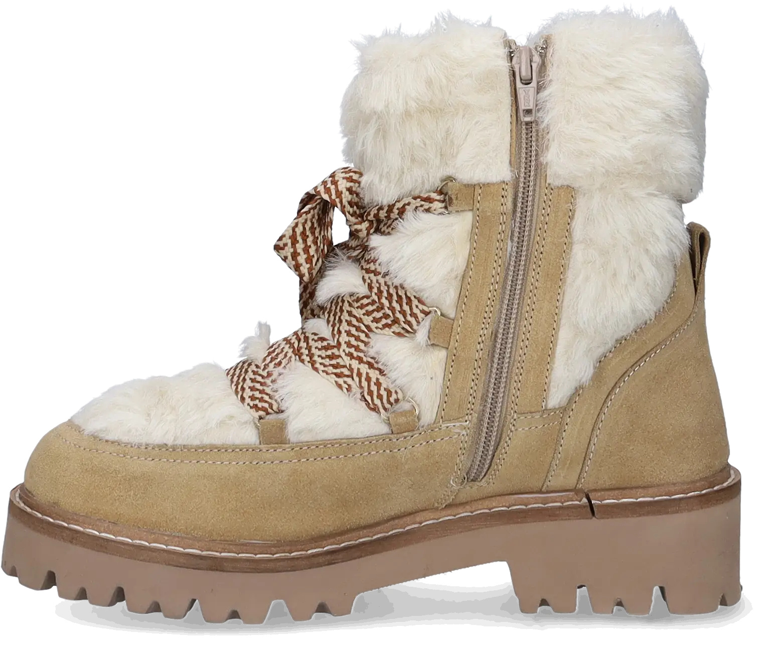 Sutton is a soft and warm leather wide-fit ankle boot, in beige. It's made from a faux fur lining and leather. The boot features a thick rubber lug sole for good grip, a lace-up front, and a side zipper. This style is also suitable for wearing with orthotics.