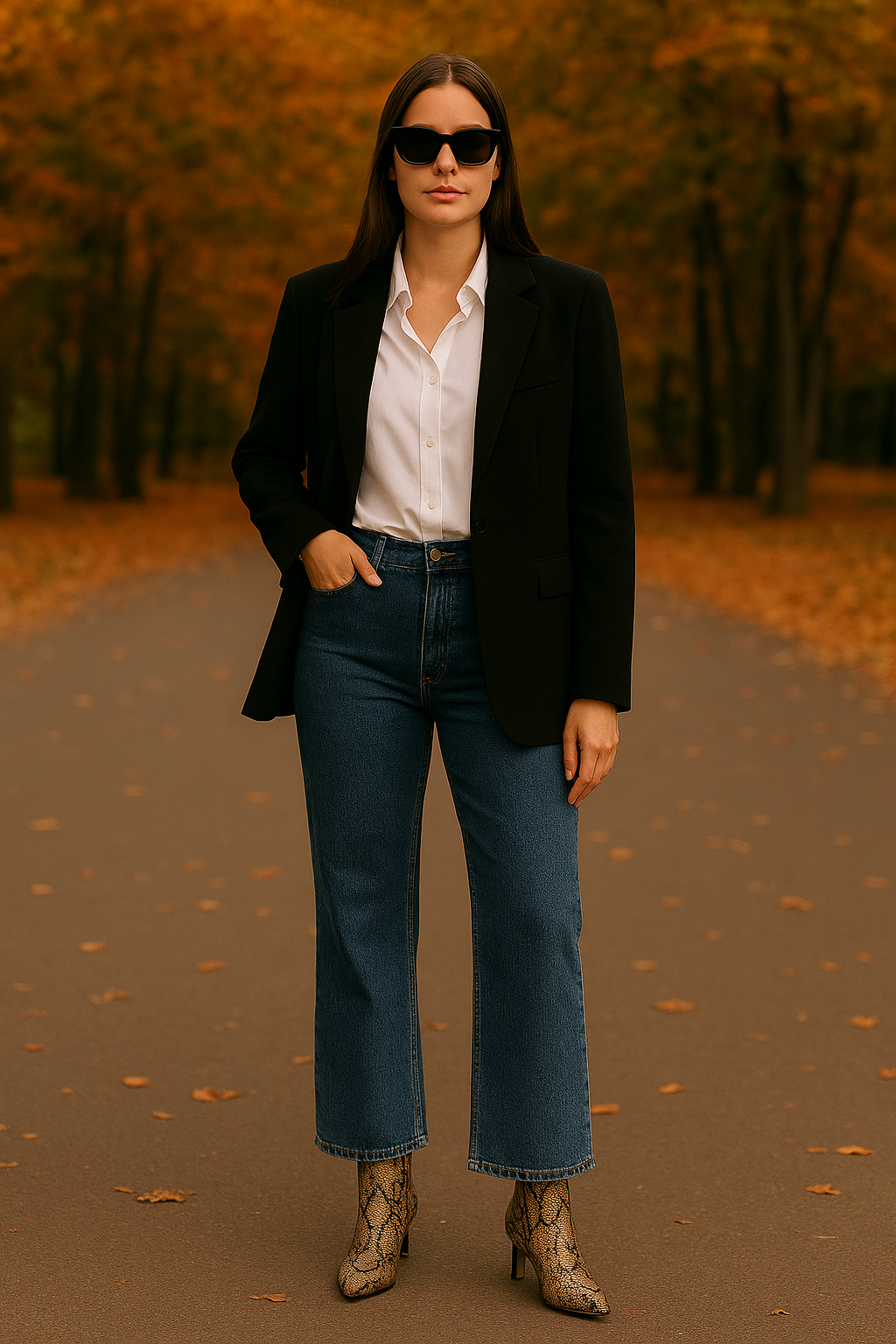 Slangenprintlaarzen maken elke outfit krachtig. Combineer ze met een klassieke straight leg mom jeans en trenchcoat of blazer voor een tijdloze herfstlook.