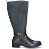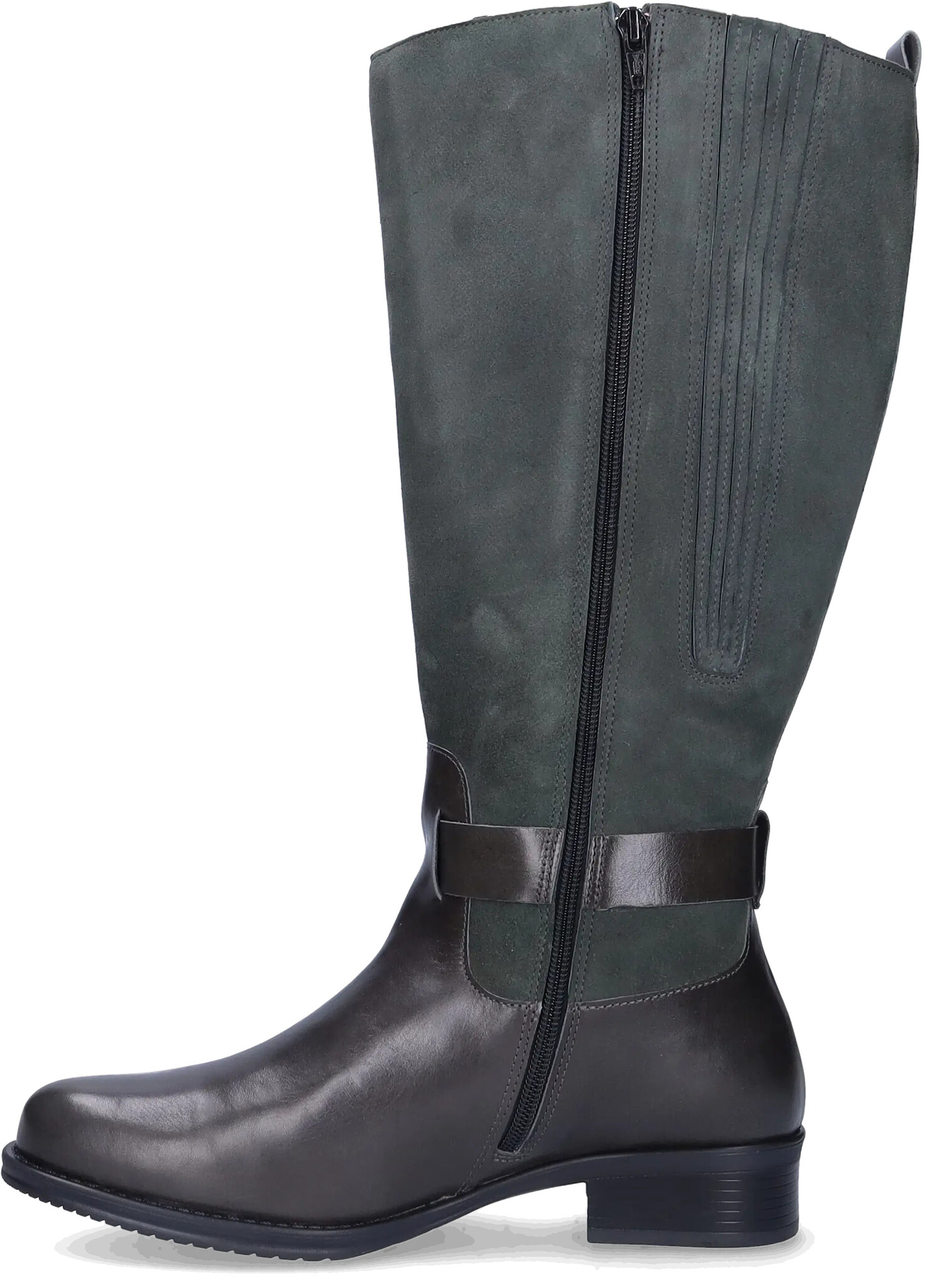 De groene Cheddar dameslaars met een extra brede schacht combineert glad leer met een suède schacht. Deze laars biedt een leren gesp rondom de enkel, een lage hak en een ritssluiting. Beschikt over een flexibele antislipzool en een verwisselbaar voetbed.