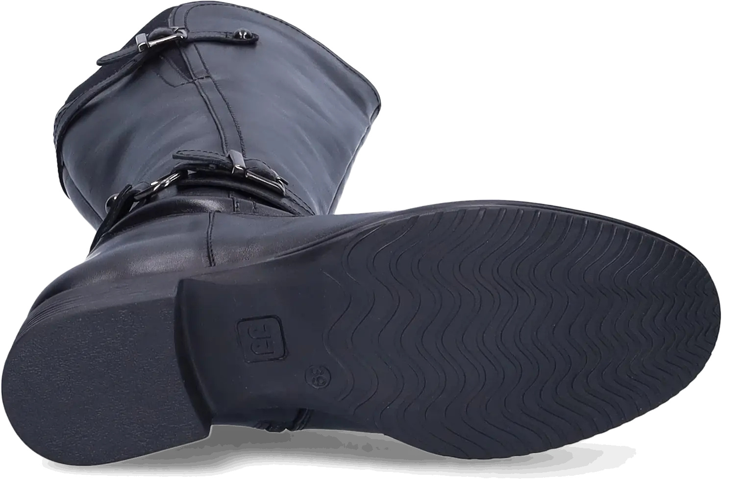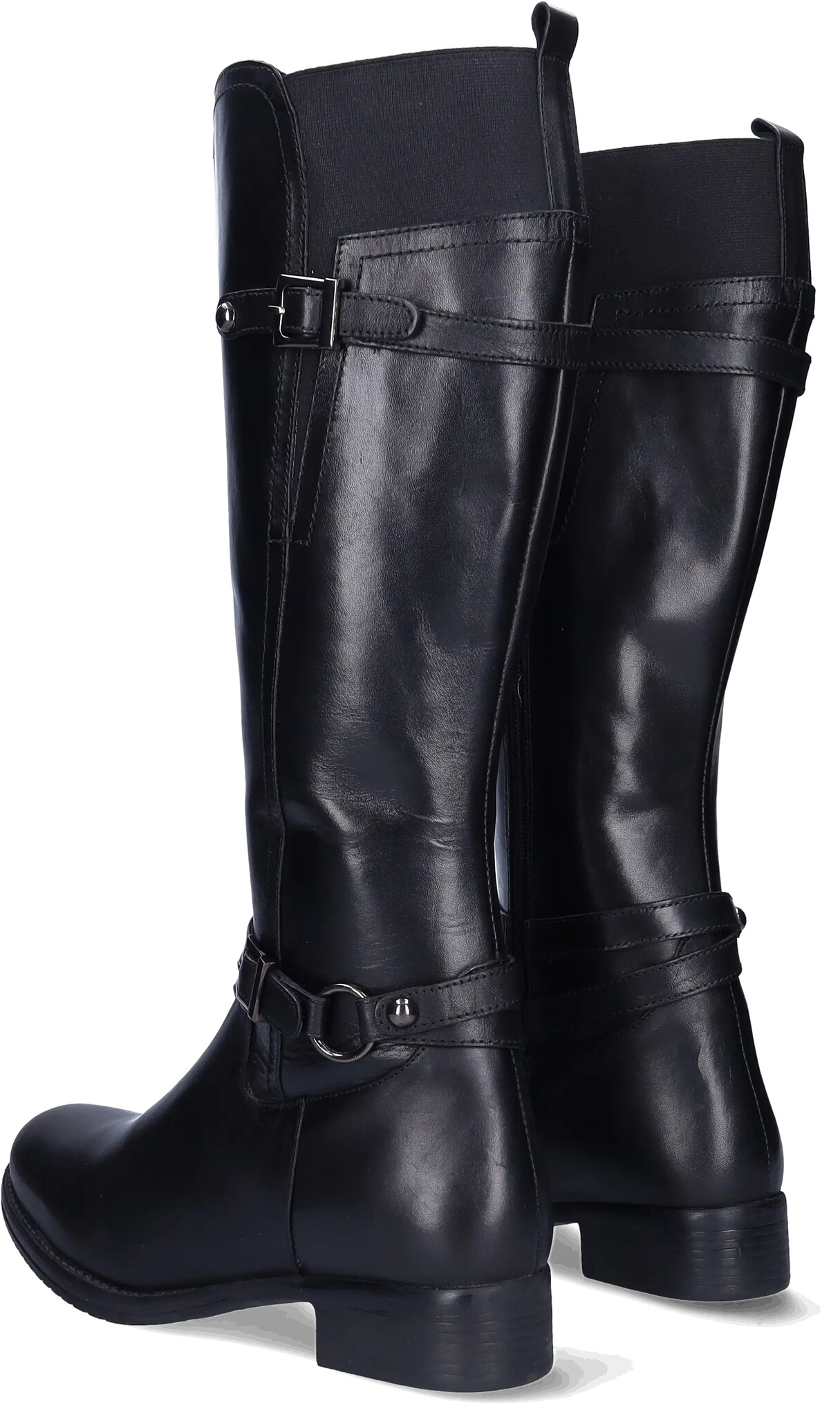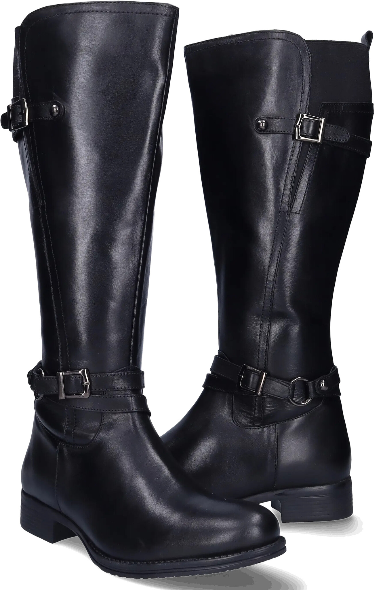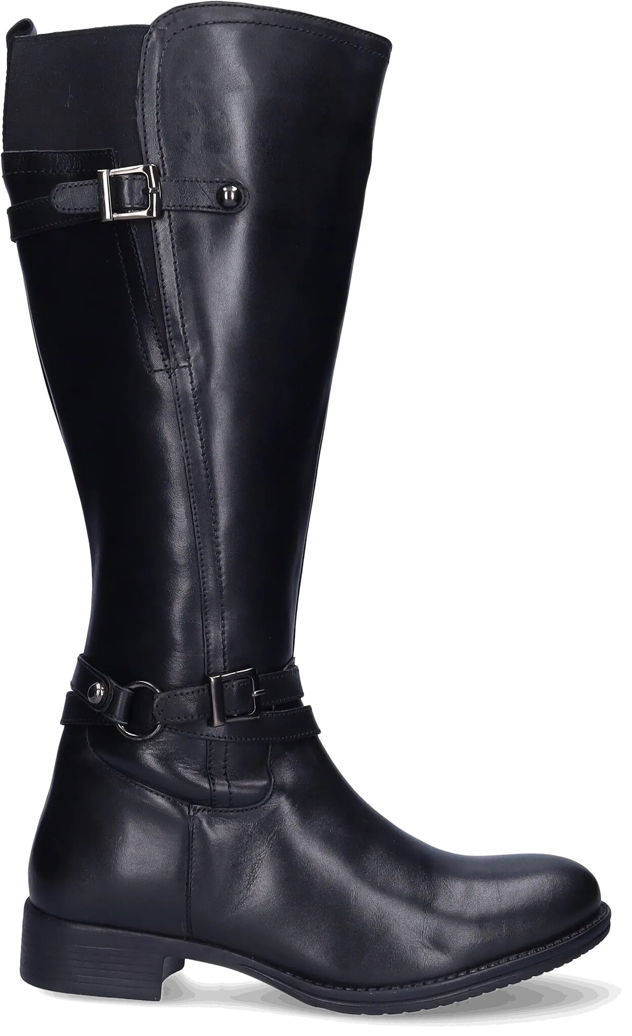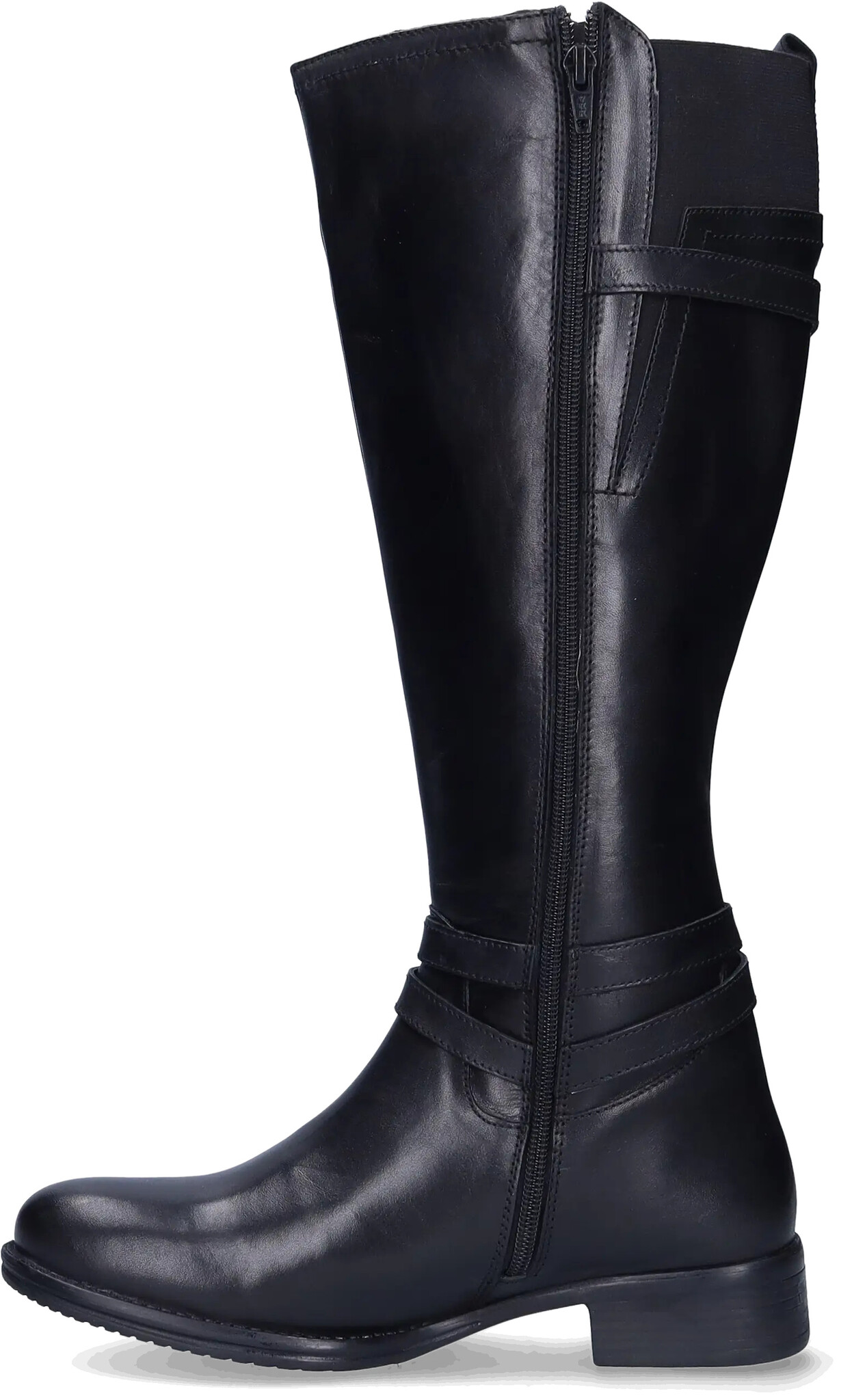 Dewsbury is een laars met brede schacht, gemaakt van rijk, zwart leer. De klassieke ruiterstijl, de lage hak, de gesp- en banddetails zorgen voor een verfijnde, tijdloze uitstraling. Het ingebouwde stretchmateriaal rondom de kuit garandeert een flexibele pasvorm op maat.