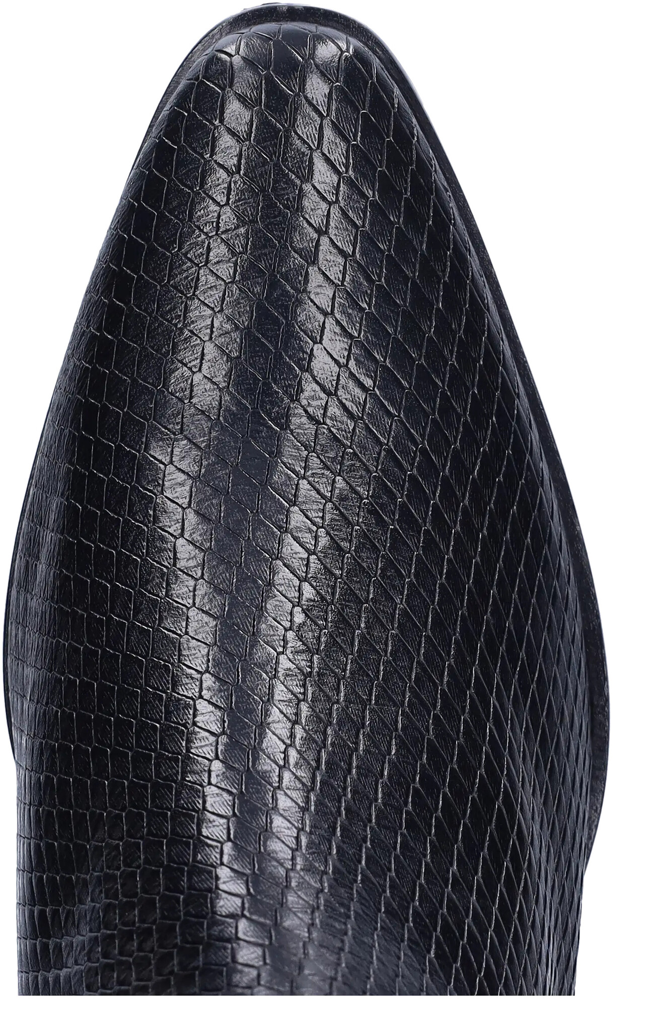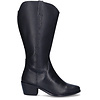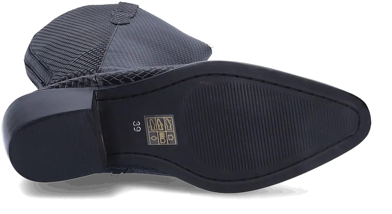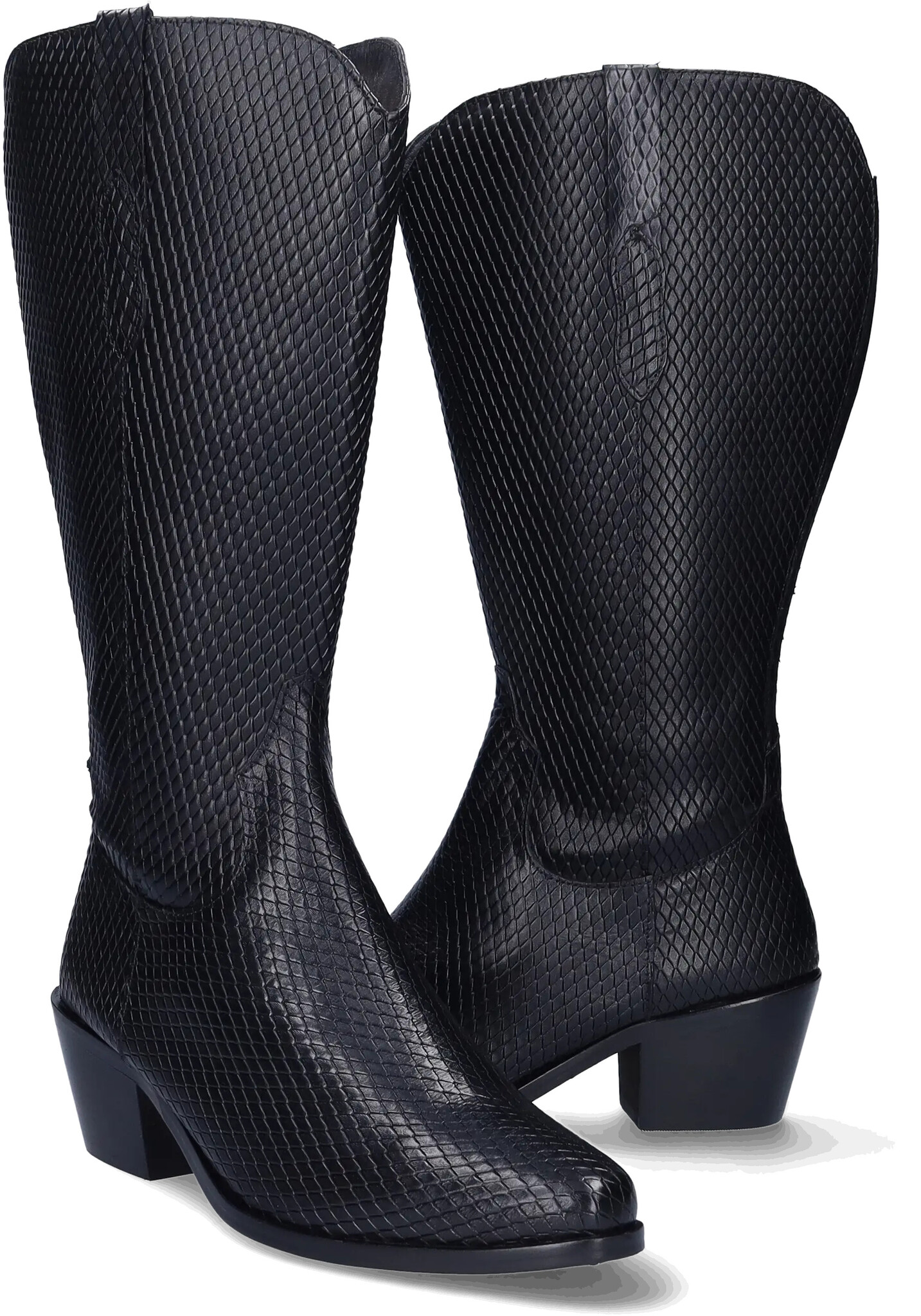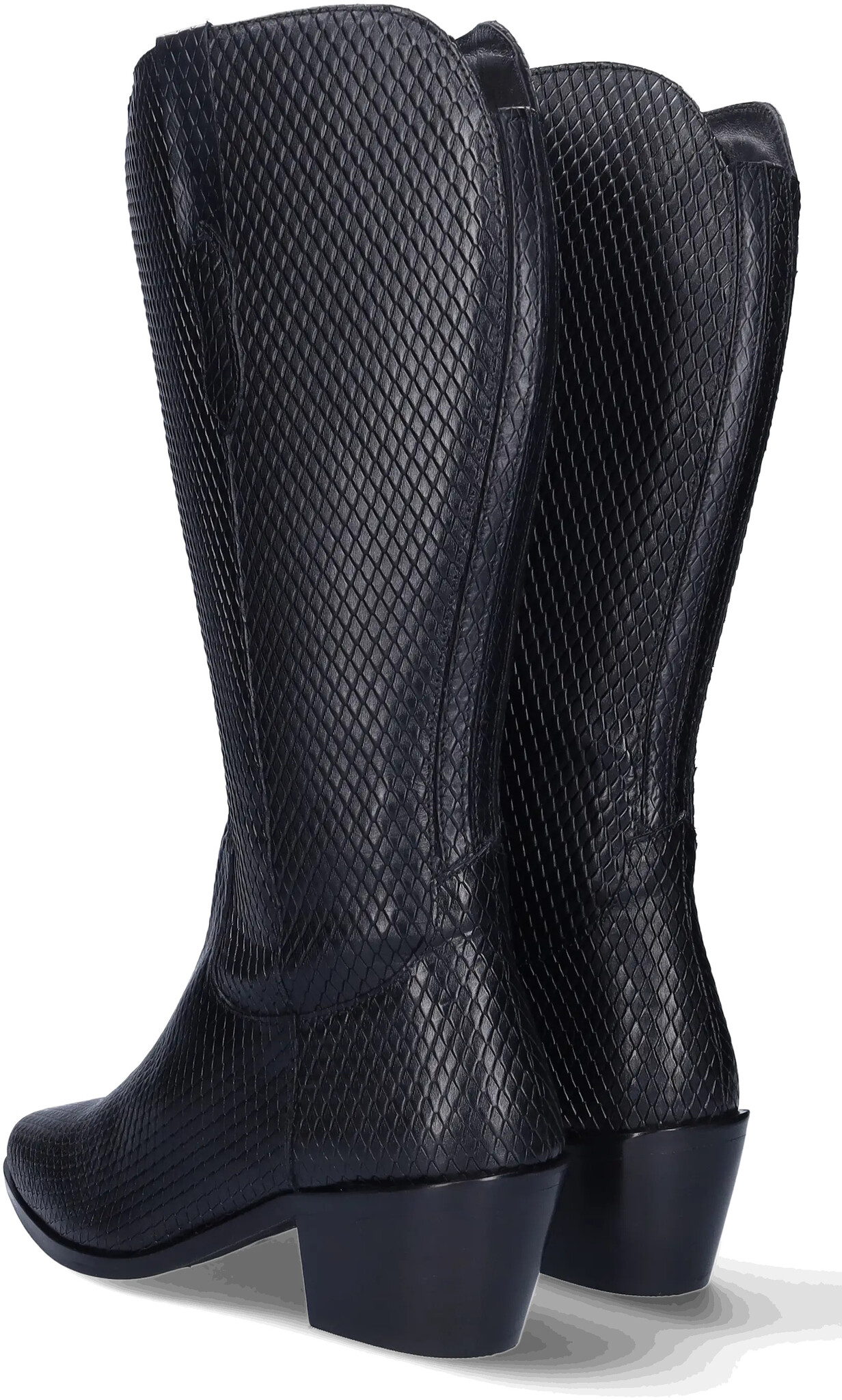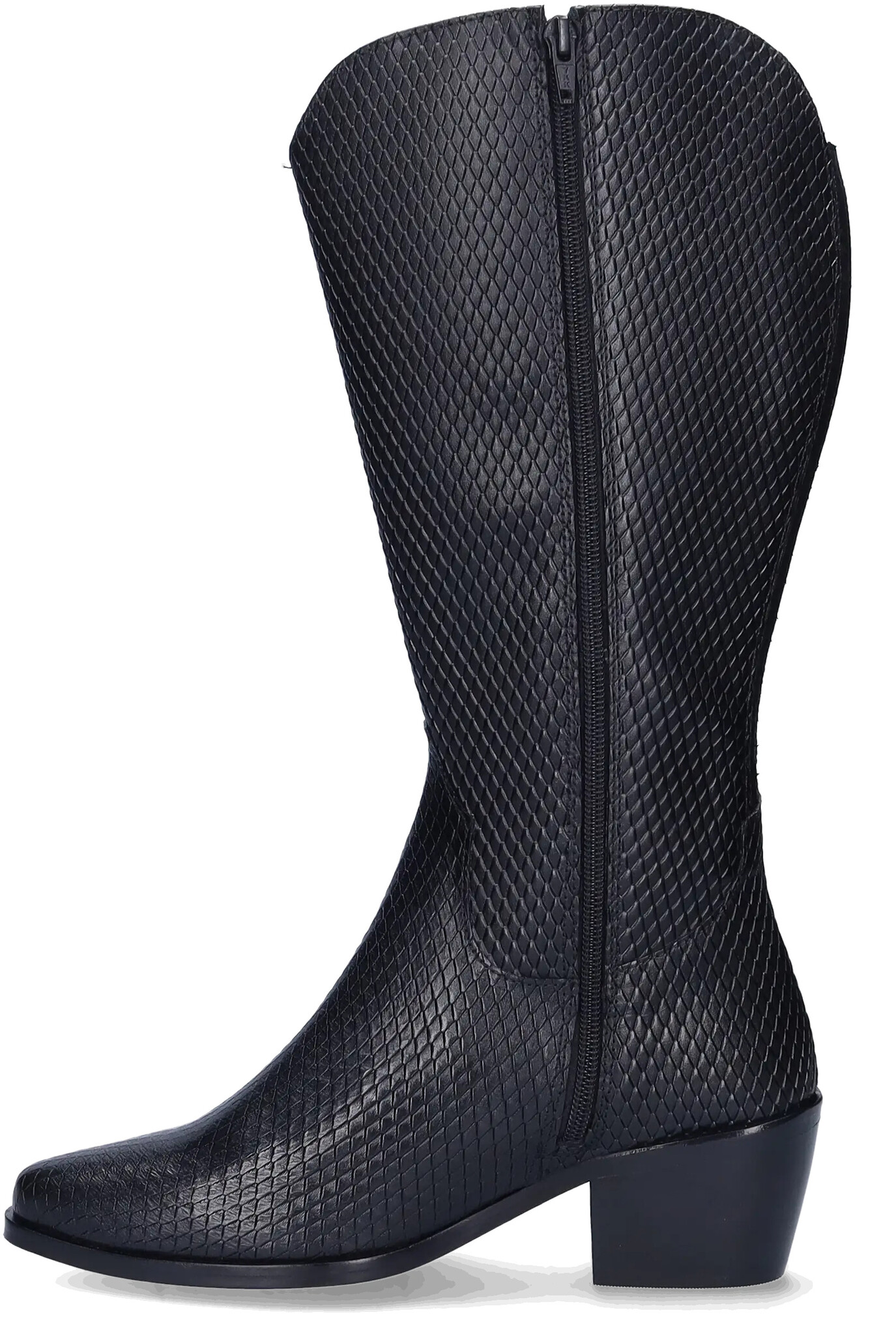 De zwartleren Ely is een laars met extra brede schacht in cowboystijl, gekenmerkt door een geruit motief over de gehele laars. Met lage hak, een ritssluiting, rubberen zool en western-kenmerken. Geschikt voor (orthopedische) inlegzolen.