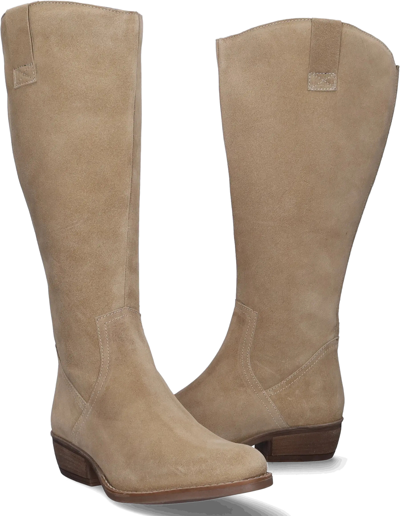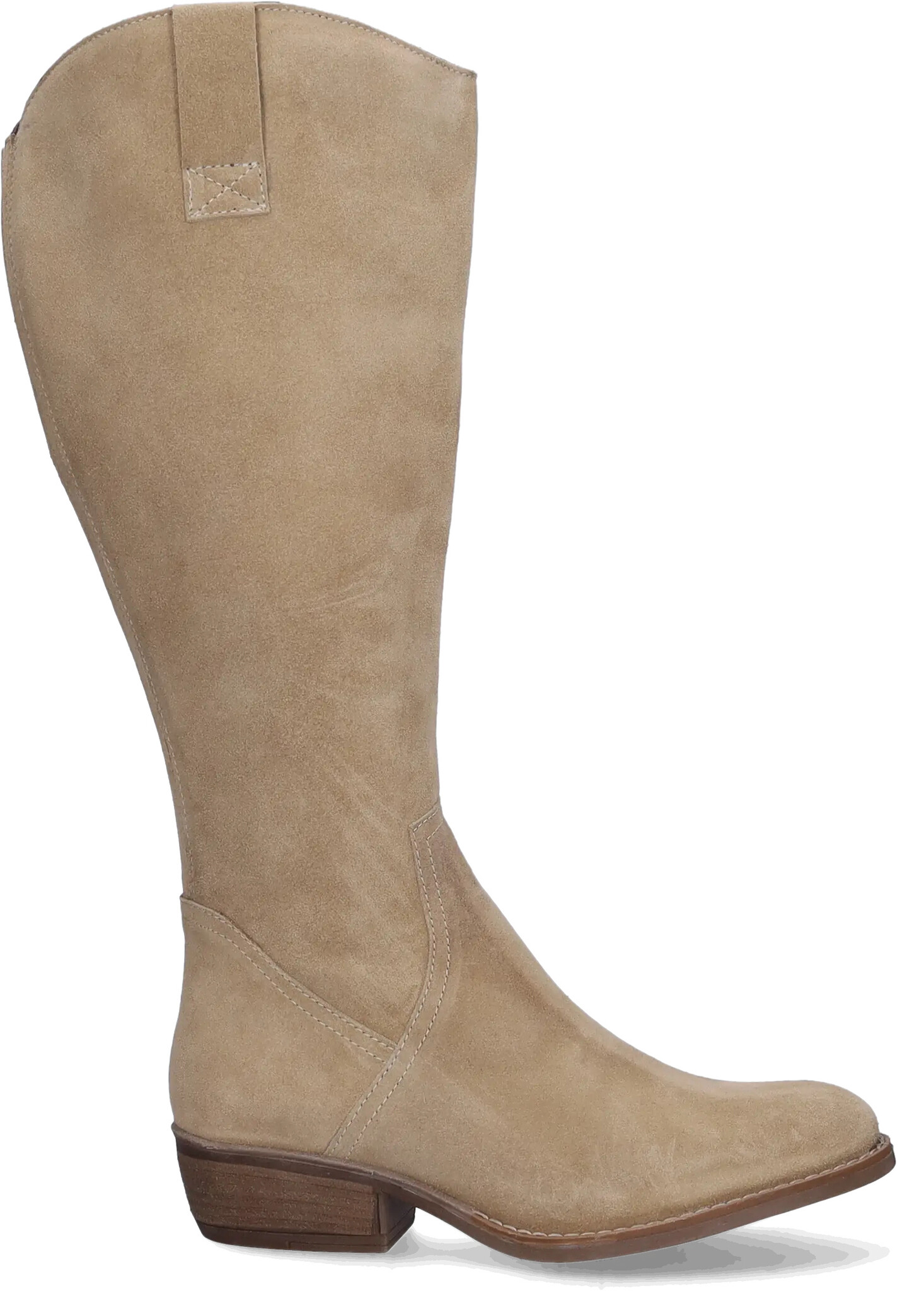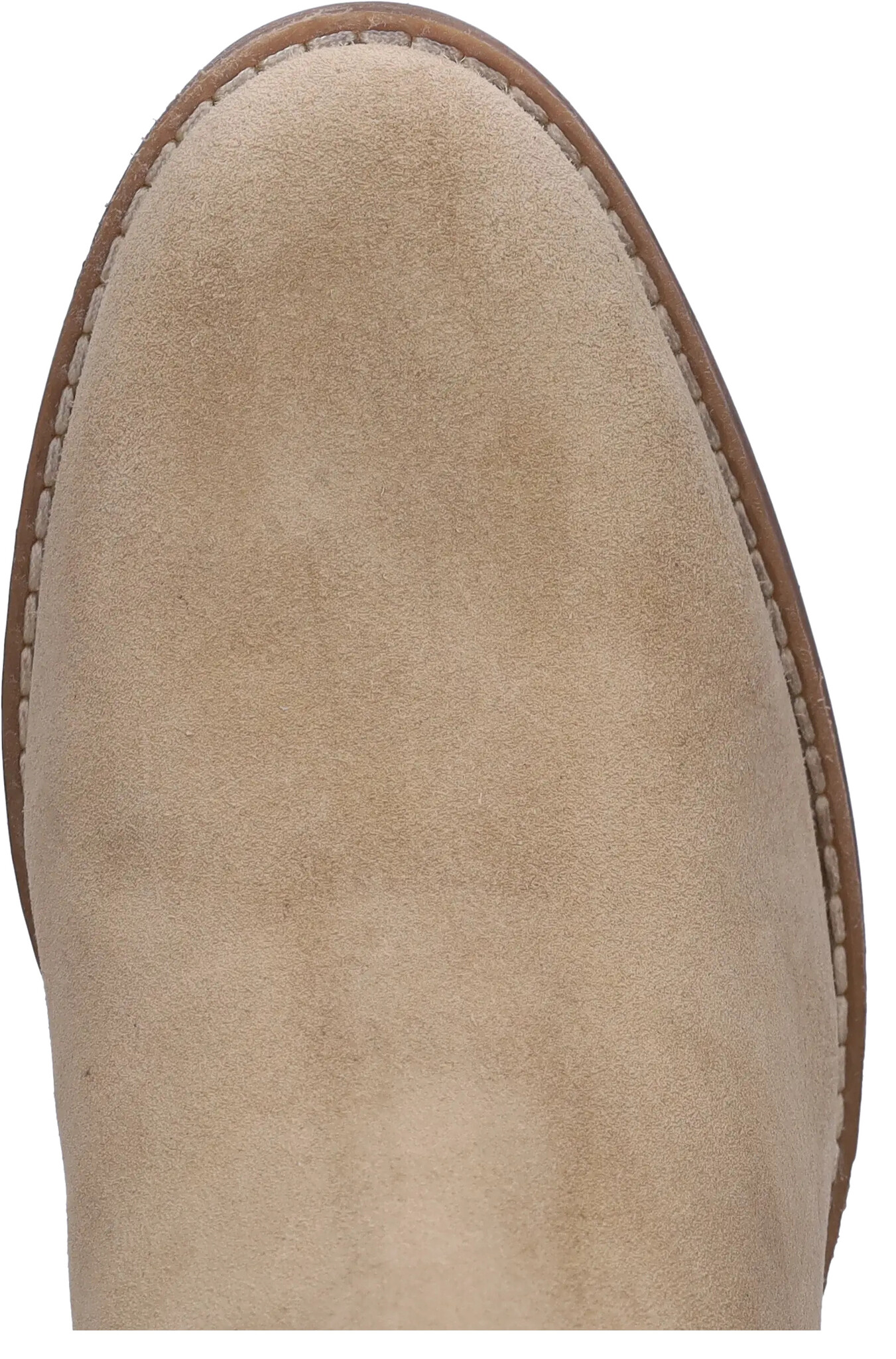 De zandkleurige variant van Ferryhill is een lichte, elegante suède cowboylaars met een extra brede schacht. Dit model is uitgerust met een Cubaanse hak, een ritssluiting aan de zijkant en een spitse neus. Geschikt voor steunzolen.