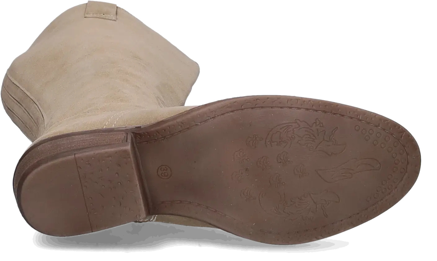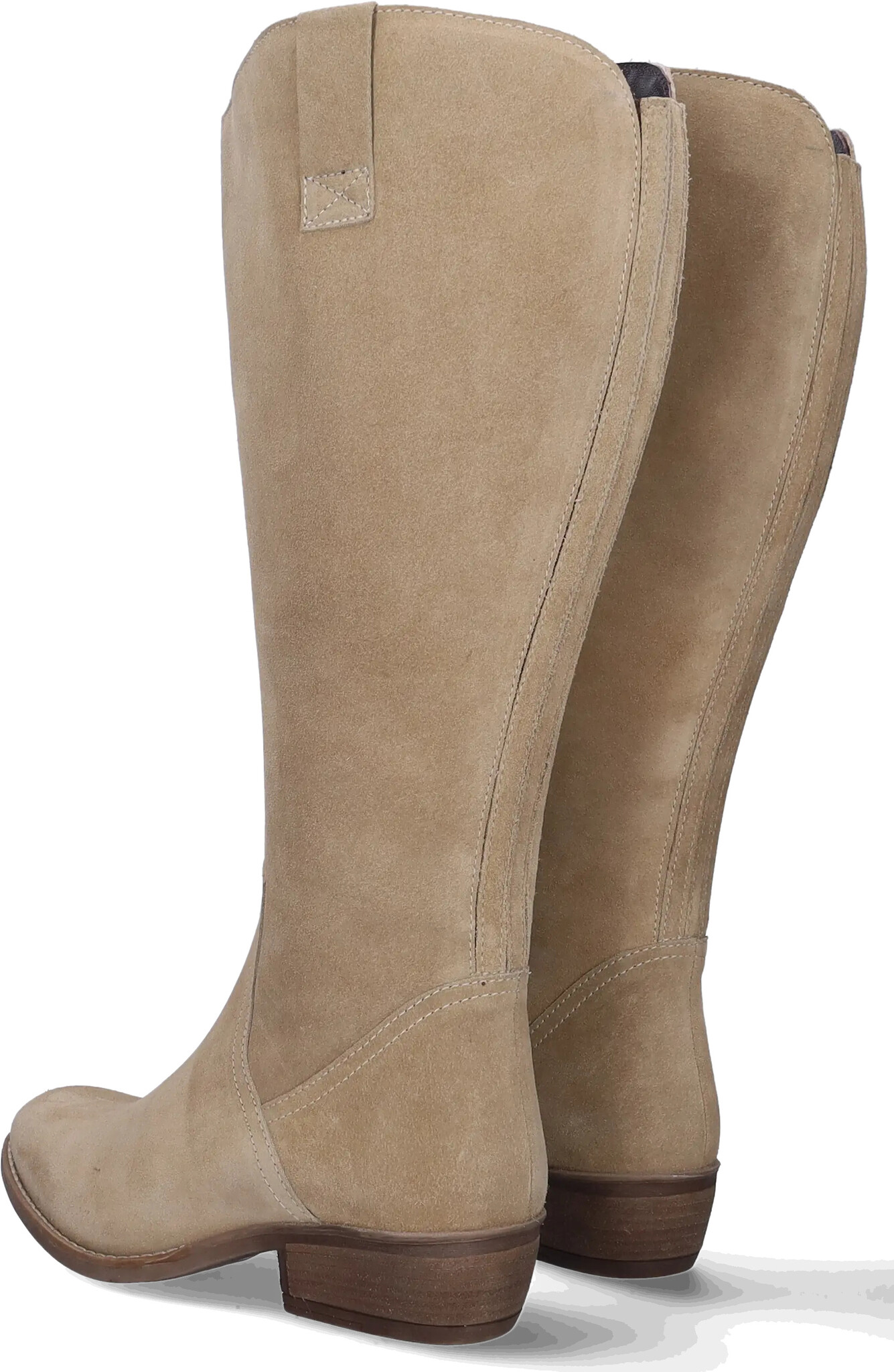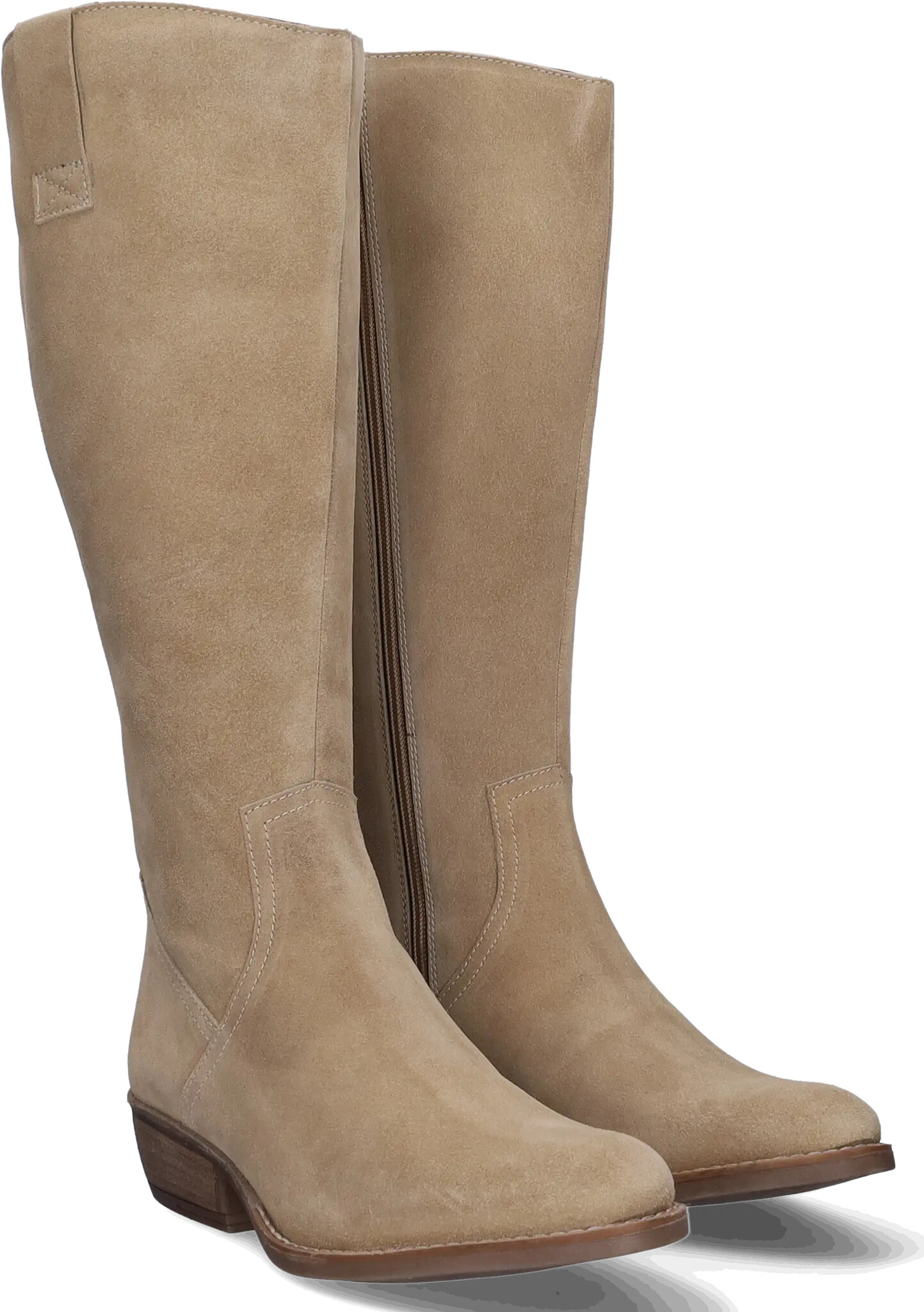 De zandkleurige variant van Ferryhill is een lichte, elegante suède cowboylaars met een extra brede schacht. Dit model is uitgerust met een Cubaanse hak, een ritssluiting aan de zijkant en een spitse neus. Geschikt voor steunzolen.