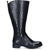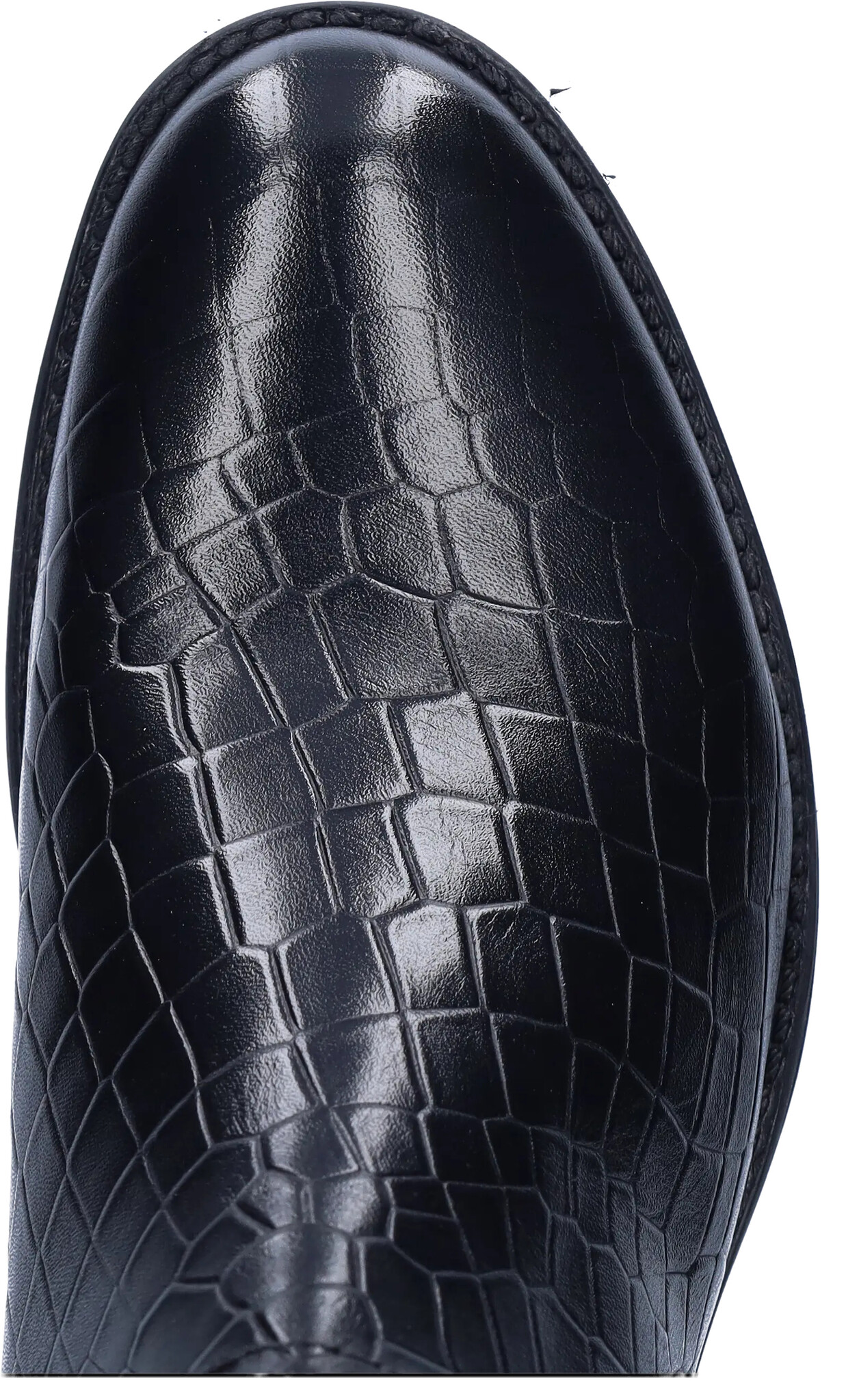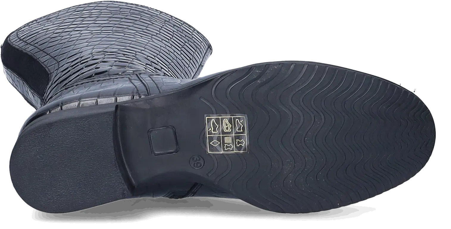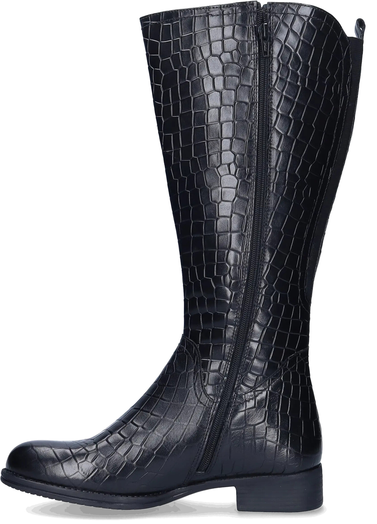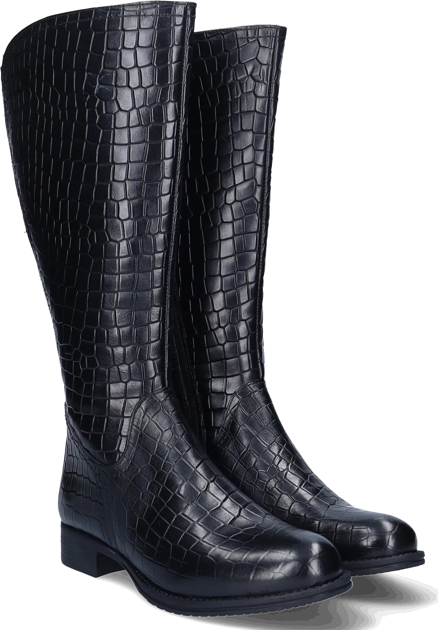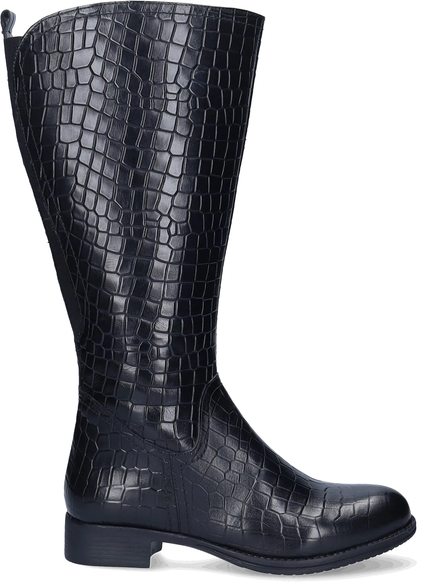 De zwartlederen Flensburg is een extra brede schacht laars met een krokodillenprint, subtiele lage hak en een ritssluiting aan de zijkant. Beschikt over een flexibele antislip zool met uitneembare inlegzolen. Geschikt voor steunzolen.