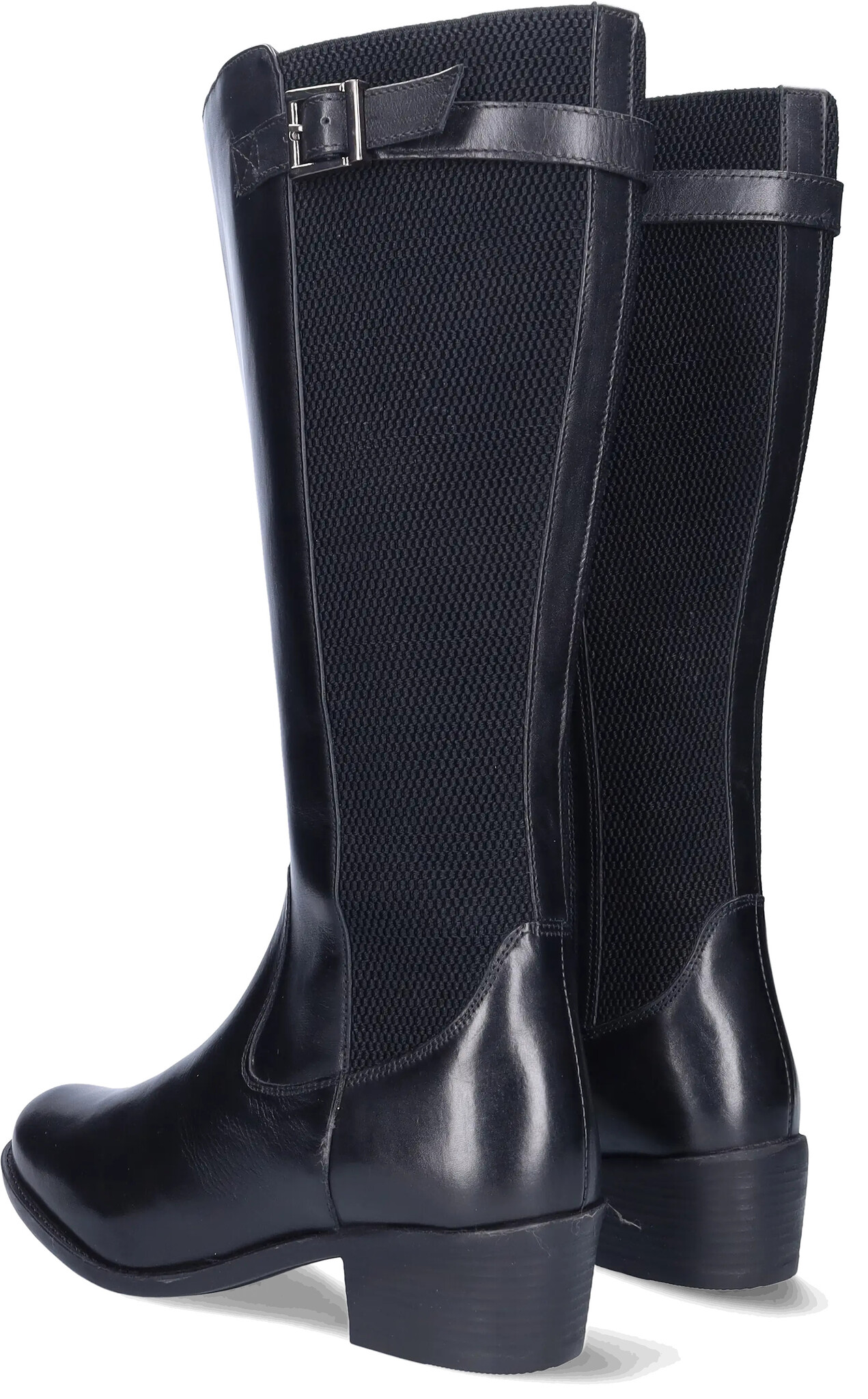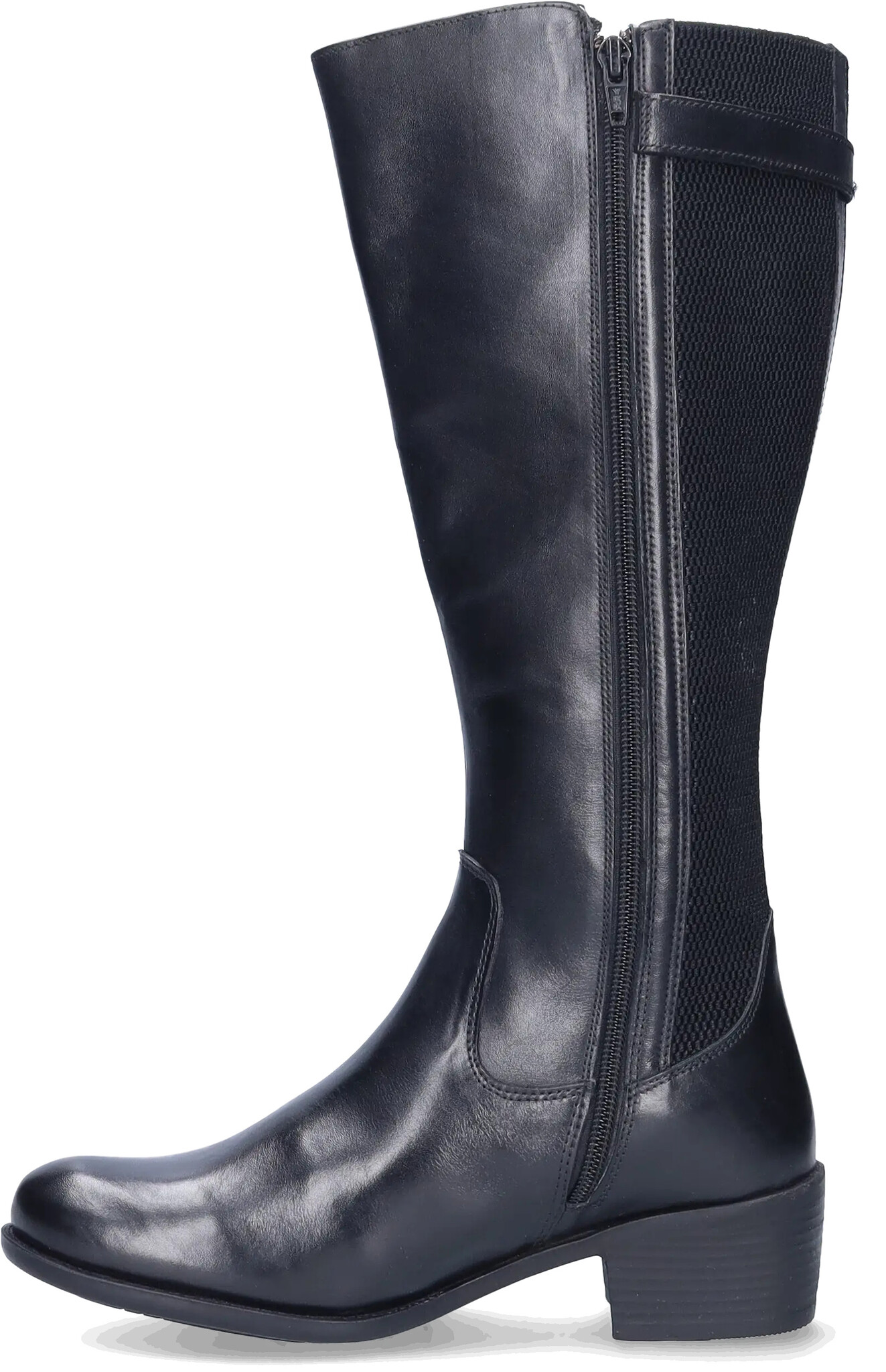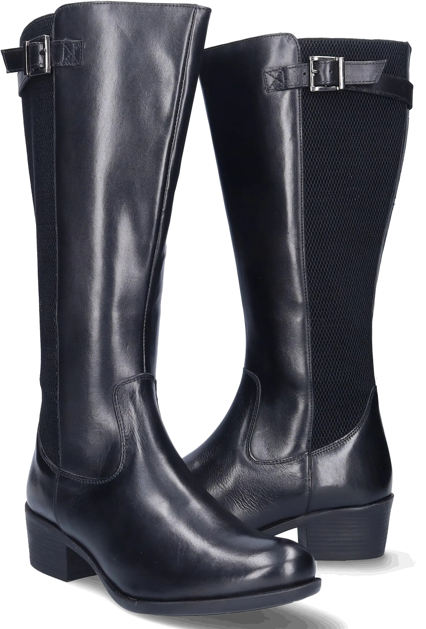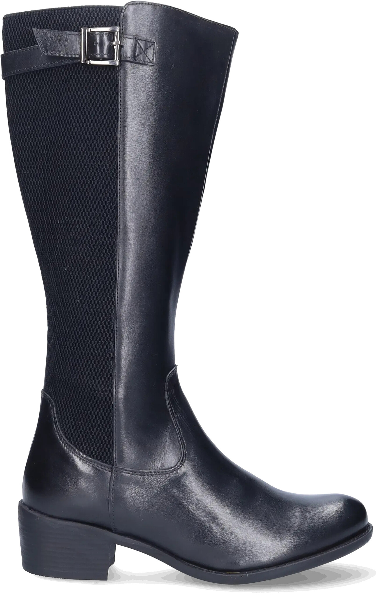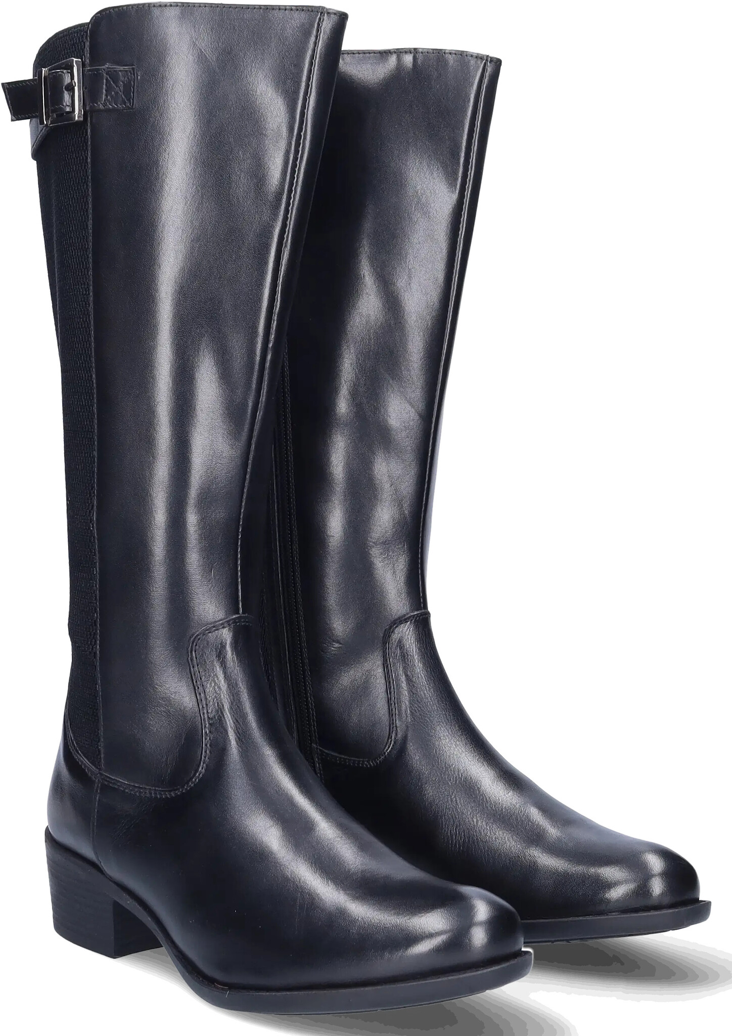 Reute is een elegante, hoogwaardig zwartleren extra brede schacht laars, met een comfortabele hoge hak. Beschikt over een kenmerkende gesp aan de bovenzijde en ritssluiting voor gemakkelijk aan- en uittrekken. Geschikt voor steunzolen.